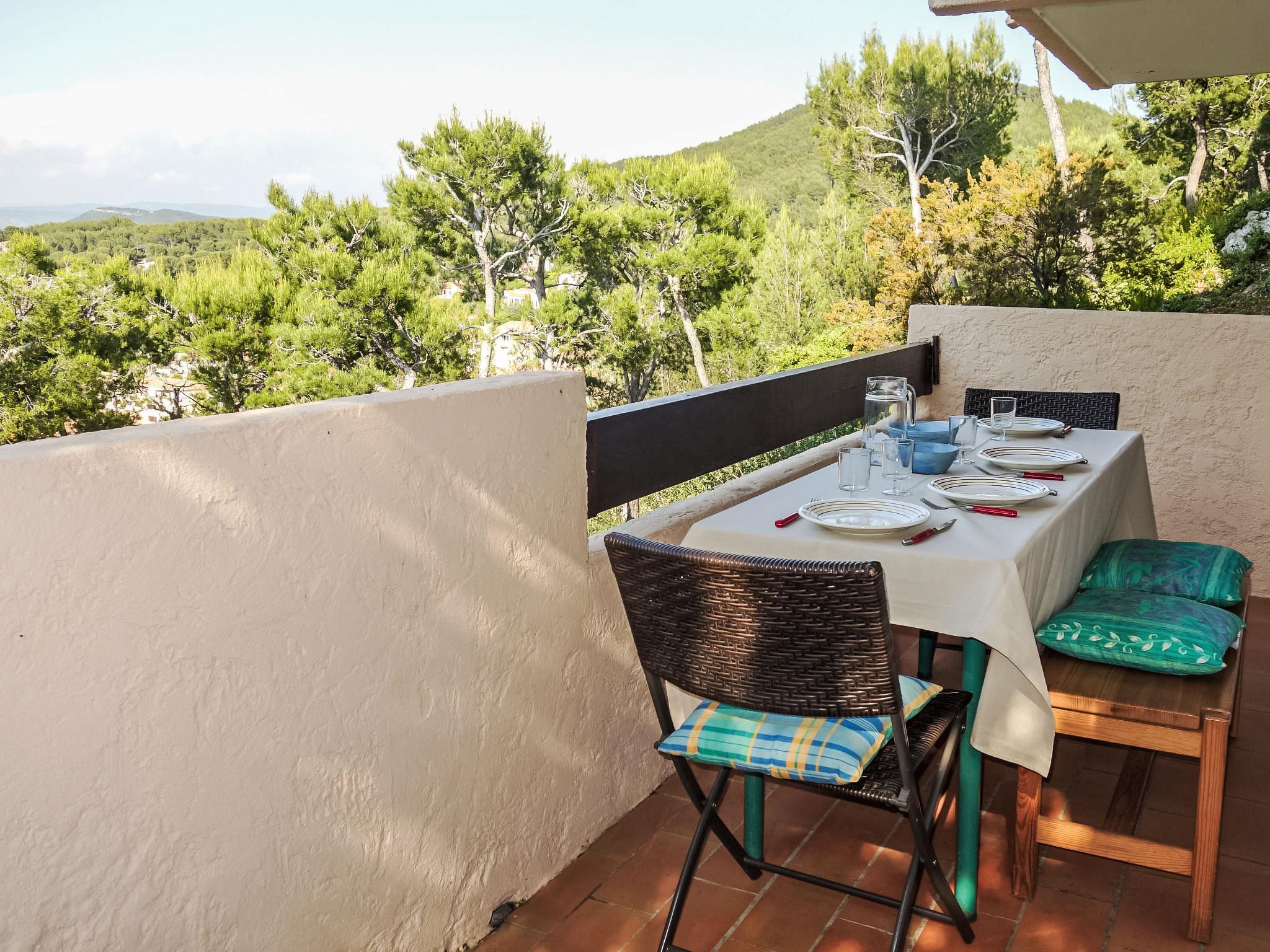 2-room apartment 31 m2 on 1st floor. Bright, comfortable furnishings: living/dining room with 1 pull-out bed (2 pers. 2 x 80 cm, length 190 cm), TV (flat screen). Exit to the terrace. 1 room with 2 beds (80 cm, length 190 cm). Kitchen (mini-oven, 2 ceramic glass hob hotplates, toaster, kettle, microwave, freezer, electric coffee machine). Exit to the terrace. Shower/WC. Electric heating. Terrace 12 m2, roofed, north facing position. Terrace furniture. View of the sea. Facilities: Internet (WiFi, extra). Please note: maximum 1 pet/ dog allowed. TV only FR. Smoke alarm. Residence is located on a hillside. Access to the property is via 43 steps. 83112 000260 0Q