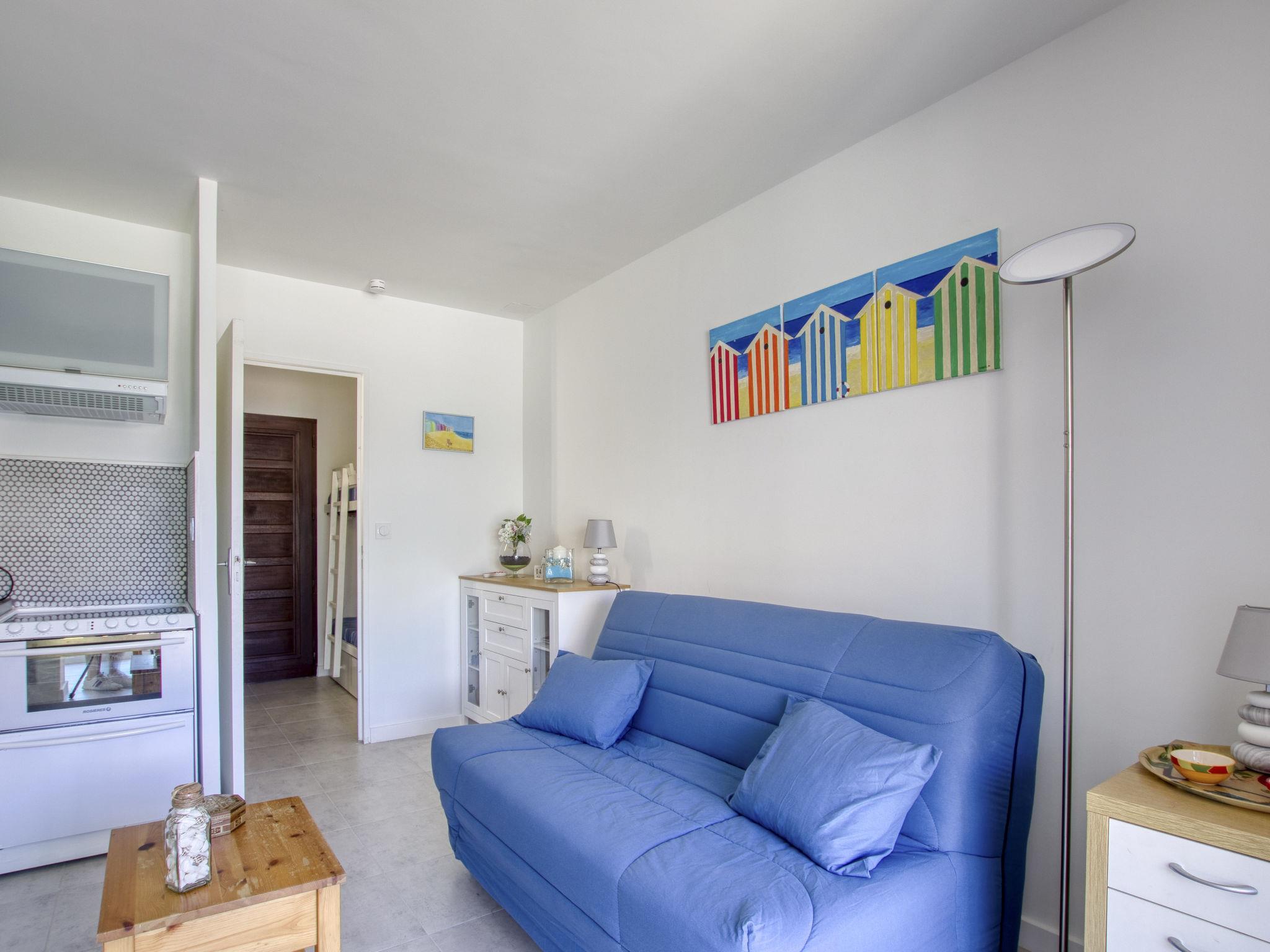 1-room studio 27 m2, on the upper ground floor. Fully renovated in 2023, comfortable and beautiful furnishings: entrance hall, without window with 1 x 2 bunk beds (70 cm, length 190 cm). Living/dining room with 1 double sofabed (160 cm, length 190 cm), TV (flat screen). Exit to the terrace. Kitchenette (mini-oven, dishwasher, 4 ceramic glass hob hotplates, toaster, kettle, electric coffee machine). Shower/WC. Electric heating. Terrace 16 m2. Terrace furniture, electric barbecue. Facilities: washing machine. Internet (WiFi, extra). Parking space n 46. Please note: non-smokers only. TV only FR. Smoke alarm. Offer by a private individual according to Art. 155, IV of CGI. 8311200132312