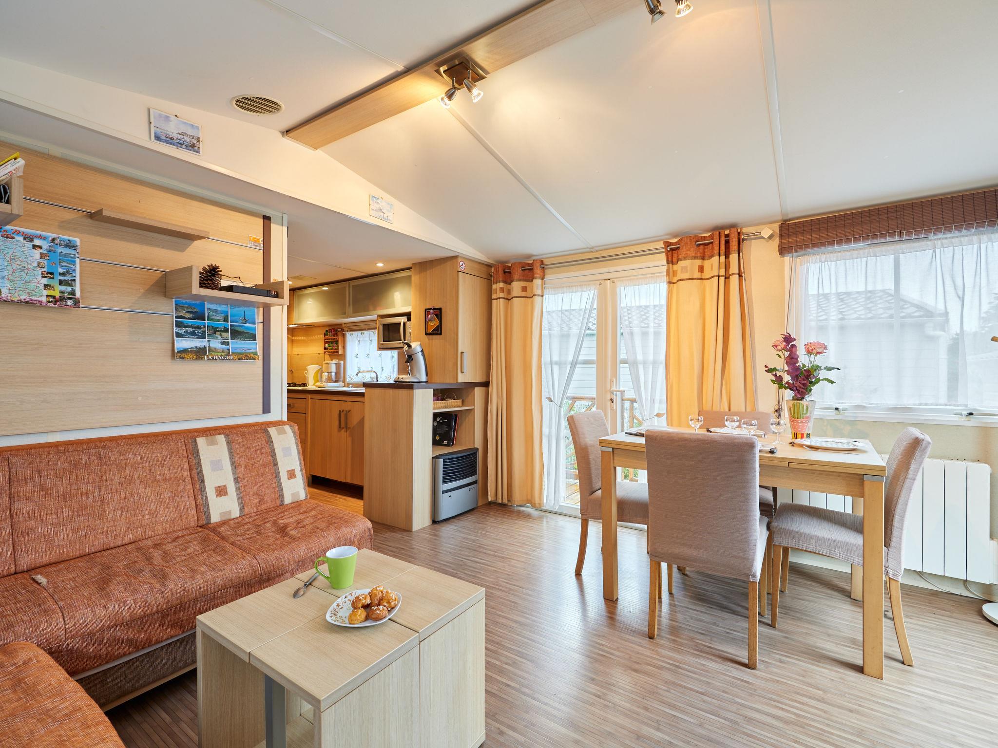 "Rêves & Sérénité", 3-room mobile home 40 m2. Comfortable and cosy furnishings: living/dining room 15 m2 with TV (flat screen). 1 room with 1 french bed (140 cm, length 190 cm). 1 room with 2 beds (80 cm, length 190 cm) with separate WC. Exit to the terrace. Large, open kitchen (oven, 4 gas rings, toaster, kettle, microwave, electric coffee machine, Capsules for coffee machine (Senseo)). Shower. Electric heating. Facilities: washing machine, dryer, hair dryer. Internet (WiFi, free). Parking (fenced 2 cars). Please note: non-smoking house. Maximum 1 pet/ dog allowed. Smoke alarm. Offer by a private individual according to Art. 155, IV of CGI.
