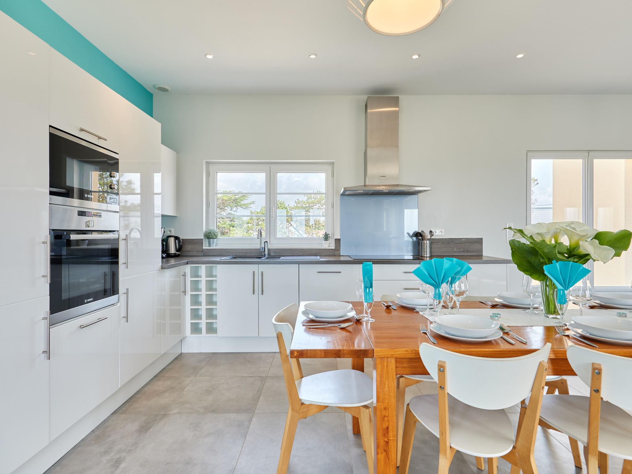 "La Surprise", 4-room house 120 m2 on 2 levels. Comfortable and beautiful furnishings: living/dining room with TV (flat screen). Open kitchen (oven, dishwasher, 1 induction hot plates, 4 gas rings, toaster, kettle, microwave, electric coffee machine, Capsules for coffee machine (Dolce gusto)). Exit to the terrace. Sep. WC. Electric heating, floor heating. Upper floor: 2 rooms, each room with 1 french bed (1 x 140 cm, length 190 cm), shower. 1 room with 1 x 2 bunk beds (90 cm, length 190 cm), 1 double bed (140 cm, length 190 cm), shower with separate WC. Terrace. Terrace furniture, barbecue, deck chairs. Marvellous view of the sea. Facilities: washing machine, dryer. Internet (WiFi). Please note: smoke alarm. Offer by a private individual according to Art. 155, IV of CGI.