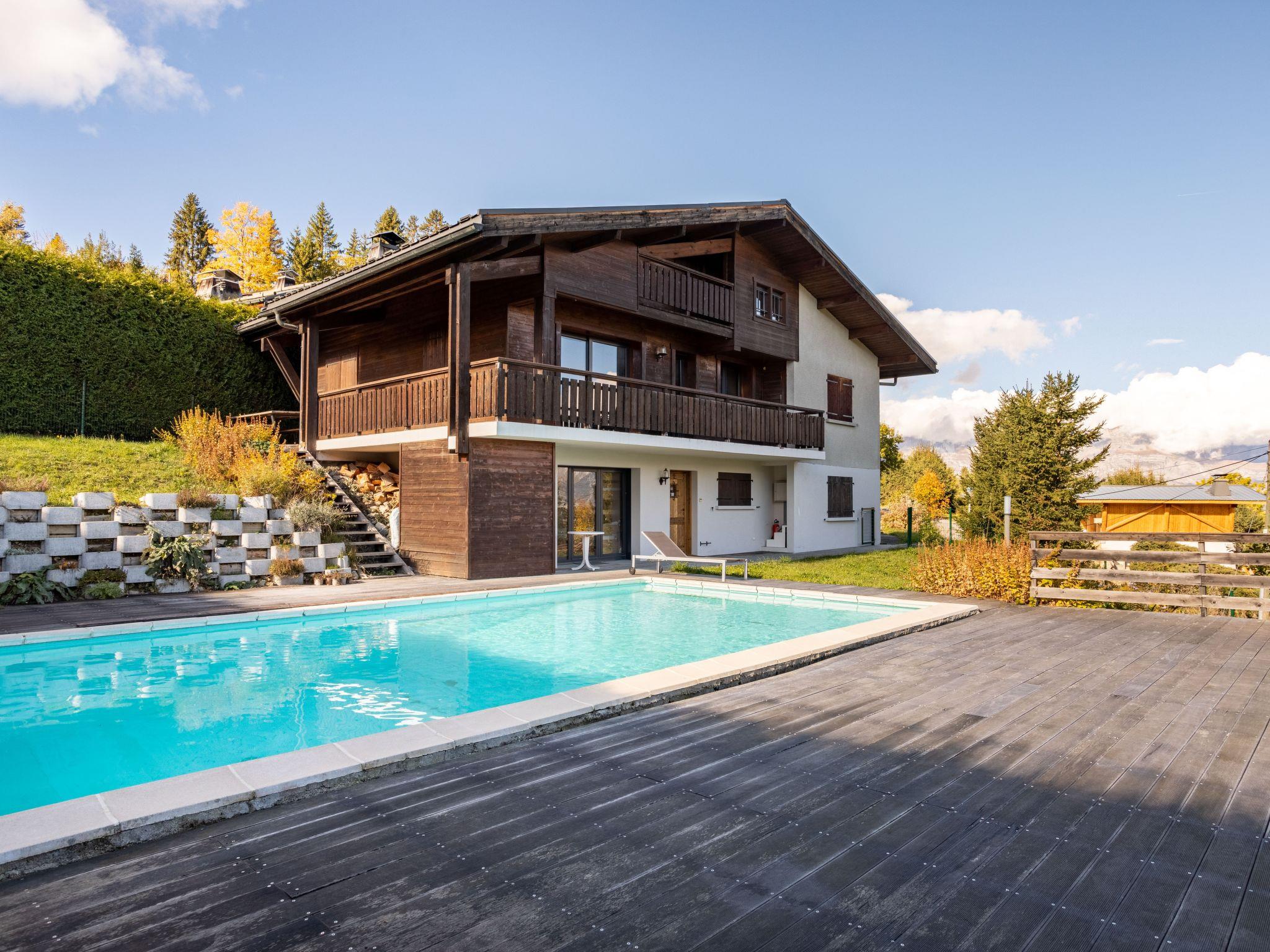 Large, modern single-family house "L'Adret", 2 storeys, renovated in 2021. Above Saint-Gervais les Bains, in the district of Cupelin, 7.2 km from the centre, in a quiet position, 1.2 km from the skiing area. Private: property, swimming pool angular, heated (10 x 5 m, depth 120 - 220 cm, seasonal availability: 01.Jul. - 15.Sep.). In the house: storage room for skis. In Winter: please take snow chains. Parking (for 3 cars). Grocery 650 m, restaurant 1.3 km, bus stop "Pierre Plate (en Hiver)" 250 m, indoor swimming pool 8.5 km, thermal baths "Les Thermes de Saint-Gervais" 11 km. Gondola lift 1.2 km, slopes 250 m. Well-known ski regions can easily be reached: Evasion Mont Blanc 1.2 km. Please note: car recommended.
