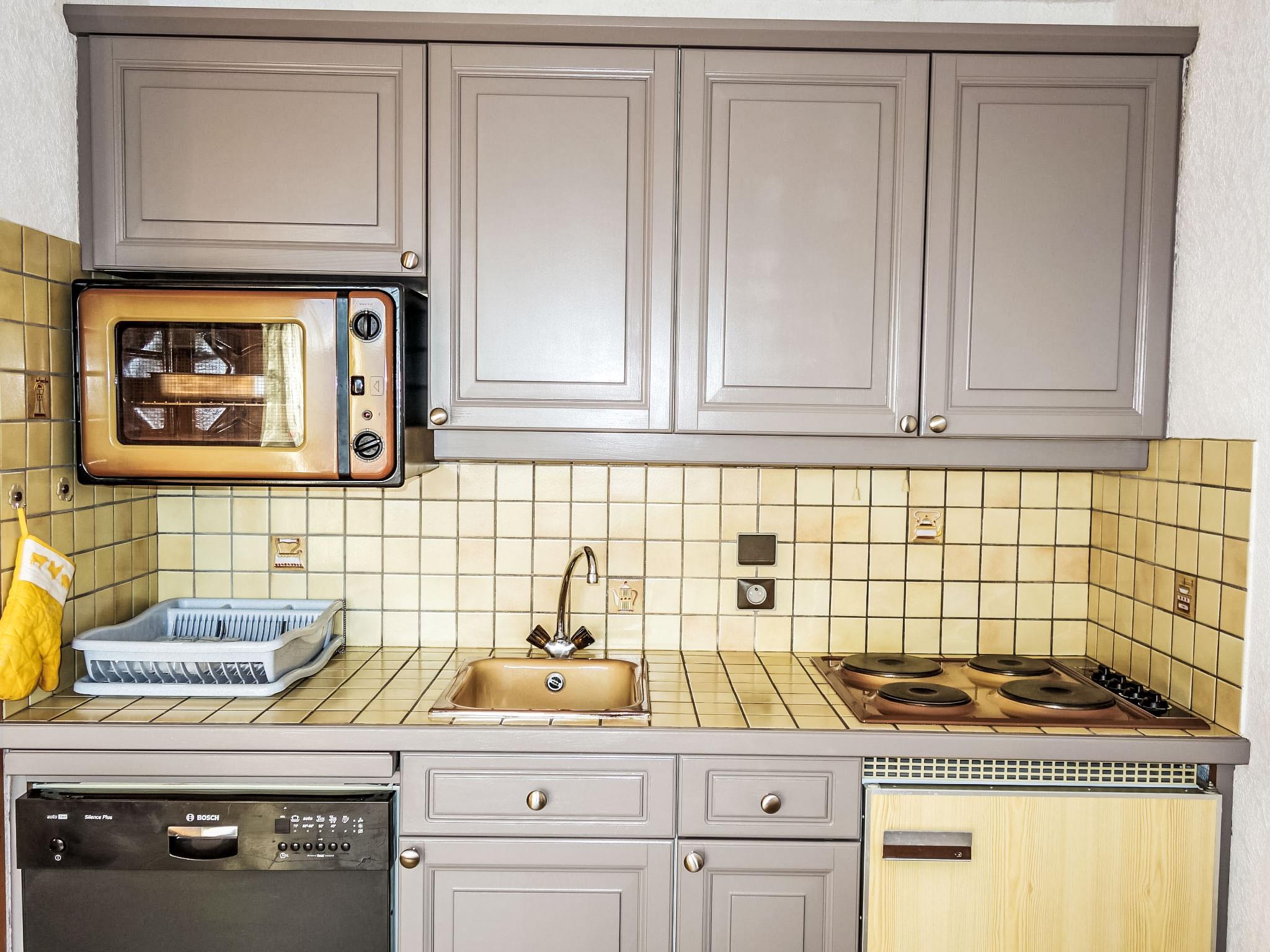 "La pointe des Aravis 4", 1-room studio 23 m2 on 3rd floor. Living/dining room with 1 double sofabed (135 cm), TV and flat screen. Exit to the balcony. Entrance hall with 1 x 2 bunk beds (90 cm). Kitchenette (oven, dishwasher, toaster, kettle, electric coffee machine). Bathroom, sep. WC. Electric heating. Balcony, west facing position. Beautiful view of the mountains and the valley. Facilities: washing machine. Internet (WiFi, extra). Parking. Please note: non-smokers only. TV only FR. Smoke alarm, no lift.