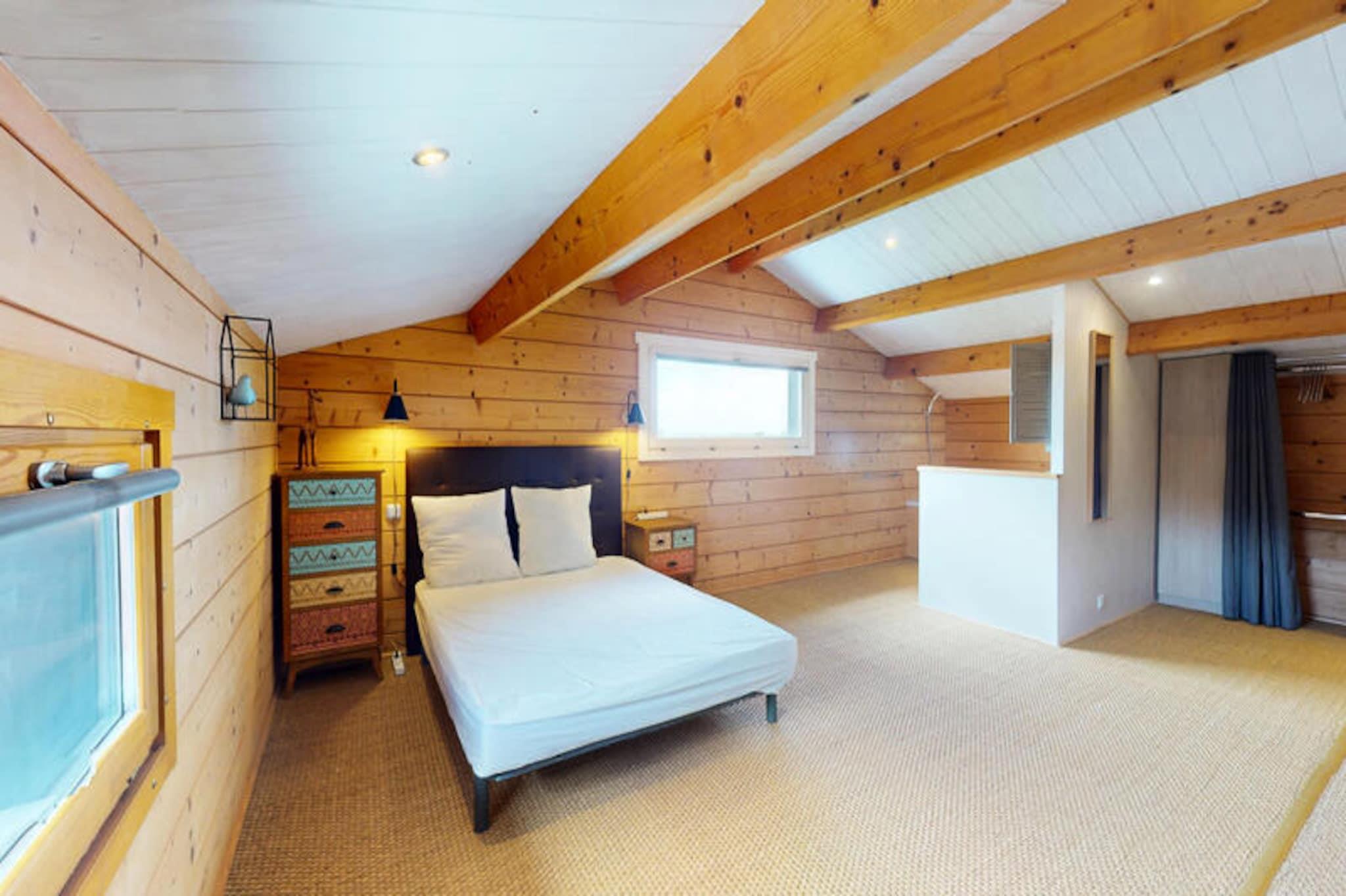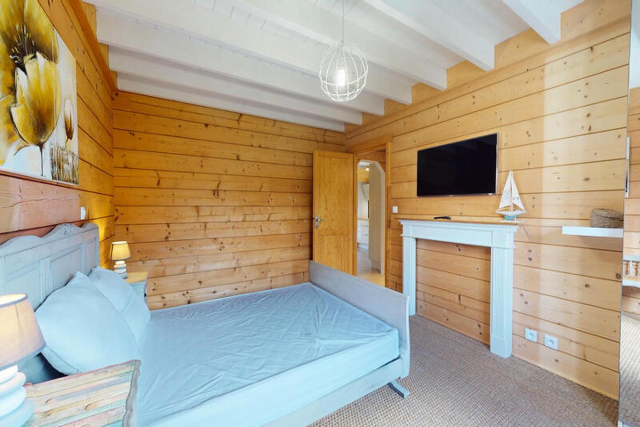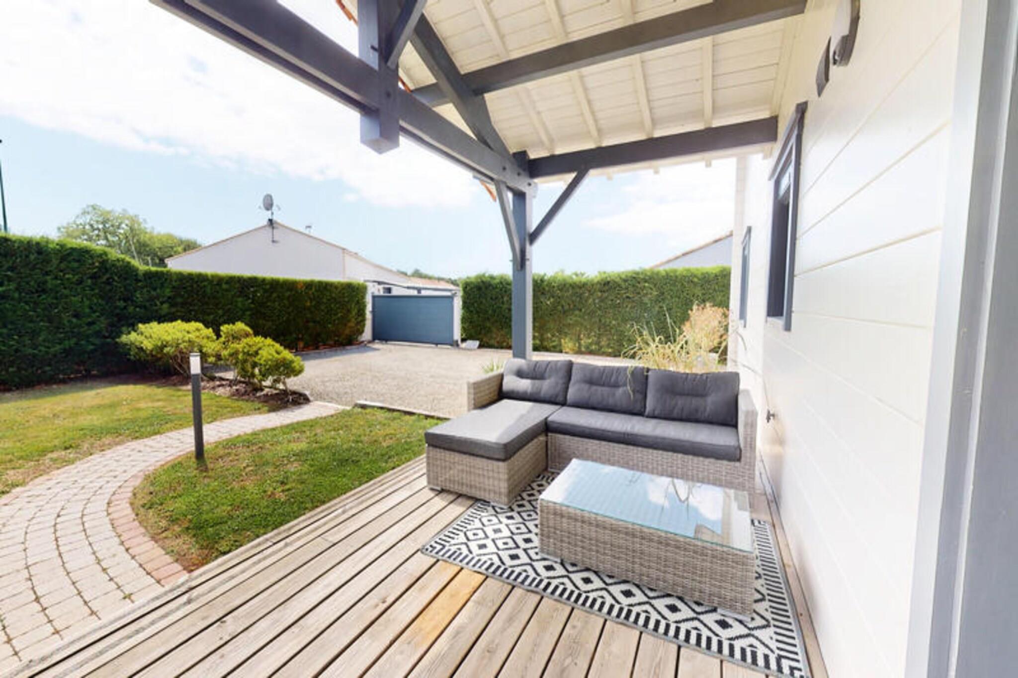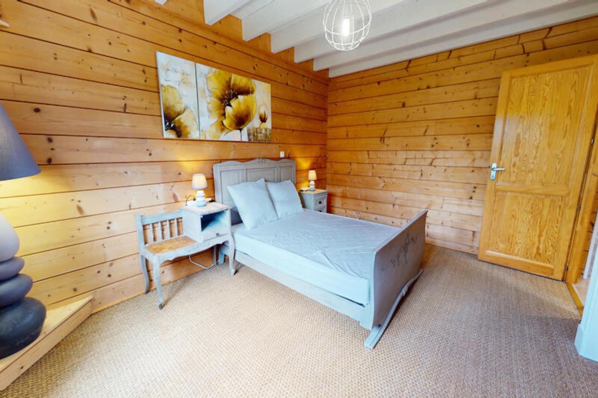 I den fredfyldte by Saint-Maixent-sur-Vie, hvor landlig charme møder havbrise, tilbyder dette fortryllende træhus en unik flugt i Vendée-regionen. Blot 10 minutter fra de gyldne strande i Saint-Gilles-Croix-de-Vie inviterer dette feriehus dig til at slappe af i rolige omgivelser omgivet af natur. Forestil dig morgener fyldt med fuglesang, eftermiddage med at udforske den nærliggende kystlinje og aftener tilbragt under stjernerne i privatlivet af din egen skovklædte have. Her skaber enkelhed og varme den perfekte atmosfære for familie eller venner til at genoprette forbindelsen og genoplade. \n\nTræd indenfor for at opdage en rummelig stue med lofter i katedralstil, der udstråler en hyggelig atmosfære med sine træpaneler på væggene. Det åbne køkken er fuldt udstyret med moderne apparater, herunder køleskab, opvaskemaskine og ovn, hvilket sikrer ubesværet madlavning. Stueetagen har to indbydende soveværelser - en dobbeltseng og to enkeltsenge - samt et brusebad. Ovenpå kan den store mezzanin prale af endnu en dobbeltseng og et åbent badeværelse, der tilbyder et fredeligt tilflugtssted. Med fjernsyn i alle værelser og et hi-fi-system er komfort og underholdning lige ved hånden. \n\nUdenfor er den 600 m² store private have et paradis for afslapning og sjov. En overdækket terrasse med havemøbler, en grill til sommergrillning og en legeplads gør den ideel til udendørs sammenkomster. Uanset om du nyder et måltid under åben himmel eller ser de små lege, er haven et sted at skabe varige minder. \n\nBeliggenheden er uovertruffen: kun få minutter fra Saint-Gilles-Croix-de-Vies pulserende fiskerihavn og sandstrande, 20 minutter fra Bretignolles-sur-Mers surfing-hotspots og 25 minutter fra Saint-Jean-de-Monts. Udforsk lokale markeder fyldt med frisk fisk og skaldyr, oste og Vendée-vine, eller tag på naturskønne cykelture langs Vie-floden. Med forlystelsesparker, vandsport og familievenlige aktiviteter i nærheden byder hver dag på noget nyt at opdage. \n\nGenoplev naturen, omfavn kystlivsstilen og oplev charmen ved denne træhytte – en sand perle i hjertet af Vendée.