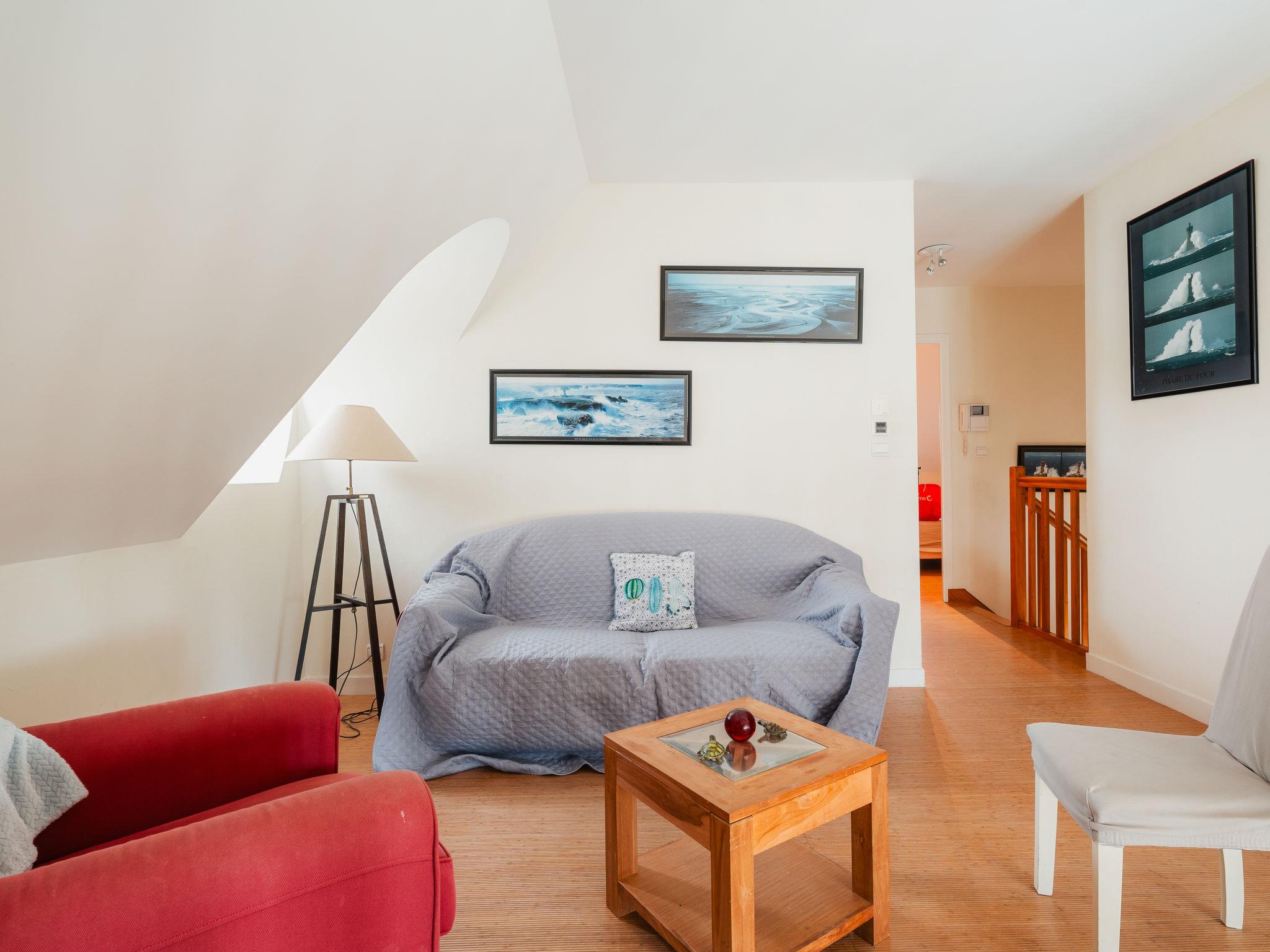 "Le Décollé", 6-room apartment 120 m2 on 2 levels on 3rd floor. Living room with TV (flat screen). Exit to the balcony, north-west facing position. Dining room with sliding door. 1 room with 1 french bed (1 x 180 cm, length 200 cm). Kitchen (oven, dishwasher, 4 ceramic glass hob hotplates, toaster, microwave, freezer, electric coffee machine). Shower, sep. WC. Floor heating. Upper floor: 1 room with 1 french bed (2 x 90 cm, length 190 cm). 1 room with curtain, without window with 2 beds (90 cm, length 180 cm). Bathroom, sep. WC. Floor heating. Balcony 11 m2, north-west facing position. View of the sea. Facilities: washing machine, dryer, hair dryer. Internet (WiFi, free). Parking (2 cars). Please note: non-smokers only. Smoke alarm. Offer by a private individual according to Art. 155, IV of CGI.
