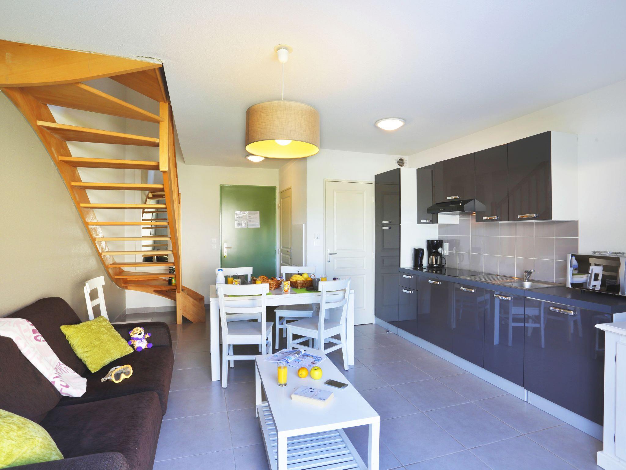 "Le Domaine des Mauriers", 4-room house 60 m2 on 2 levels. Bright, beautiful furnishings: living/dining room with 1 sofabed (140 cm, length 190 cm), dining table and TV can be hired. Exit to the balcony, to the terrace. Open kitchen (dishwasher, 4 ceramic glass hob hotplates, toaster, kettle, electric coffee machine, combination microwave). Sep. WC. Upper floor: 1 room with 1 french bed (140 cm, length 190 cm). 1 small children's room with 1 x 2 bunk beds (80 cm, length 190 cm). 1 room with 2 beds (80 cm, length 190 cm). Bathroom, shower. Electric heating. Terrace. Terrace furniture. Facilities: children's high chair, baby cot. Internet (WiFi, extra). Please note: non-smoking house. Maximum 1 pet/ dog allowed. Smoke alarm.