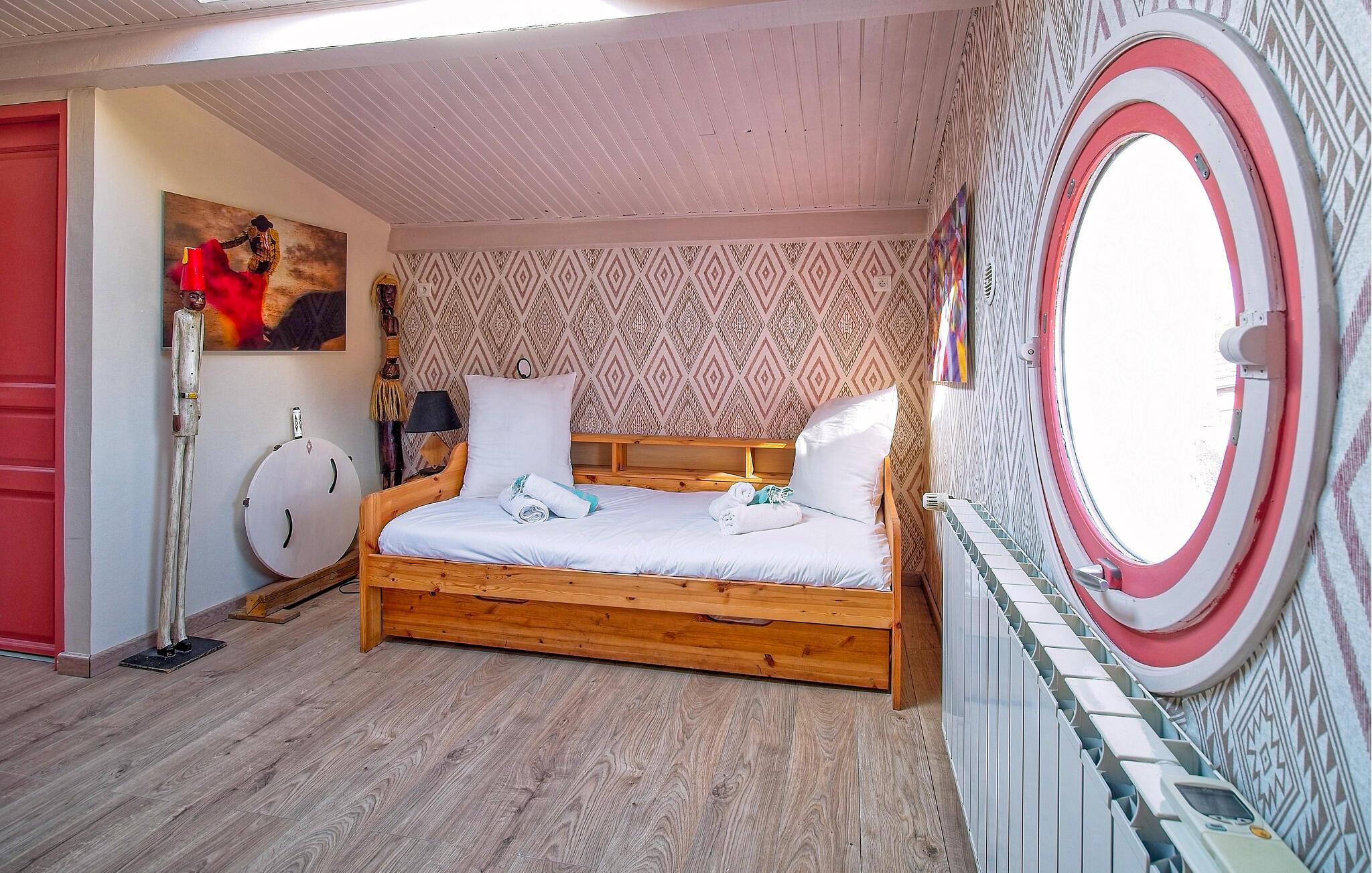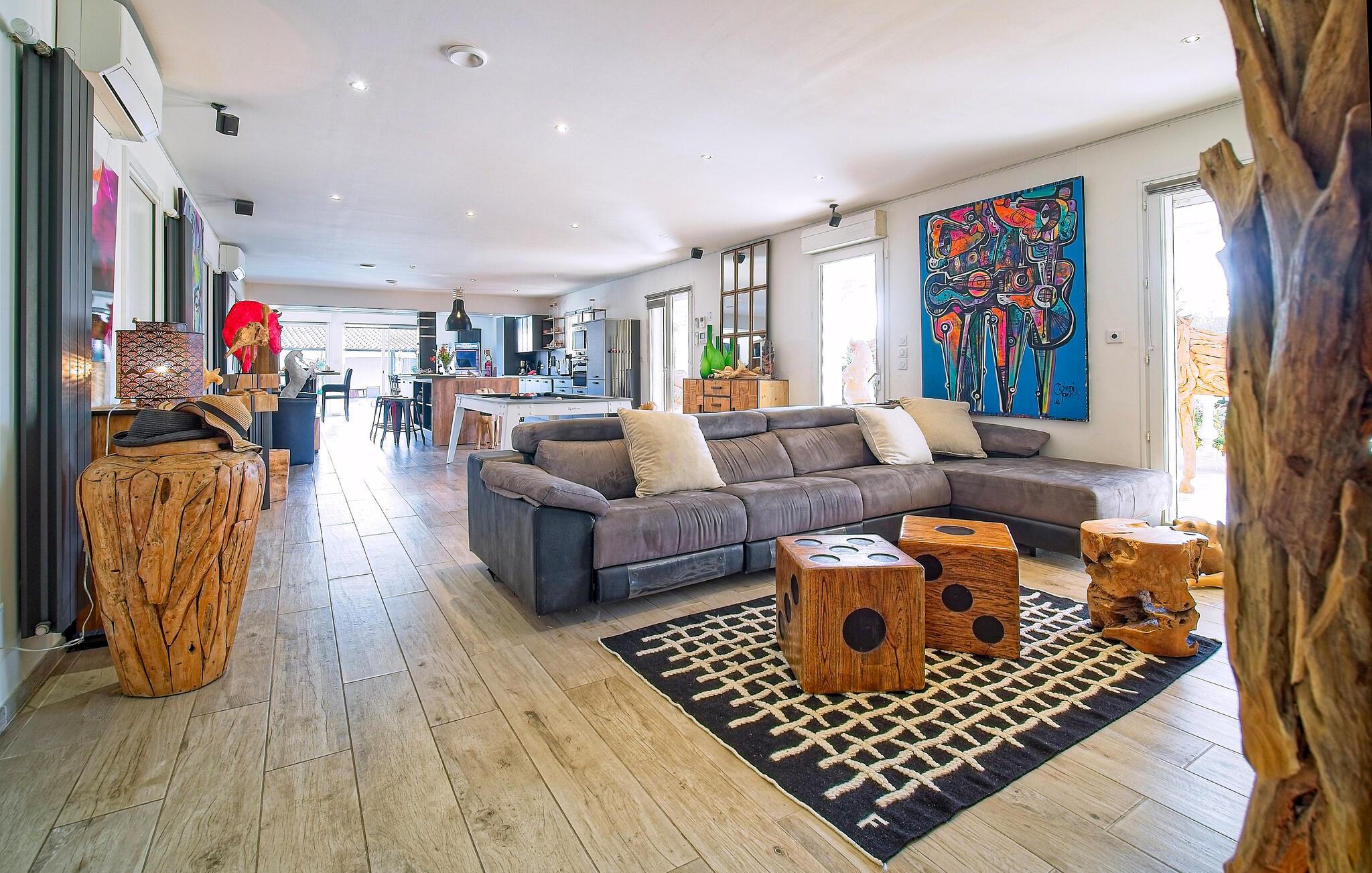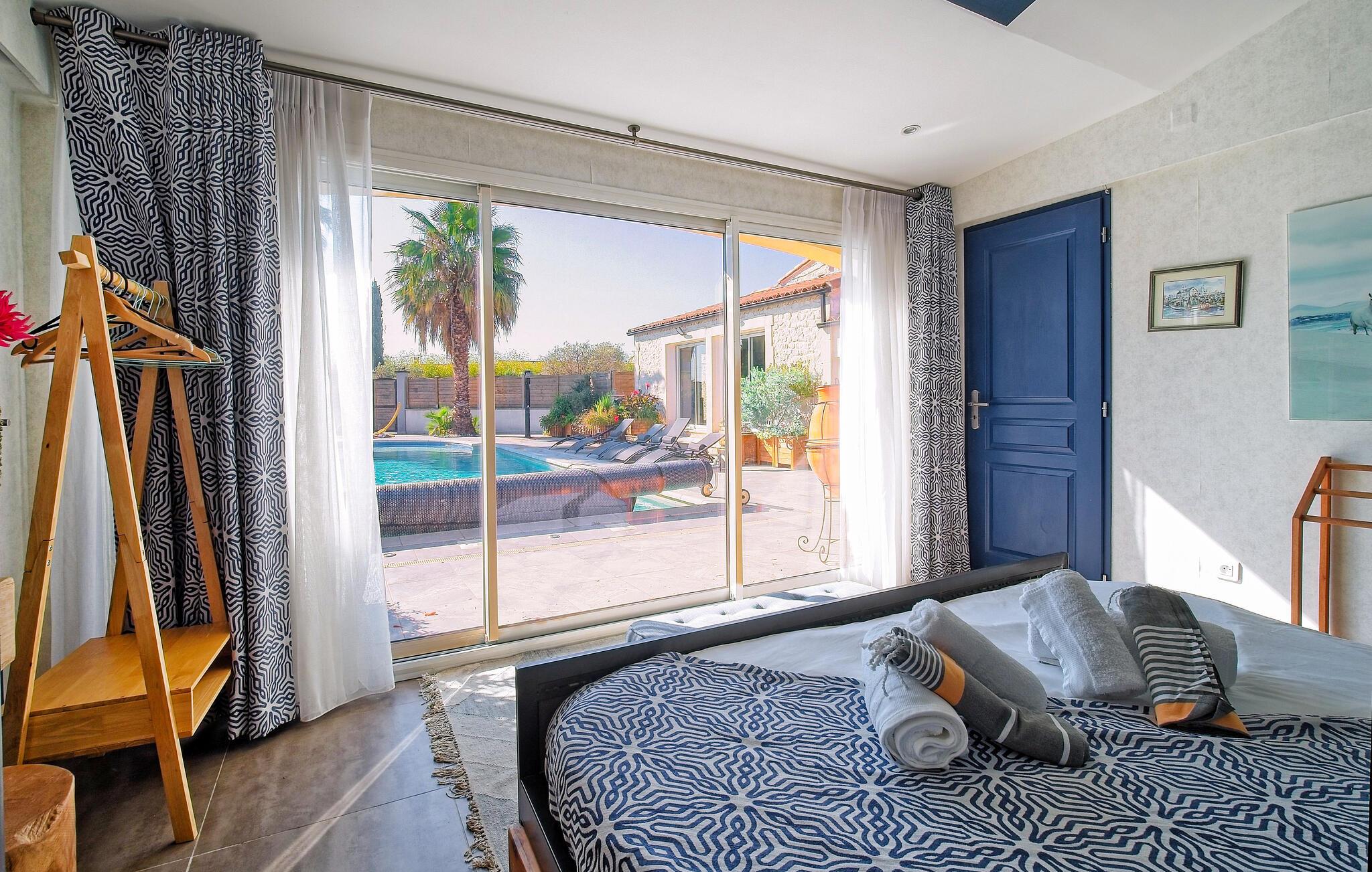 Denne villa i Saint Martin de Crau har en stor privat swimmingpool, et veludstyret køkken, rummelig opholdsstue og flere soveværelser, så den er ideel til familieferier eller sammenkomster med venner. Villaen har aircondition overalt, bortset fra børnenes fritidsrum. Stueetagen indeholder et master soveværelse, yderligere soveværelser og adgang til rekreative områder. Ovenpå tilbyder en familiesuite et behageligt ophold med sit loungeområde. Et individuelt soveværelse ud mod poolen giver privatliv og bekvemmelighed. Udenfor byder villaen på en 15m x 8m pool med et lavvandet område velegnet til børn, hængekøjer, liggestole og et sommerkøkken med grill. Høje borde er tilgængelige til gruppespisning, og underholdningsmuligheder som ping-pong og bordfodbold forbedrer oplevelsen. Villaen ligger i det fredelige boligområde Caphan i Saint Martin de Crau, til ferie mellem Alpilles og Camargue. Butikker er inden for gåafstand: Supermarked (500 m), og en fremragende frugt- og grøntsagskøbmand for enden af gaden, tilgængelig på mindre end 5 minutters gang. Fredag morgen marked i centrum af St. Martin De Crau.