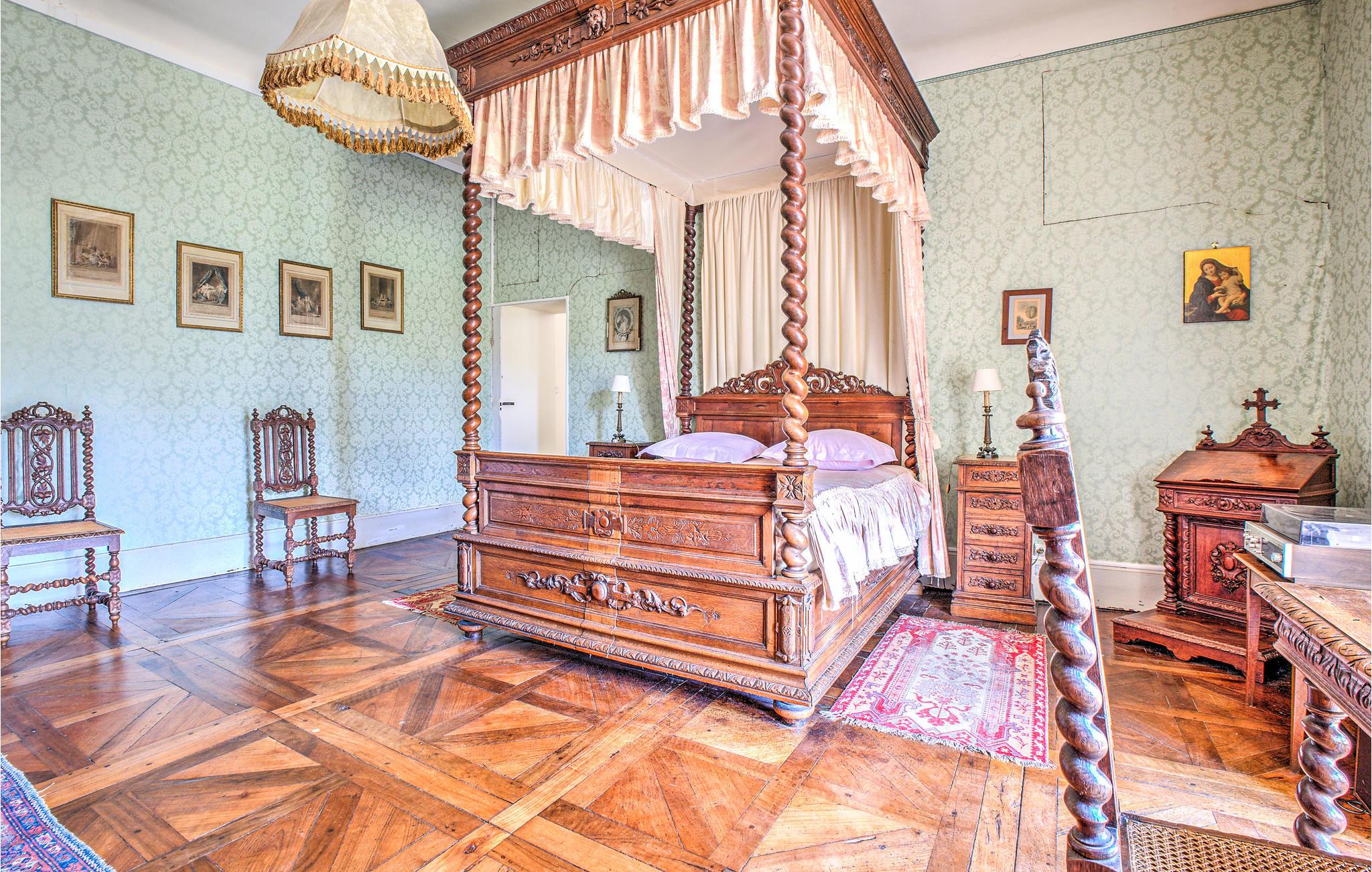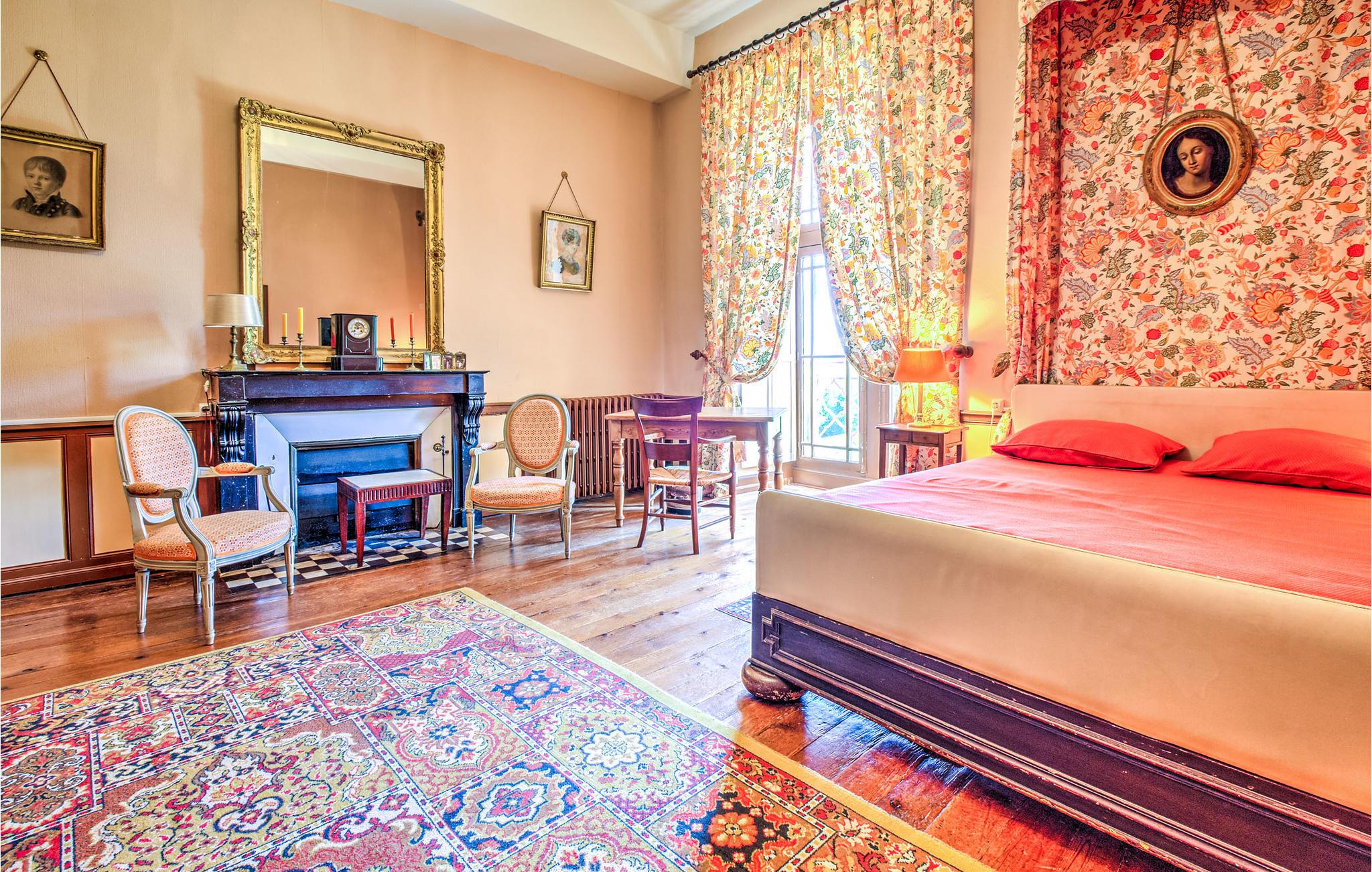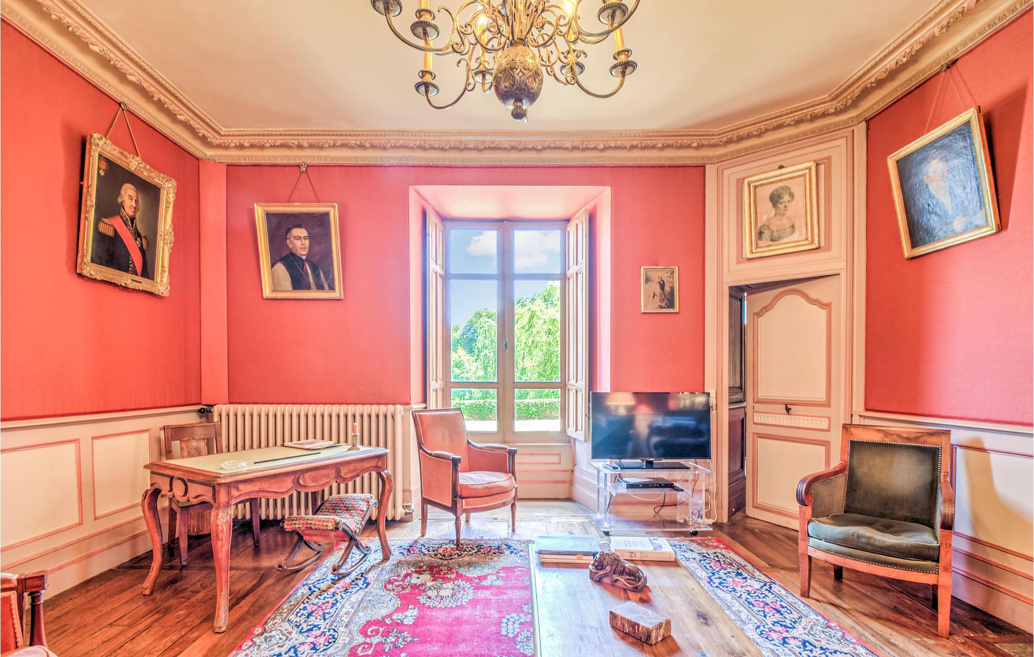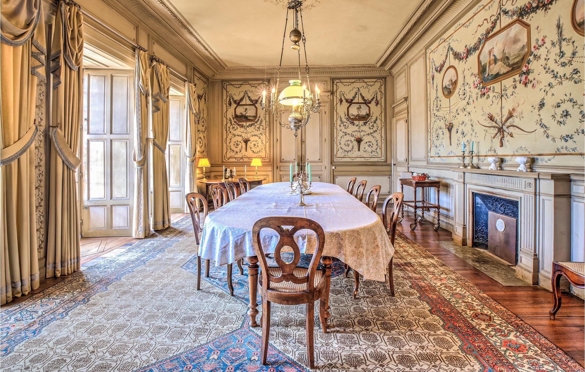 Dette slot fra det 15. århundrede ligger i en kæmpestor park med pool, et orangeri og herlige græsplæner. I har udsigt over det åbne landskab, så I kan se langt. Fra terrassen kommer I ind i hall’en med gamle gobeliner og historiske malerier på væggene, her passer kaminen af sten også godt. Køkkenet er historisk vigtigt og har derfor bevaret i sit oprindelige udtryk. Her kan I bo som kongelige gjorde, i en fjern fortid - men med nutidens komfort. Fra spisestuen er der en dobbeltdør ud til terrassen. Der er to trin op til indgangen. Barnestol og -seng på forespørgsel.