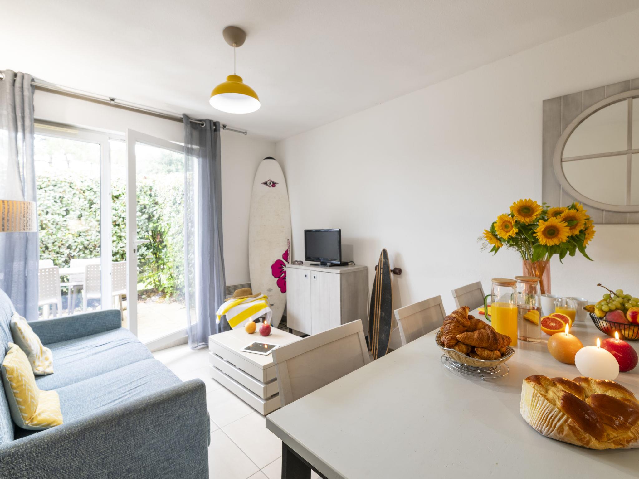 "Les Carrelets 24", 2-room apartment 32 m2. Bright, practical and comfortable furnishings: living/sleeping room with 1 double sofabed, dining table and TV. Exit to the balcony, to the terrace. 1 room with 1 french bed. Kitchenette (dishwasher, 2 ceramic glass hob hotplates, microwave). Bath/WC. Electric heating. Balcony or terrace. Terrace furniture, balcony furniture. Facilities: children's high chair, baby cot (extra). Internet (WiFi, extra). Maximum 2 pets/ dogs allowed.