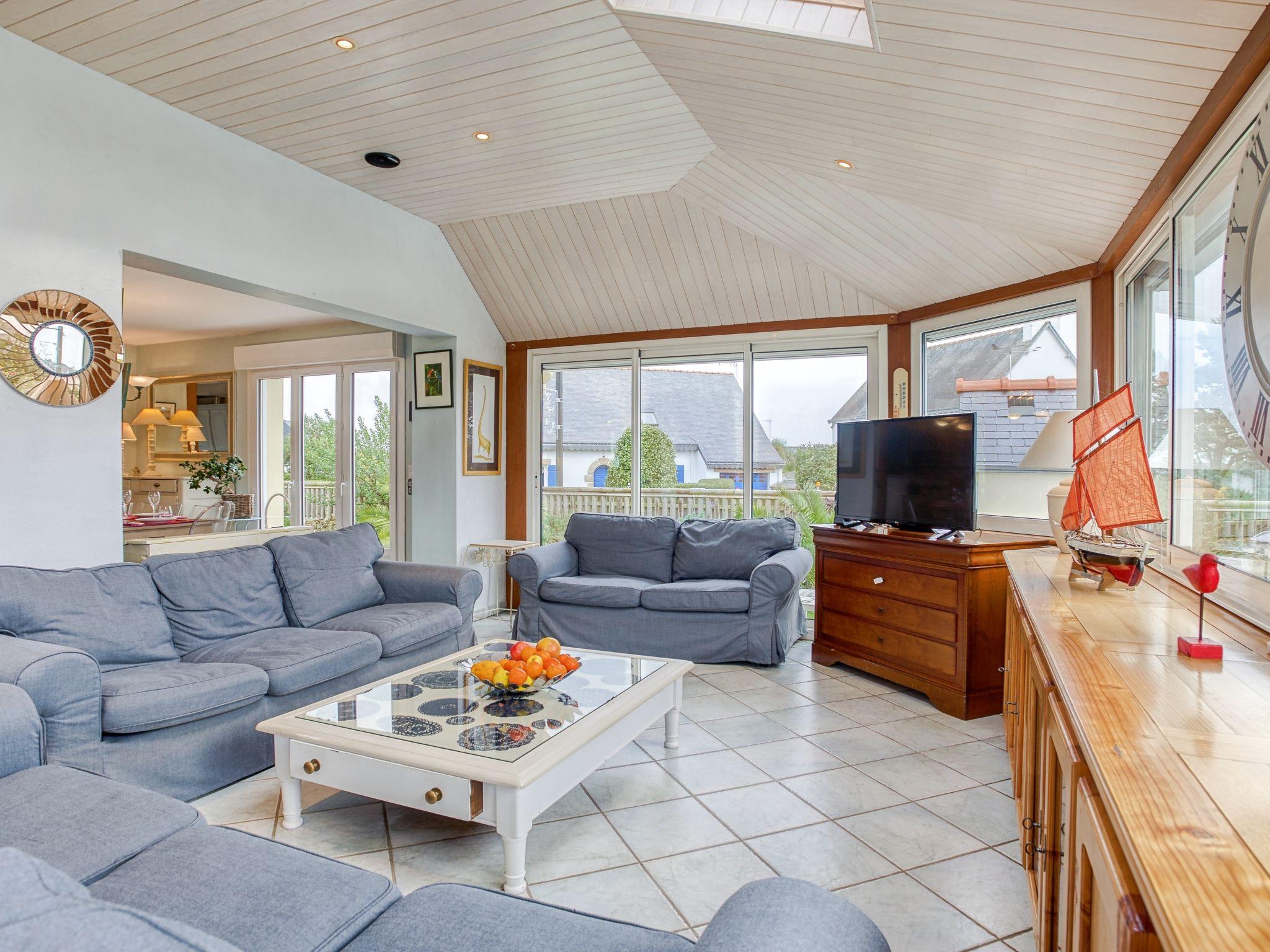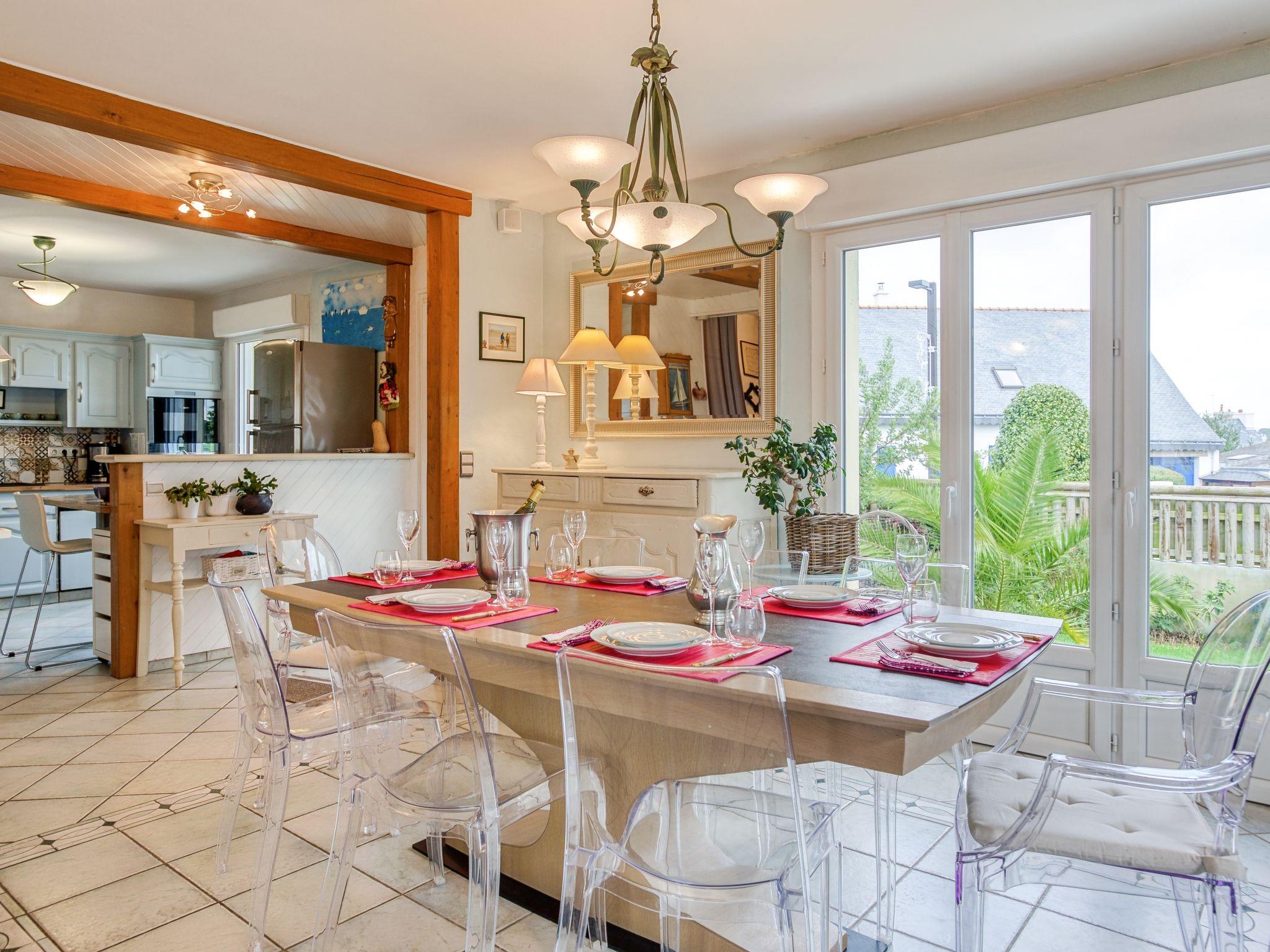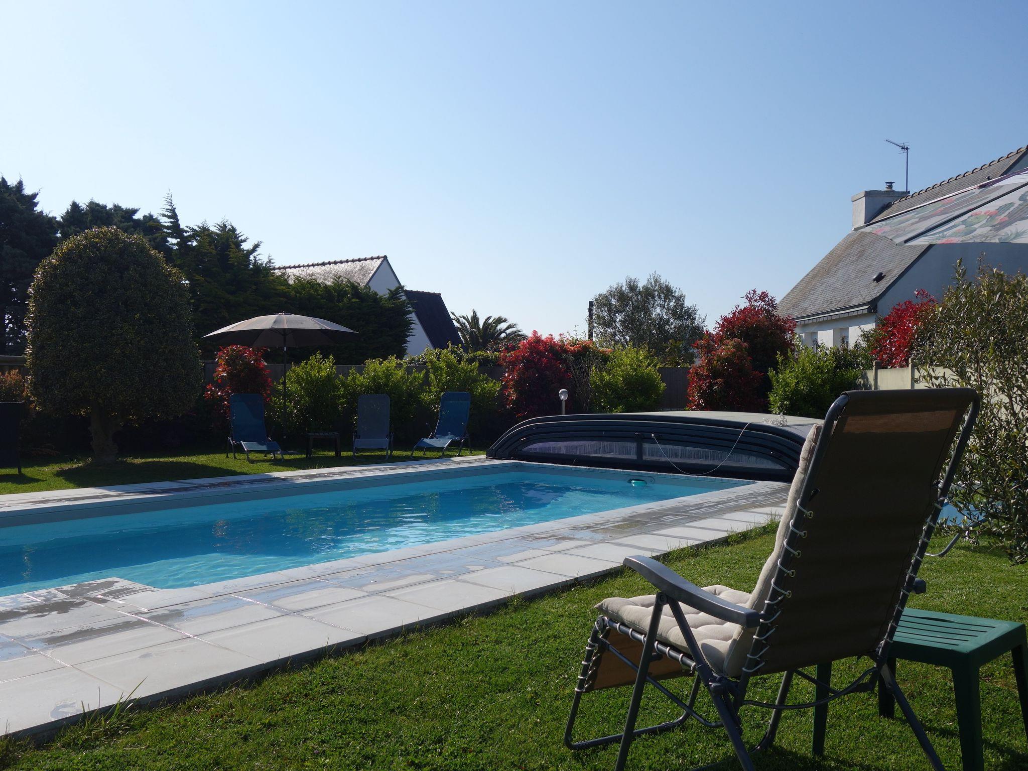 Saint Philibert 8 km from Carnac: Large single-family house "Phil'blue". In the centre of Saint Philibert, 400 m from the sea, 1 km from the beach. Private: well-kept garden 1'000 m2 (fenced), indoor pool angular, heated, secured (8 x 4 m, depth 140 - 160 cm, seasonal availability: 01.Apr. - 19.Sep.). Outdoor shower. In the house: storage room for bicycles. Grocery 400 m, supermarket 2 km, restaurant 400 m, bakery 400 m, sandy beach "Men er Belleg ou Kernevest" 1.6 km, thermal baths "Thalasothérapie Thalazur" 8 km. Golf course (18 hole) 12 km, sailing school 1.6 km, riding stable 4 km. Nearby attractions: La Trinité Sur Mer 4 km, Carnac et ses alignements 8 km, Presqu'île de Quiberon 15 km, Vannes 35 km, Plage de Locmariaquer par voie cyclable 7 km, Belle ile en Mer, Houat, Hoedic. Hiking paths: Le Golfe du Morbihan.