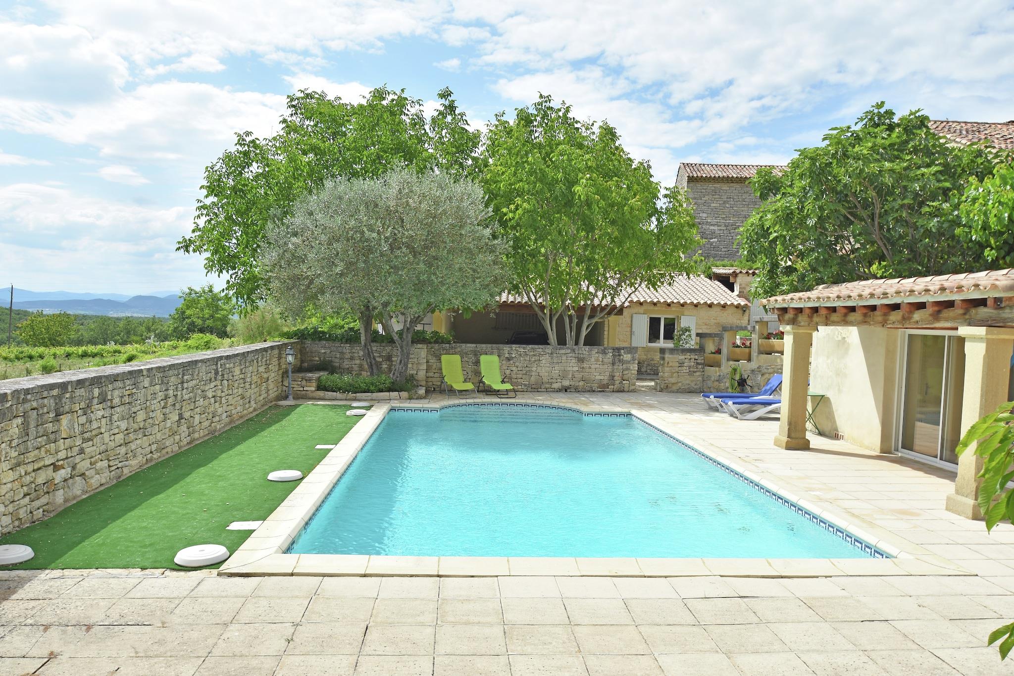 Denne "trouvaille" ligger kun 6 km væk fra Barjac, en malerisk landsby mellem floderne Ardèche og Cèze. Disse floder er foret med mange små strande og er perfekte til kanoture. Barjac er omgivet af vinmarker og lavendel og solsikkefelter. Det ugentlige marked, aften marked og økologisk marked er alle en sand fornøjelse for sanserne. Og der er masser af gode terrasser at få en pause. Området har en rig historie og byder på masser af ting at lave. Tilbring en dag i Avignon, Nîmes eller Montpellier. Kunst elskere bør ikke gå glip af muligheden for at besøge Uzès og Arles, begge er vært for et stort antal gallerier. Denne store villa, der består af to gæsteboliger, hver med egen indgang og terrasse, ligger på kanten af landsbyen. s perfekt til flere par eller familier, der rejser sammen. Indkvartering er blevet indrettet med et godt øje for detaljer. Hovedvillaen har en terrasse hvor alle gæster kan samles for at spise al fresco. Det har udsigt over swimmingpoolen nedenfor og dalen og bjergene i det fjerne. Swimmingpoolen er stor nok og liggestolene på solterrassen inviterer dig til at slappe af og slappe af. Der er et jeu-de-boules og terræn, hvor børn kan lege (20 x 10 m). Interiøret er behageligt og værelserne er alle kærligt møblerede. Smukke sofaer til afslapning på luksuskøkkener (den største store nok til flere personer madlavning sammen) og soveværelser og badeværelser med masser af plads og møbler af høj kvalitet. Vi er glade for, at vi nu kan tilbyde dig denne fantastiske indkvartering.