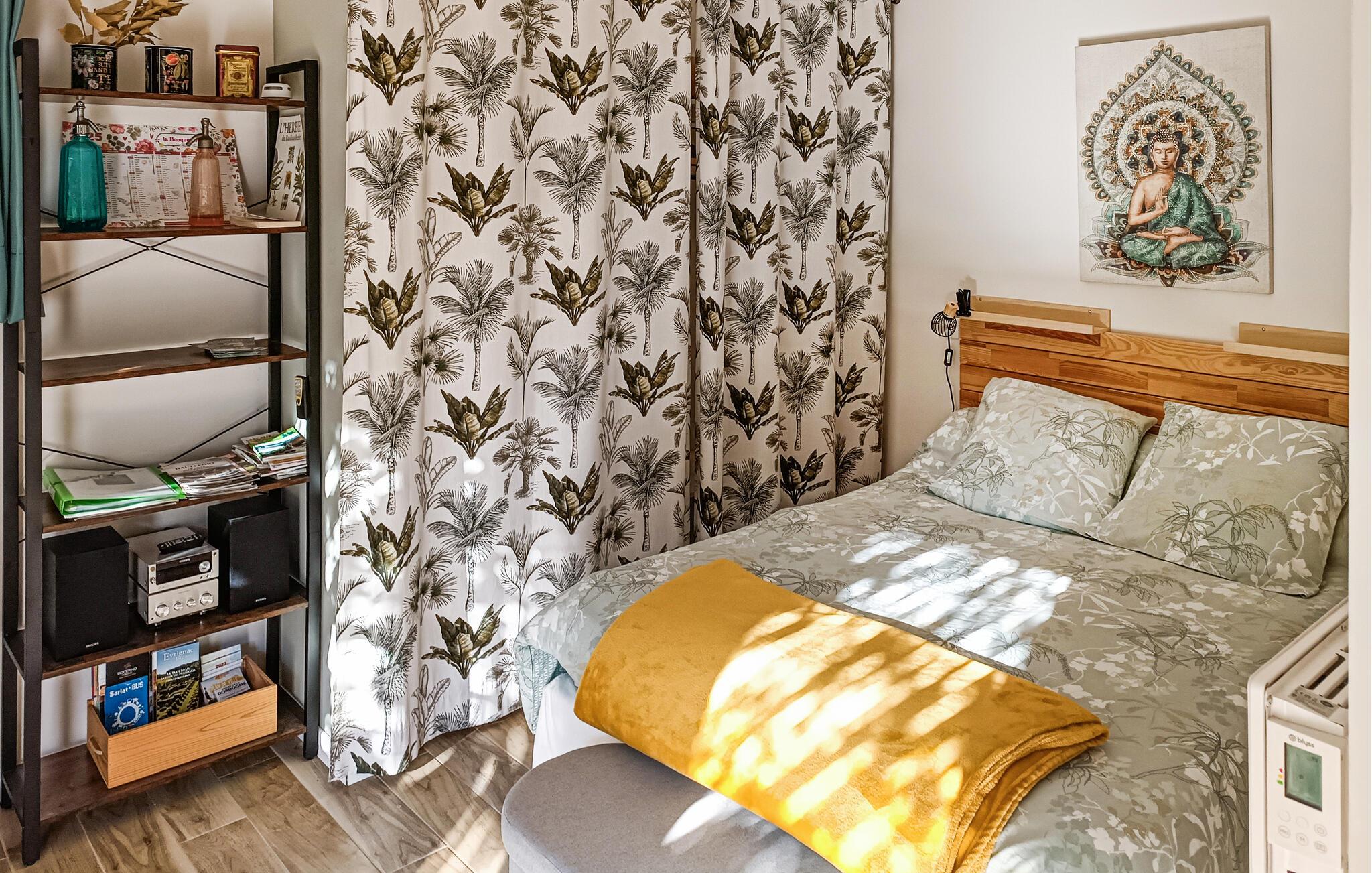 Nyd jeres parferie i denne lille ferieoase tæt på attraktionerne i Périgord Noir. Møblerne er funktionelle og designet med kærlige detaljer, hvilket skaber en varm og intim atmosfære. Find ro i det komfortabelt møblerede interiør og nyd de lyse rum med smagfulde møbler. Sæt jer til rette i siddeområdet, læs en bog eller lyt til musik. Tilbered måltider sammen i det kompakte køkken og server dem ved det lille spisebord.