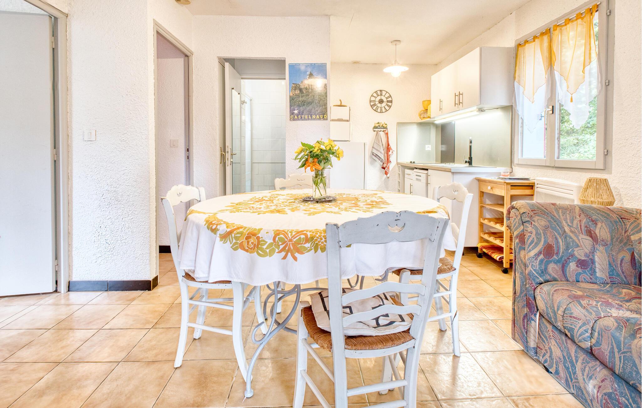 Dette charmerende hus byder jer velkommen med en lys og venlig atmosfære i hjertet af den maleriske Périgord Noir. Her kan I trylle lækre retter frem lavet med regionale råvarer og planlægge jeres aktiviteter i den indbydende spisestue. Nyd hyggelige spilleaftener under blød belysning eller fordyb jer i en god bog.