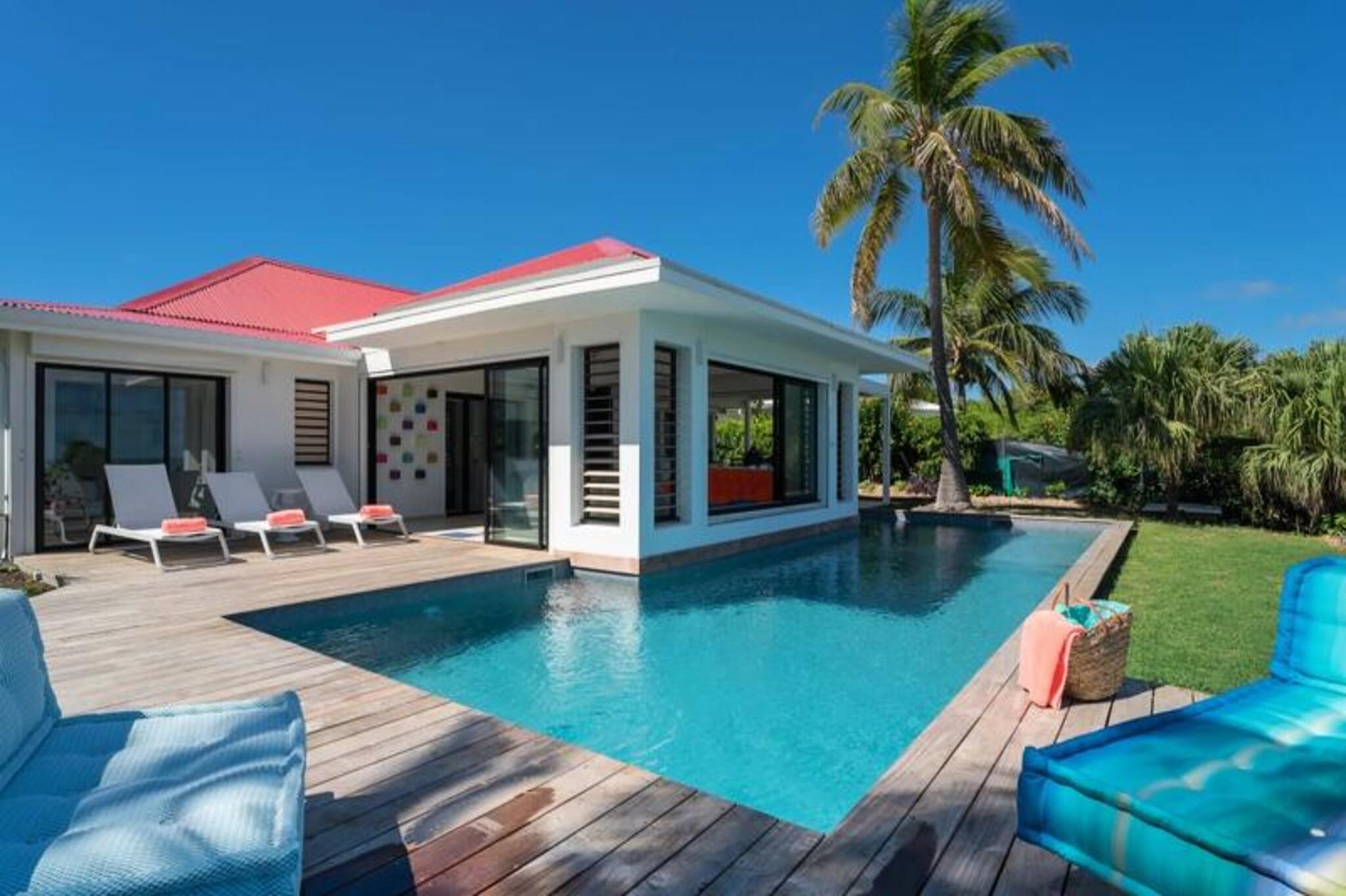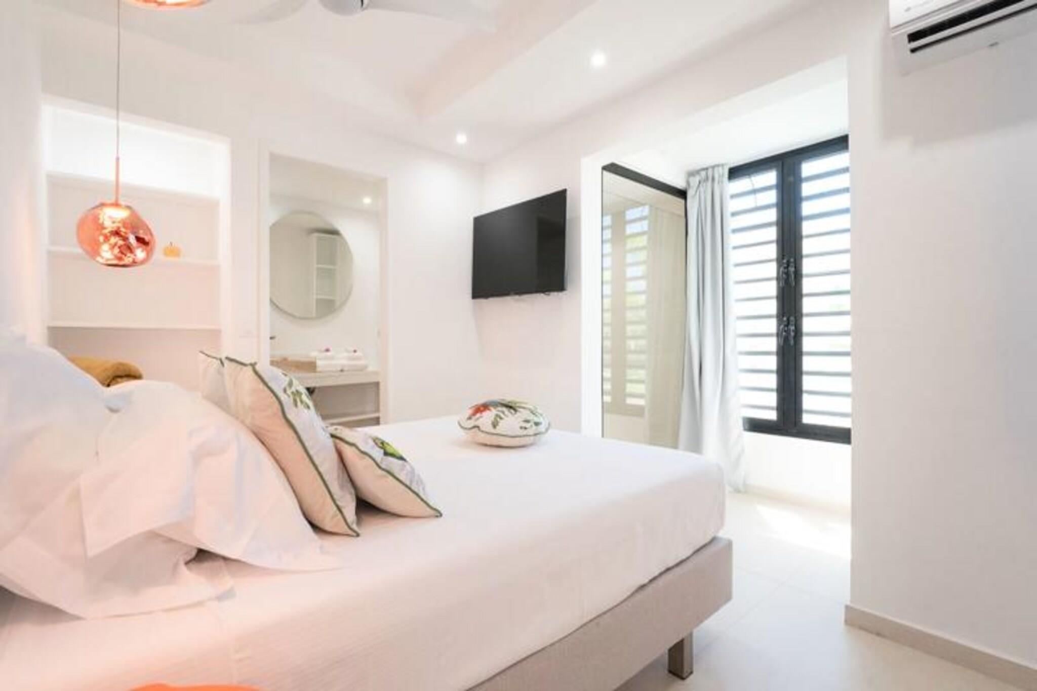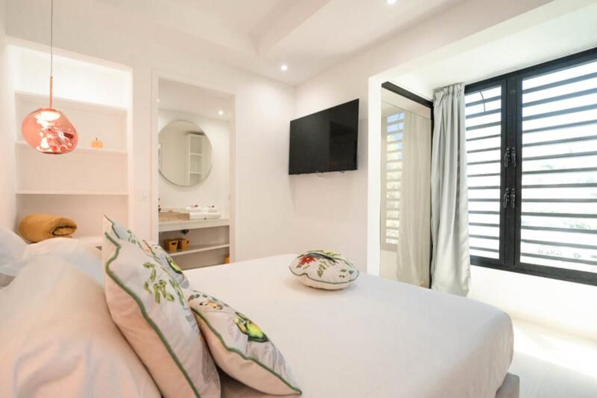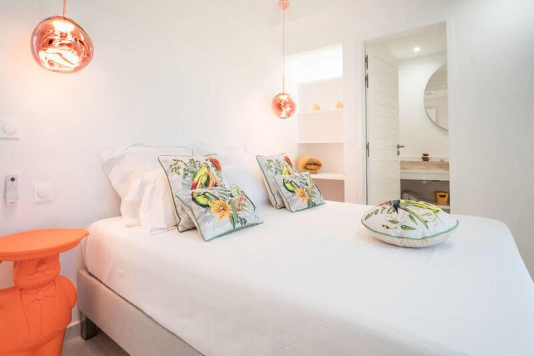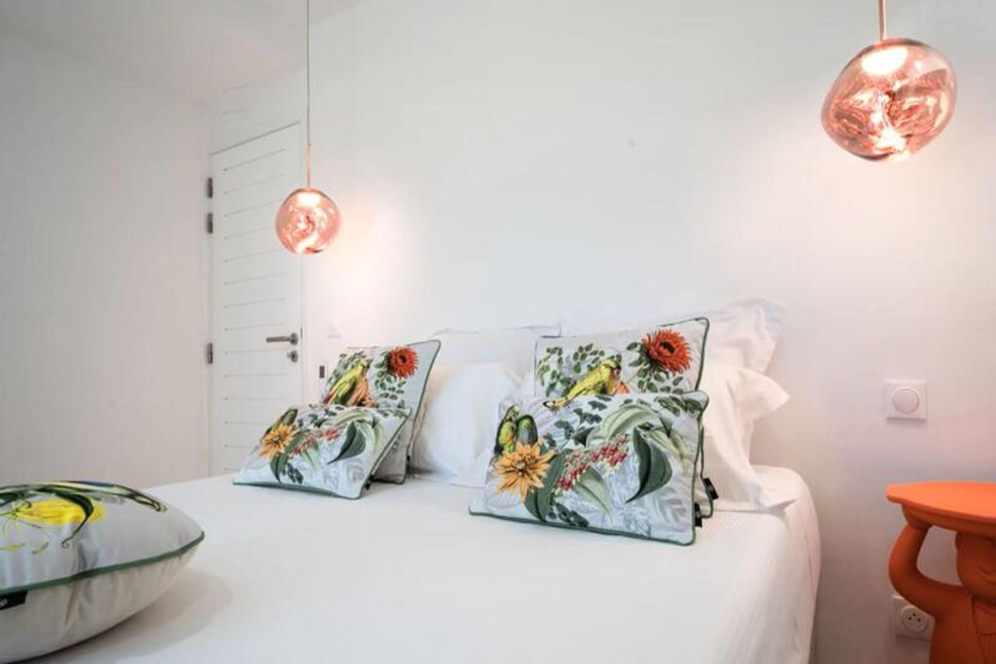Velkommen til **Villa Zyx**, en 5-stjernet villa med betagende **havudsigt**. Beliggende mellem Saint-François og spidsen af ??slottene, har denne moderne en-etagers villa 4 rummelige soveværelser, hver med et **privat badeværelse**, **påklædningsværelse** og **TV**, der kan rumme op til til 8 gæster. To soveværelser har **kingsize-senge**, mens de andre tilbyder **queen-size-senge**. Nyd den **private swimmingpool**, **udendørsbiograf** og en stor **terrasse** med en bioklimatisk veranda, ideel til udendørs afslapning. Kun 10 minutter fra **stranden** og **Saint-François centrum** finder du alle faciliteter, herunder et **supermarked**, **apotek** og **fiskemarked**. **Marina de Saint-François**, med butikker, restauranter og vandaktiviteter, ligger kun 5 minutter i bil. Nærliggende attraktioner omfatter **Saint-François Golfbane**, **casino** og **flyveplads** samt fantastiske strande som **Raisins Clairs** og **Caravelle**. Villaen har et **fuldt udstyret køkken**, **to køleskabe**, **to opvaskemaskiner** og en **vinkælder**. Med **klimaanlæg** på alle værelser, **Wi-Fi** og **daglig rengøring** efter anmodning, sikrer Villa Zyx komfort og bekvemmelighed for dit ophold.