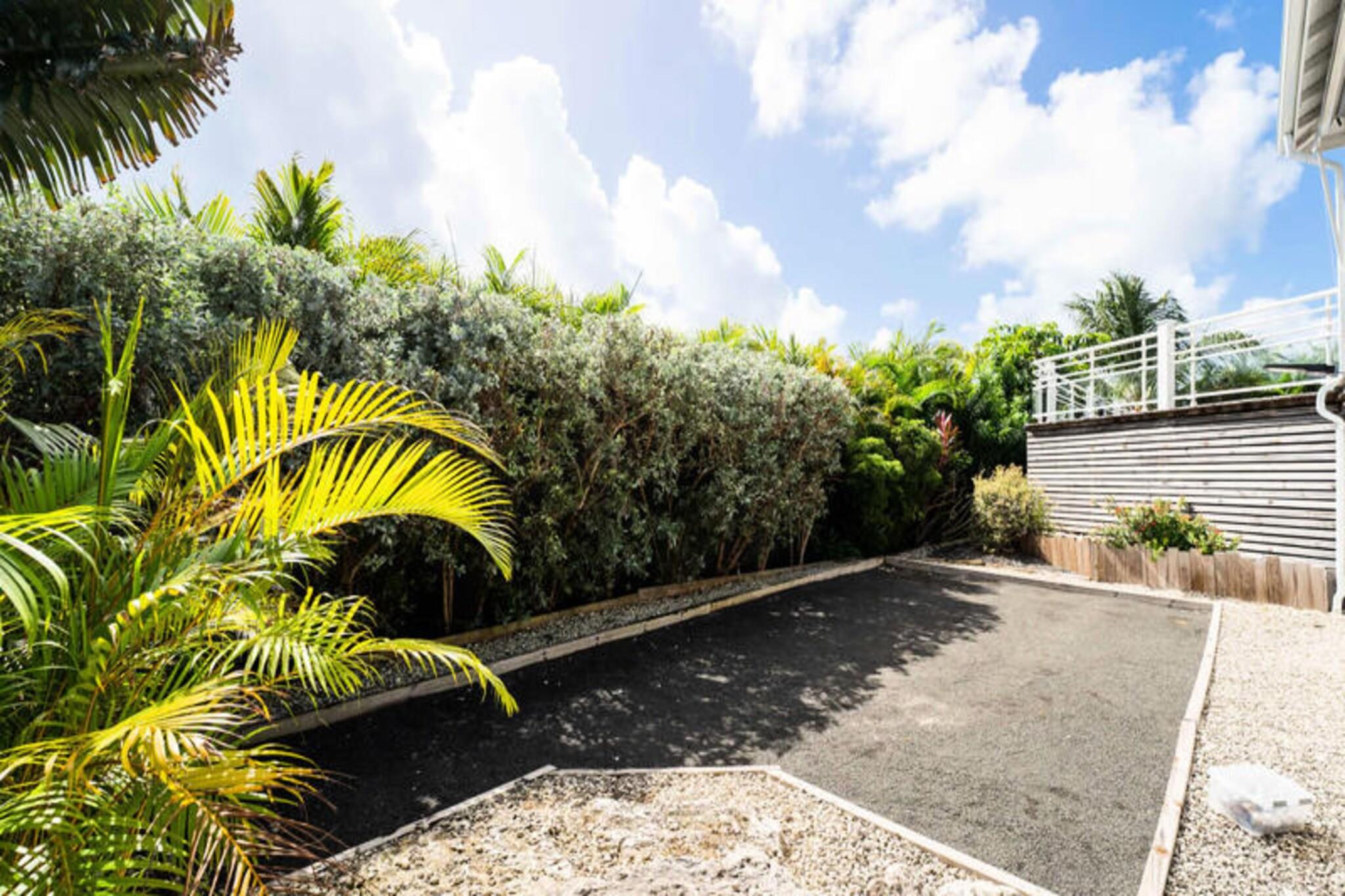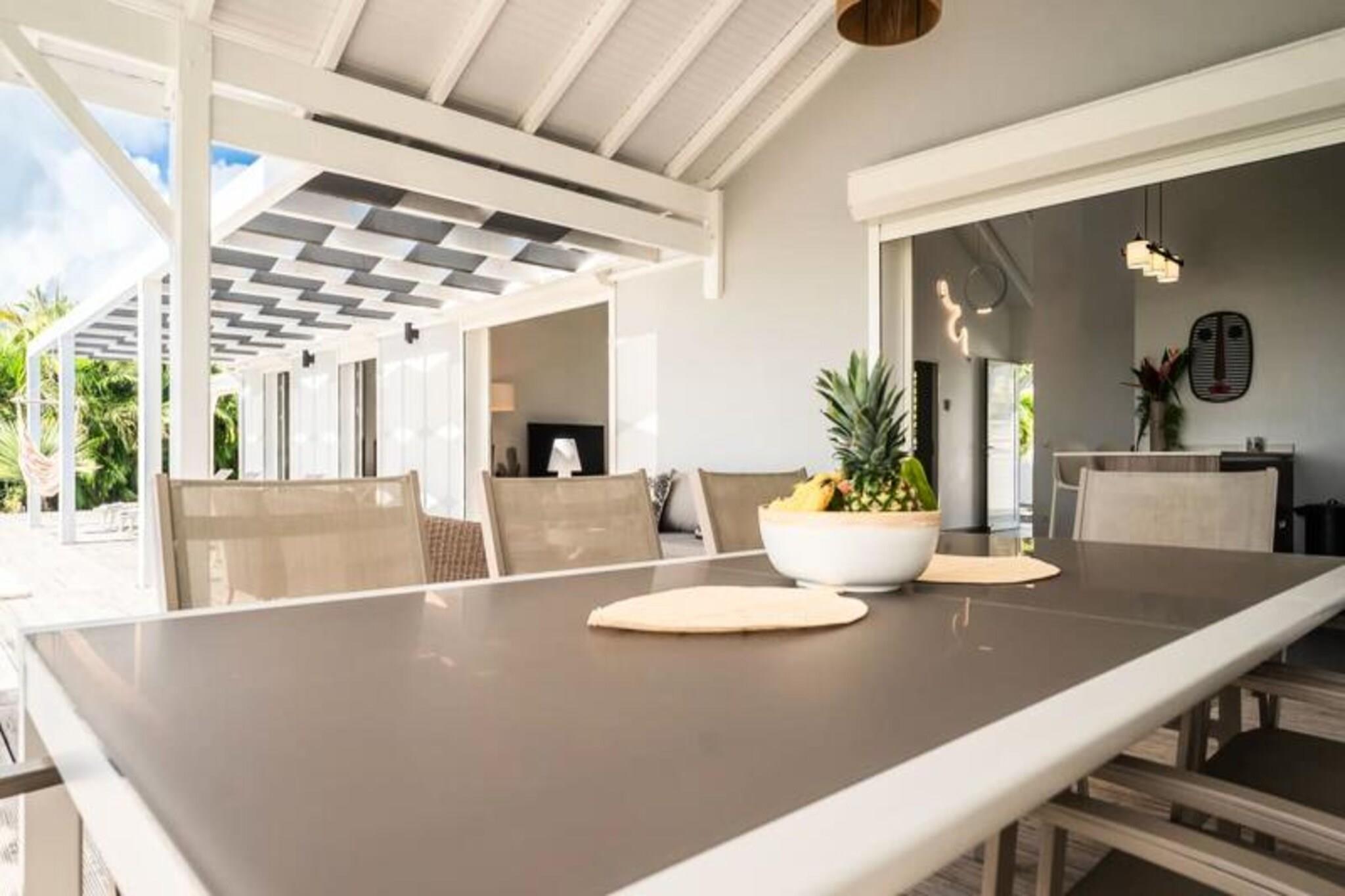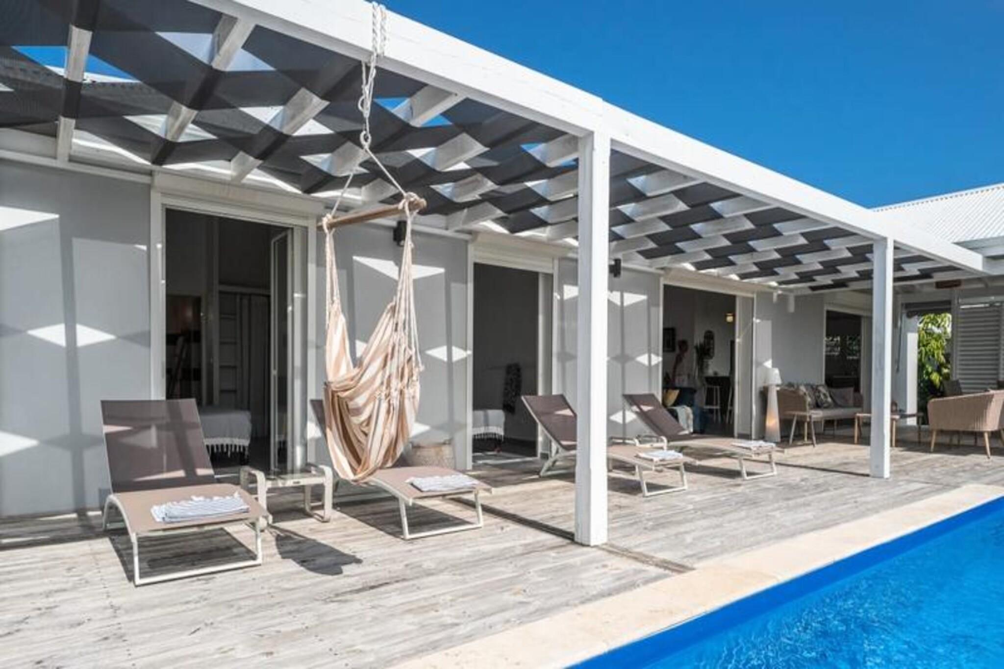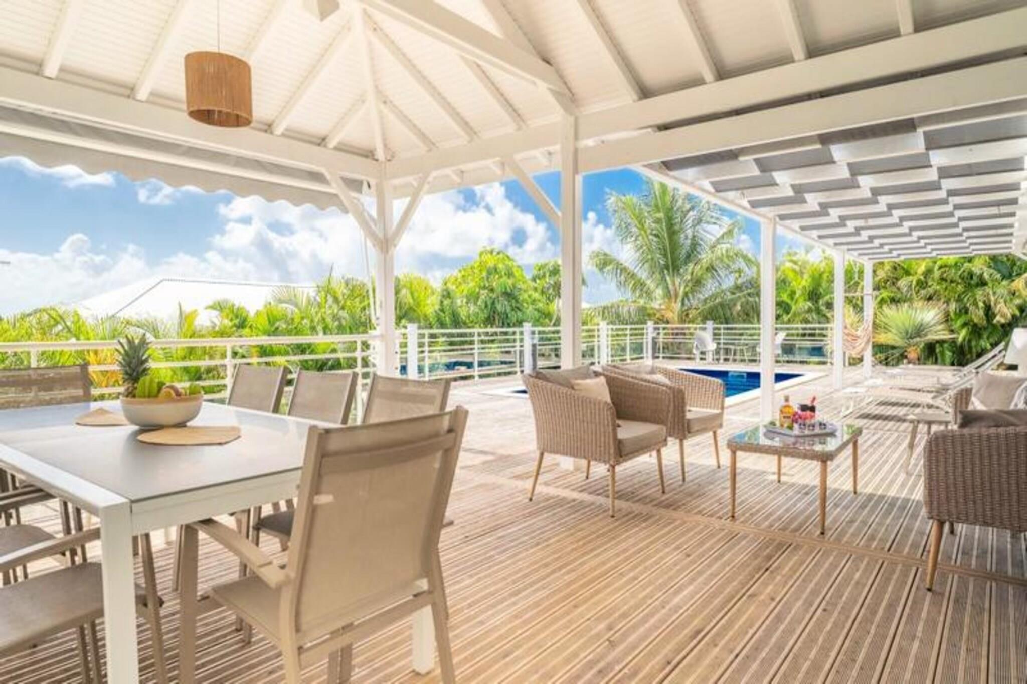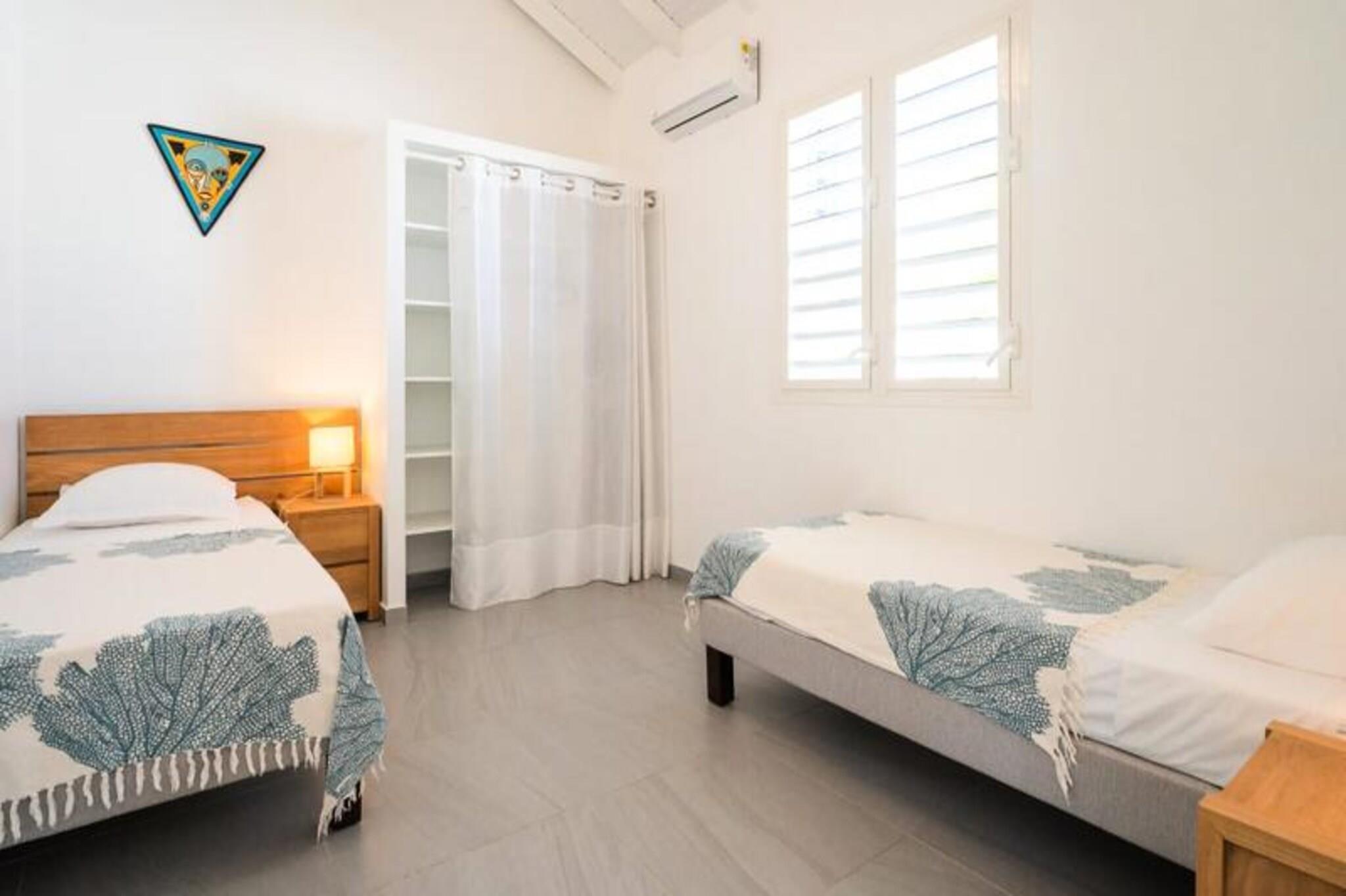 Dette rummelige feriehus har 4 soveværelser med aircondition, der komfortabelt kan rumme op til 8 gæster. To af soveværelserne har eget badeværelse, mens de to andre deler et brusebad. Et soveværelse tilbyder fleksible sovearrangementer med to enkeltsenge, der kan kombineres til en dobbeltseng. Den lyse stue åbner ud til en terrasse, perfekt til at nyde det Guadeloupeiske klima. Ejendommen er ikke kæledyrsvenlig og er designet til at sikre et roligt ophold uden fester tilladt. Denne villa ligger kun 2 minutter fra den smukke Raisins Clairs-strand og giver nem adgang til det fredfyldte vand og det gyldne sand til svømning og afslapning. Det livlige centrum af Saint-François ligger kun 5 minutter i bil og byder på en række restauranter, butikker og aktiviteter. Besøg Saint-François marina og udforsk lokale butikker og restauranter. Øen Marie Galante er synlig fra terrassen og tilføjer et magisk præg til omgivelserne. Villaen er udstyret med et fuldt funktionelt køkken, herunder en central ø og et bryggers til opbevaring. Den private swimmingpool er perfekt til at slappe af, mens den overdækkede udendørs terrasse giver plads til udendørs spisning. Ejendommen inkluderer også Wi-Fi, aircondition, håndklæder og sengetøj samt kvalitets rengøringsservice før og efter dit ophold. Et vandreservesystem sikrer kontinuerlig vandforsyning, hvilket giver ekstra komfort.