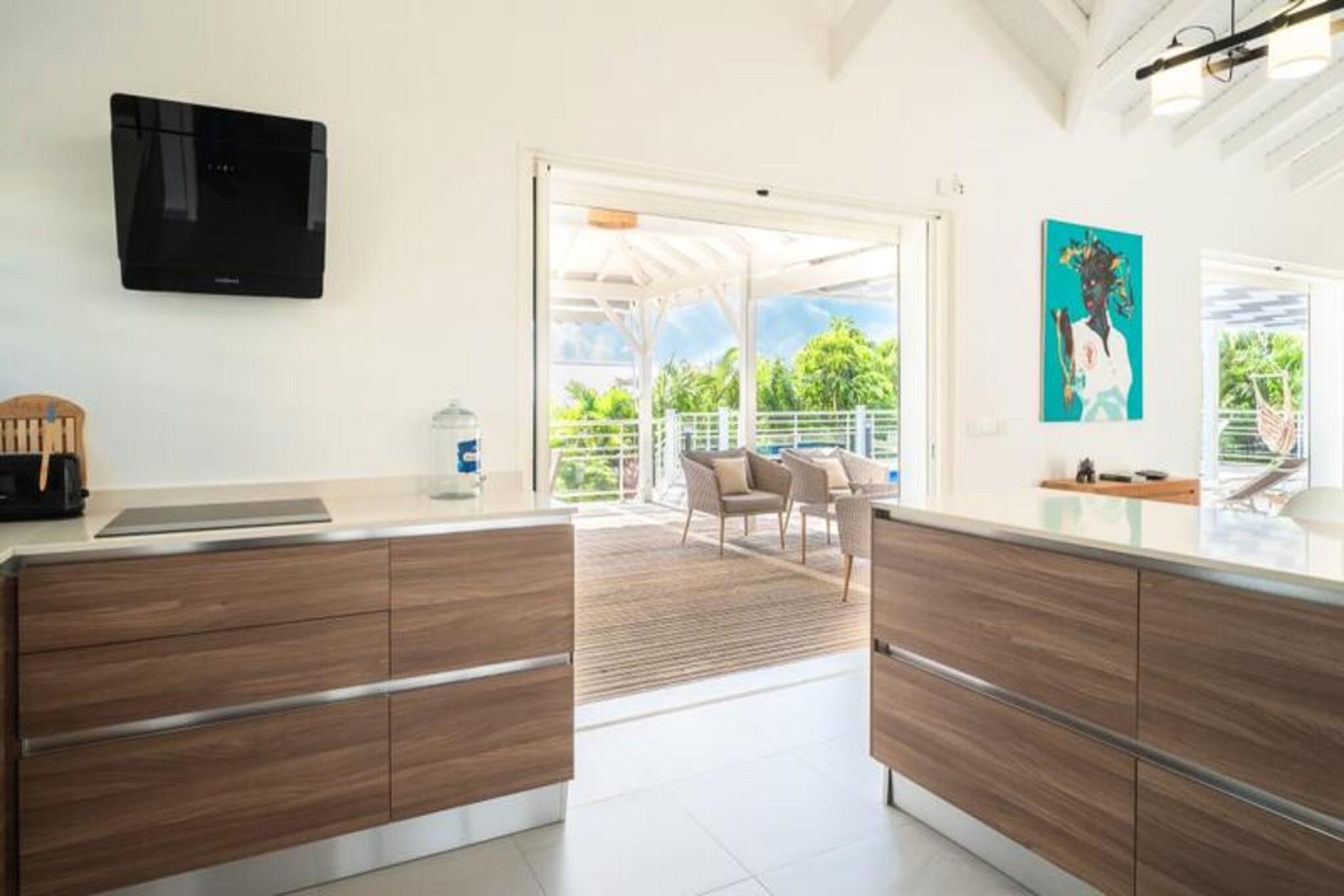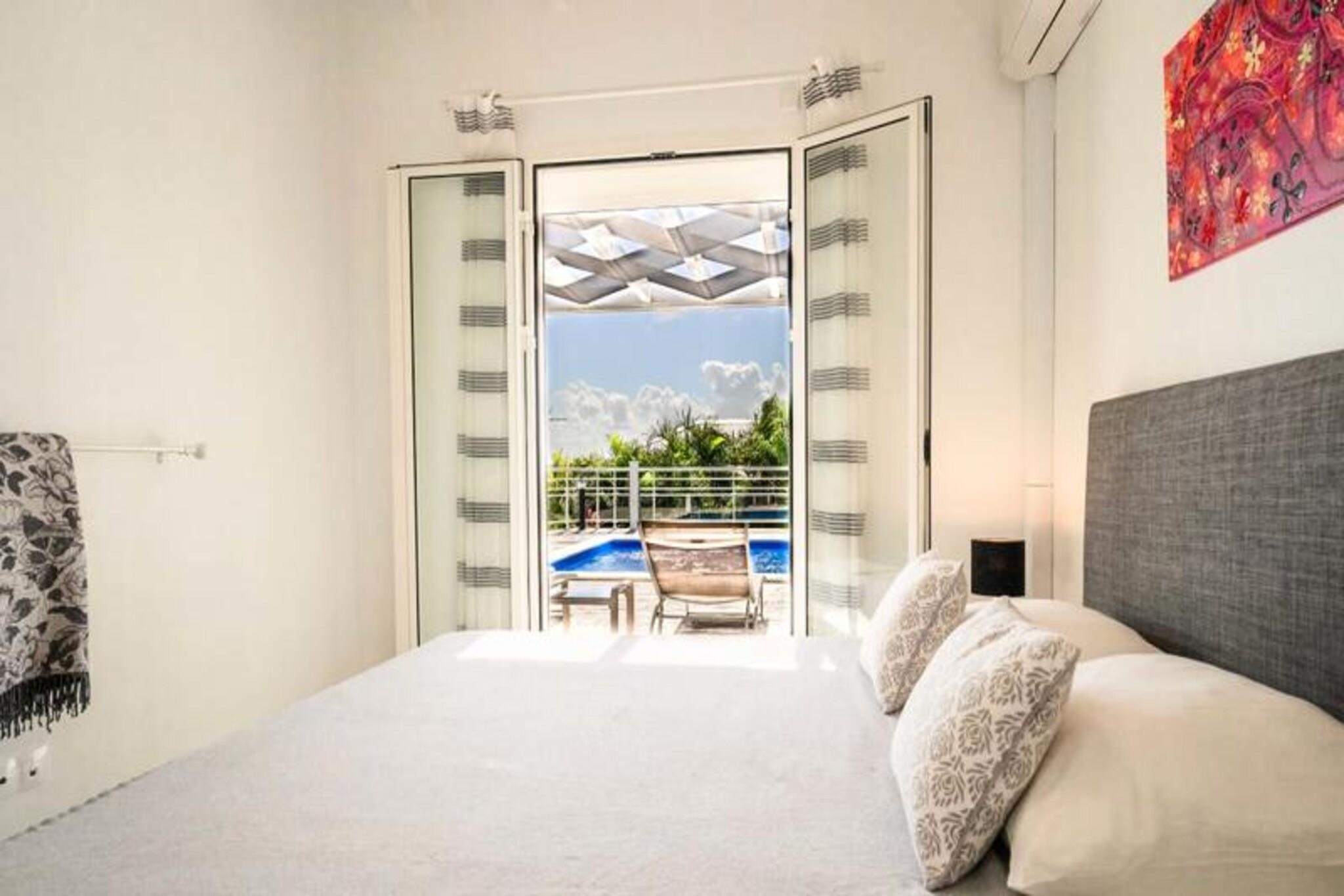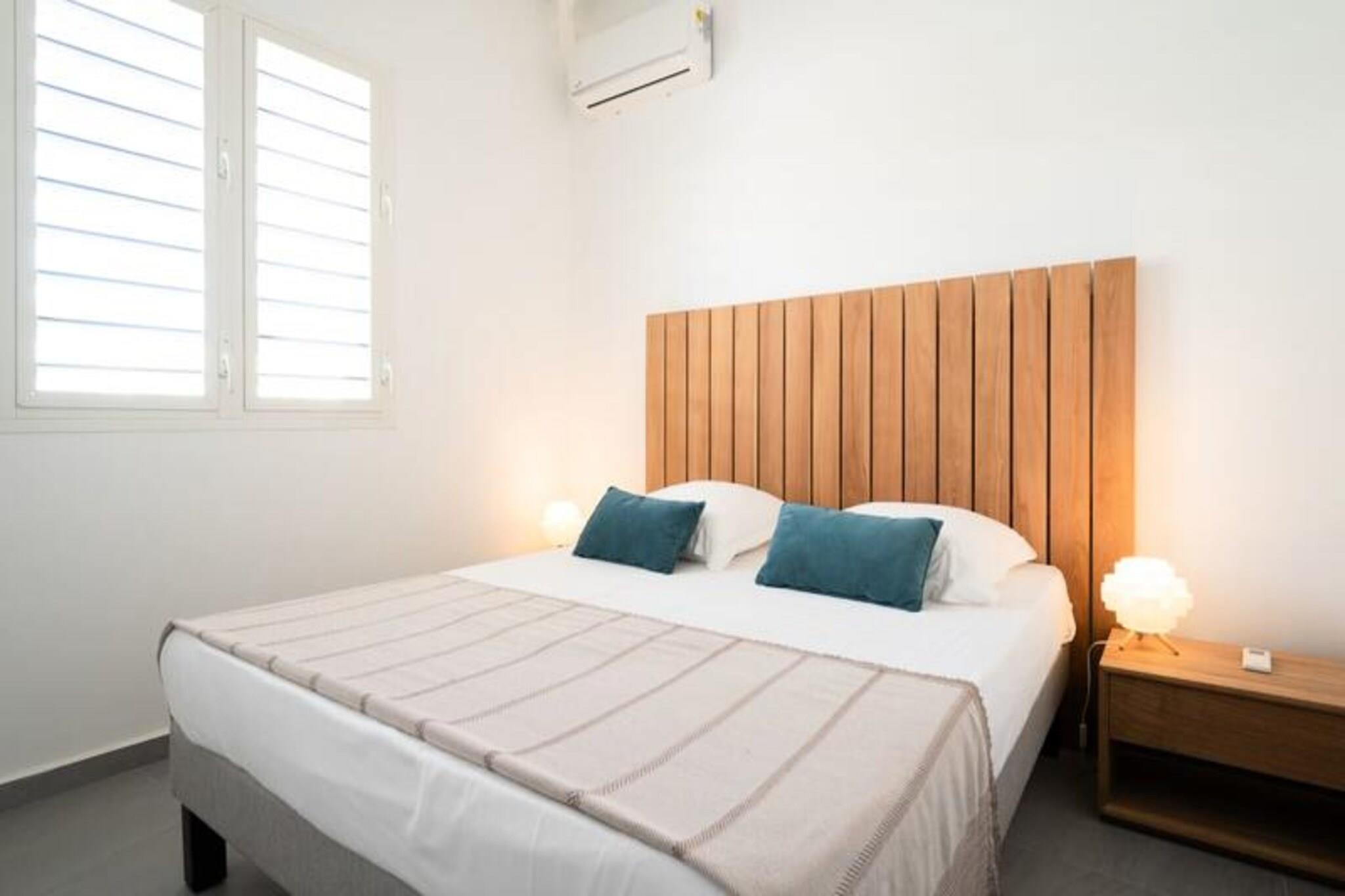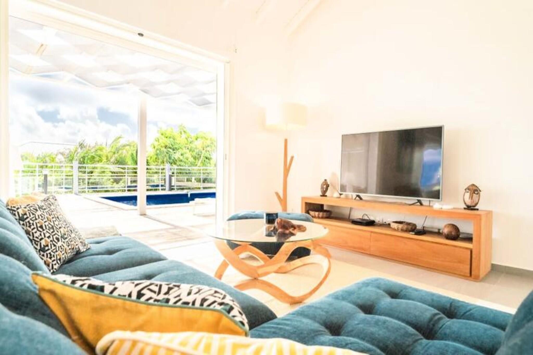 Dette rummelige feriehus har 4 soveværelser med aircondition, der komfortabelt kan rumme op til 8 gæster. To af soveværelserne har eget badeværelse, mens de to andre deler et brusebad. Et soveværelse tilbyder fleksible sovearrangementer med to enkeltsenge, der kan kombineres til en dobbeltseng. Den lyse stue åbner ud til en terrasse, perfekt til at nyde det Guadeloupeiske klima. Ejendommen er ikke kæledyrsvenlig og er designet til at sikre et roligt ophold uden fester tilladt. Denne villa ligger kun 2 minutter fra den smukke Raisins Clairs-strand og giver nem adgang til det fredfyldte vand og det gyldne sand til svømning og afslapning. Det livlige centrum af Saint-François ligger kun 5 minutter i bil og byder på en række restauranter, butikker og aktiviteter. Besøg Saint-François marina og udforsk lokale butikker og restauranter. Øen Marie Galante er synlig fra terrassen og tilføjer et magisk præg til omgivelserne. Villaen er udstyret med et fuldt funktionelt køkken, herunder en central ø og et bryggers til opbevaring. Den private swimmingpool er perfekt til at slappe af, mens den overdækkede udendørs terrasse giver plads til udendørs spisning. Ejendommen inkluderer også Wi-Fi, aircondition, håndklæder og sengetøj samt kvalitets rengøringsservice før og efter dit ophold. Et vandreservesystem sikrer kontinuerlig vandforsyning, hvilket giver ekstra komfort.