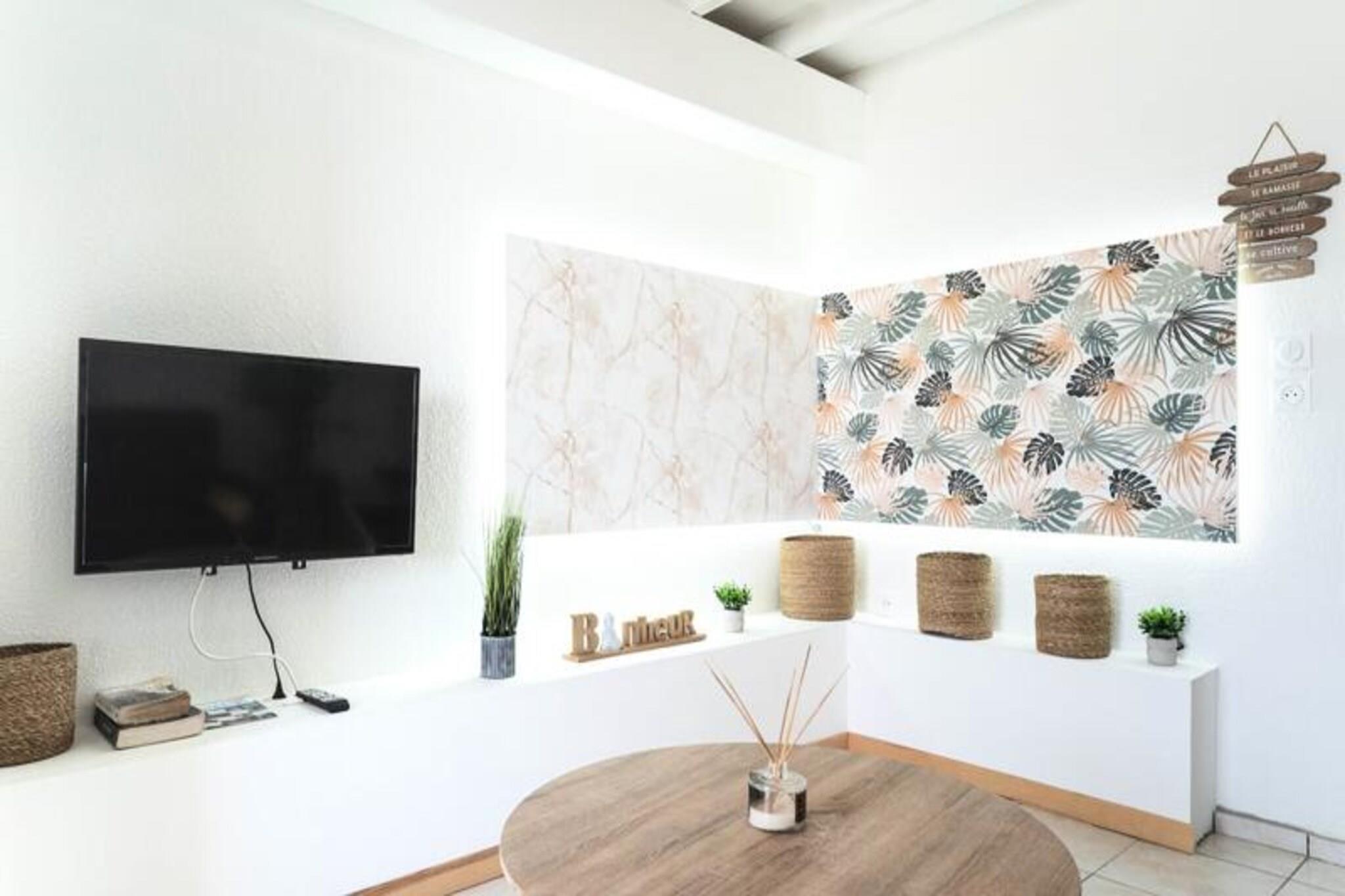 Denne charmerende lejlighed tilbyder komfortabel indkvartering for 2 til 4 g?ster. Slap af p? den rummelige terrasse med udsigt over det natursk?nne landskab og nyd den friske luft. Lejligheden har et veludstyret k?kken, et moderne badev?relse med vaskemaskine og separat toilet for ekstra bekvemmelighed. Hold forbindelsen med gratis Wi-Fi-adgang under hele dit ophold. Udforsk de pulserende omgivelser! Oplev n?rliggende strande, deltag i vandsport, og fork?l dig selv med lokale smagsoplevelser p? charmerende caf?er og travle markeder. Byens centrum er inden for r?kkevidde og byder p? et udvalg af butikker og restauranter. For sportsentusiaster ligger et sportskompleks og tennisbaner kun 250 meter v?k. Denne lejlighed giver et afslappende og behageligt ophold. Nyd bekvemmeligheden ved en privat have og reserveret parkeringsplads lige ved siden af ??boligen. Stuen og k?kkenet har direkte adgang til terrassen, hvilket skaber en problemfri indend?rs-udend?rs opholdsoplevelse.