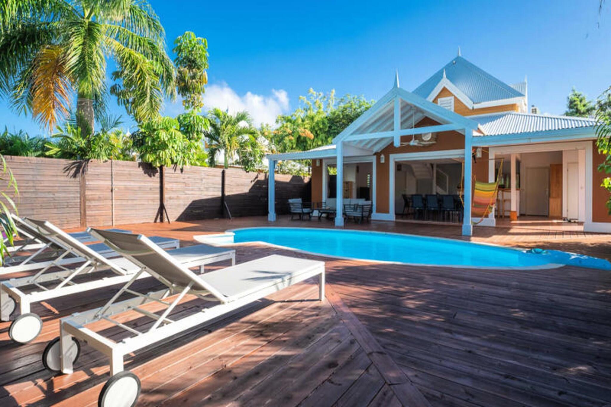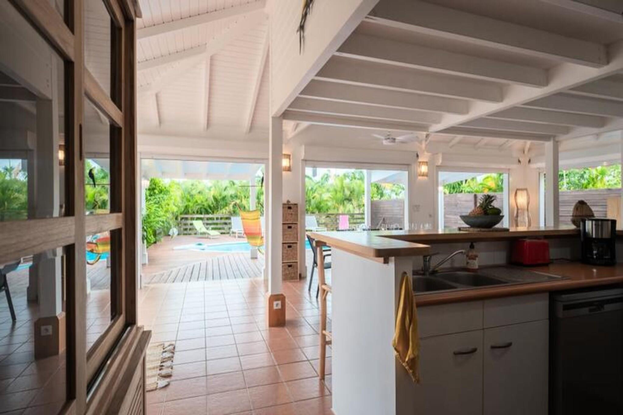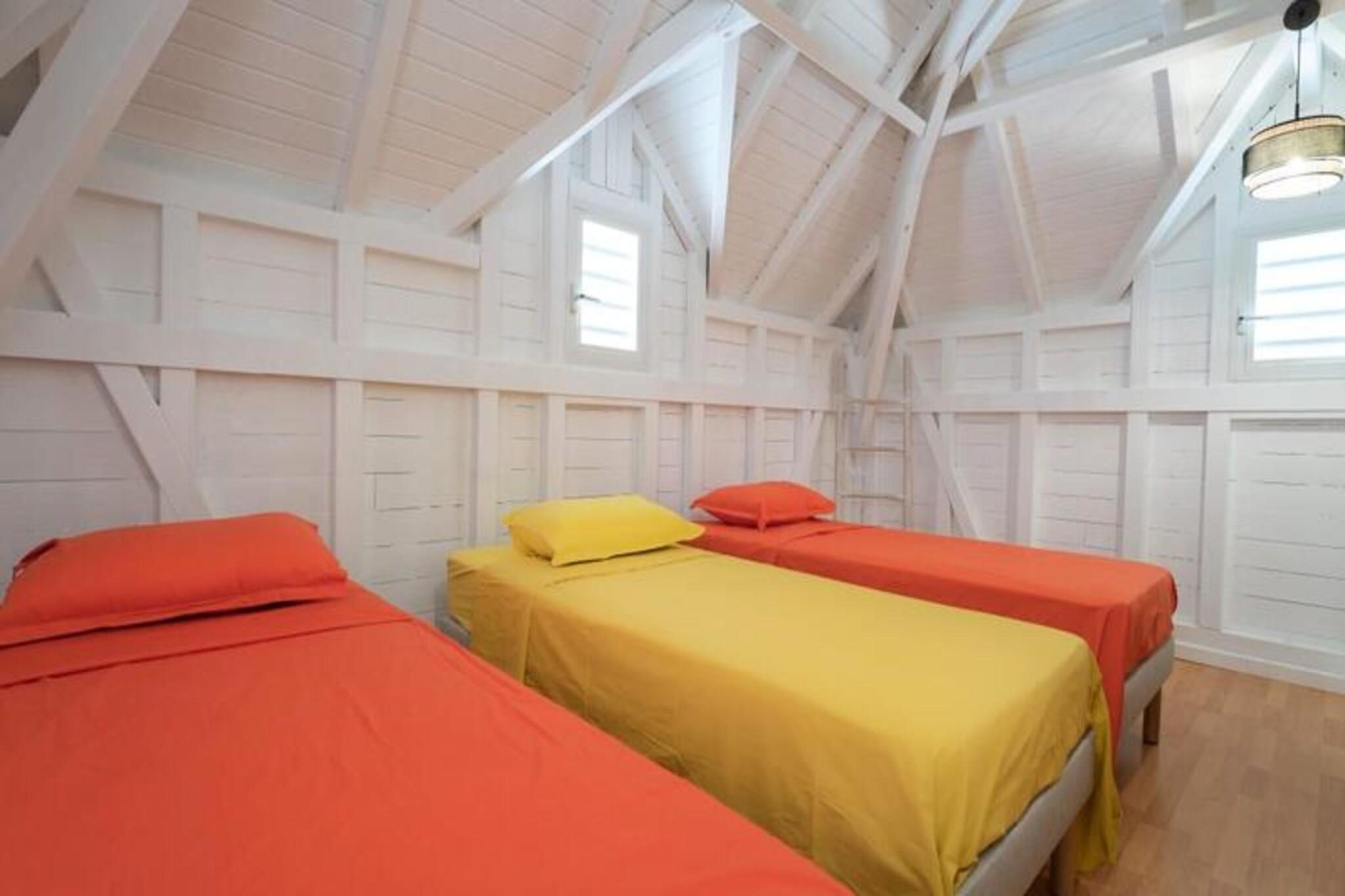Denne tropiske villa tilbyder et elegant og fredeligt tilflugtssted med tre soveværelser med aircondition, perfekt til op til 6 gæster. Det store soveværelse, som ligger på øverste etage, har en queensize-seng, et privat badeværelse med bruser og toilet samt et walk-in-closet. I stueetagen er der to ekstra soveværelser - et med en queen-size seng og et andet med to enkeltsenge - der deler et badeværelse med bruser. Villaen er ikke kæledyrsvenlig og opretholder et røgfrit miljø for at sikre en rolig atmosfære. Villaen er ideelt beliggende i Saint-François, kun 5 minutter fra fantastiske strande såsom Raisins Clairs, Anse à la Gourde og Anse-Champagne, hvor du kan nyde vandaktiviteter. Den pulserende bymidte, marinaen, den internationale golfbane og kasinoet ligger alle inden for 10 minutter og byder på masser af spise-, shopping- og underholdningsmuligheder. Derudover er den maleriske Pointe-des-Châteaux og øen Désirade en kort køretur væk, hvilket giver utrolige seværdigheder og oplevelser. Villaen har et fuldt udstyret køkken, ideelt til at tilberede måltider i et rummeligt opholds- og spiseområde i åbent plan. For ekstra bekvemmelighed inkluderer ejendommen et vandreservesystem, internetadgang og sengetøj af høj kvalitet. Rengøring er inkluderet for at sikre et behageligt ophold. En dedikeret concierge er tilgængelig for at hjælpe med udflugter, leje af køretøjer, lufthavnstransport og andre specielle ønsker, hvilket sikrer, at din ferie bliver problemfri og mindeværdig.
