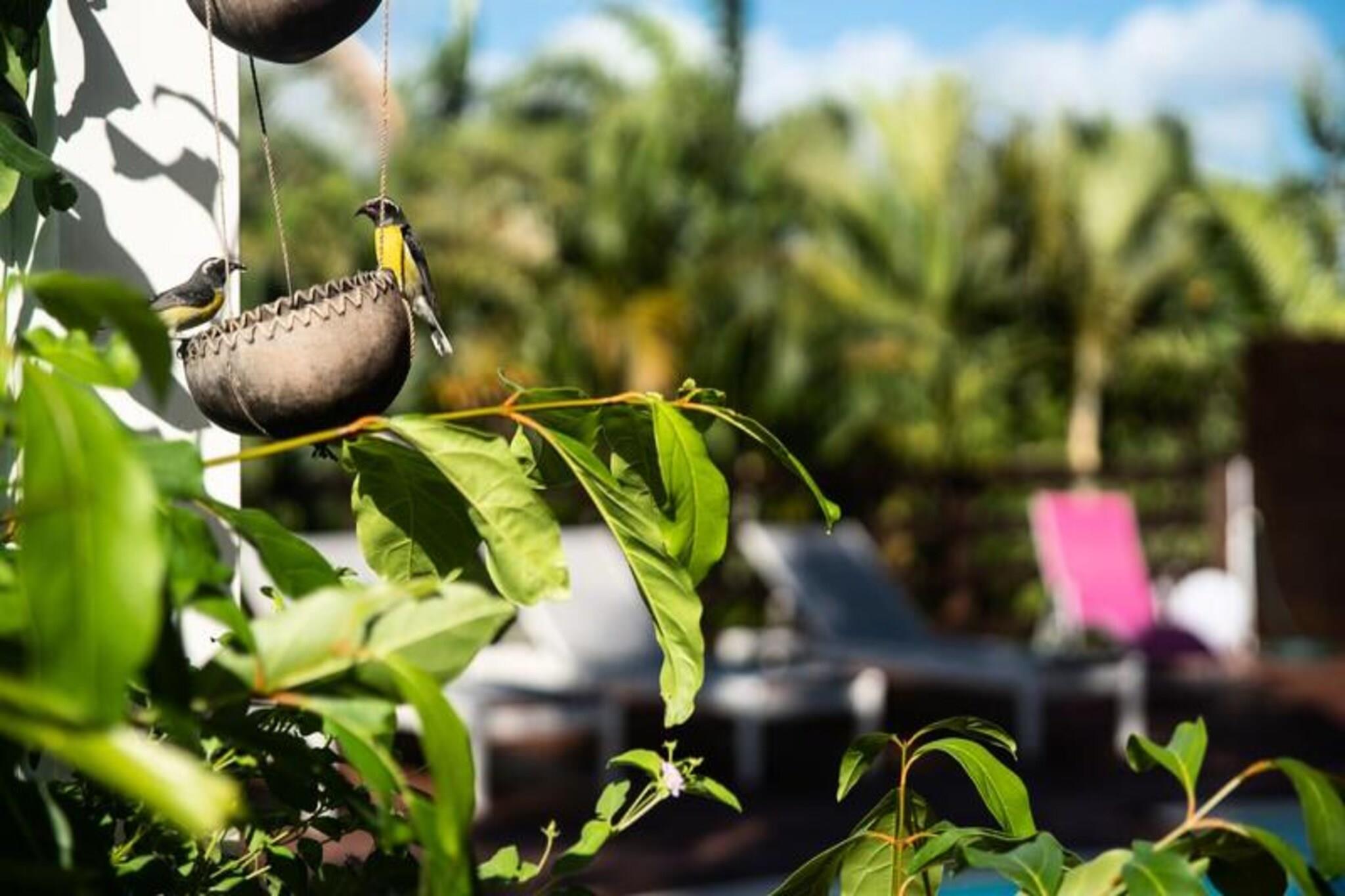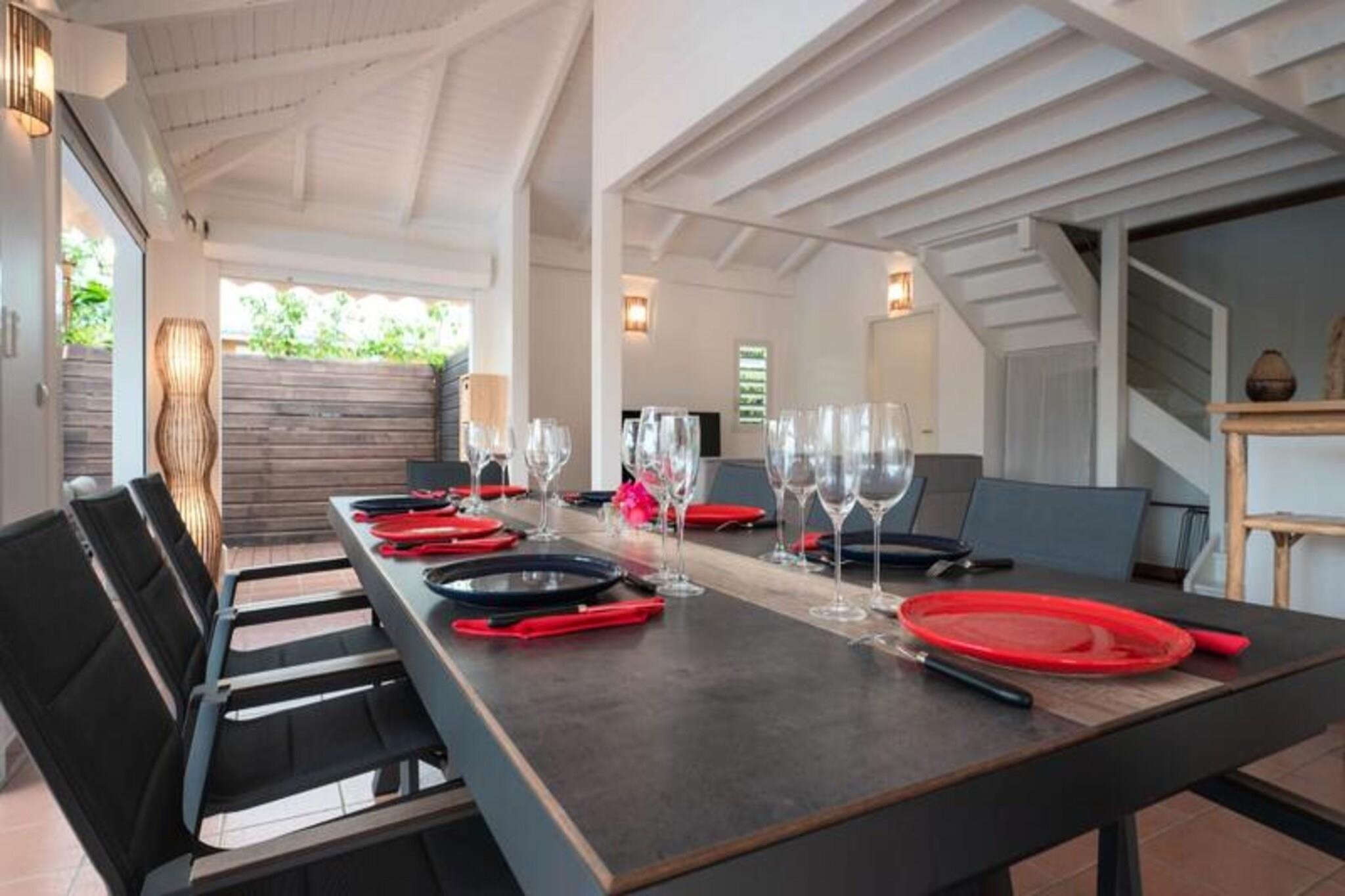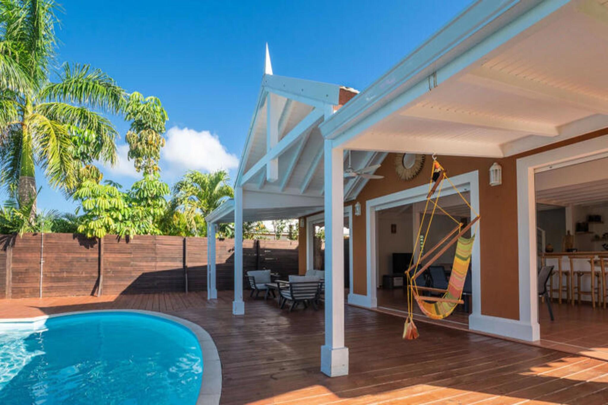 Denne tropiske villa tilbyder et elegant og fredeligt tilflugtssted med tre soveværelser med aircondition, perfekt til op til 6 gæster. Det store soveværelse, som ligger på øverste etage, har en queensize-seng, et privat badeværelse med bruser og toilet samt et walk-in-closet. I stueetagen er der to ekstra soveværelser - et med en queen-size seng og et andet med to enkeltsenge - der deler et badeværelse med bruser. Villaen er ikke kæledyrsvenlig og opretholder et røgfrit miljø for at sikre en rolig atmosfære. Villaen er ideelt beliggende i Saint-François, kun 5 minutter fra fantastiske strande såsom Raisins Clairs, Anse à la Gourde og Anse-Champagne, hvor du kan nyde vandaktiviteter. Den pulserende bymidte, marinaen, den internationale golfbane og kasinoet ligger alle inden for 10 minutter og byder på masser af spise-, shopping- og underholdningsmuligheder. Derudover er den maleriske Pointe-des-Châteaux og øen Désirade en kort køretur væk, hvilket giver utrolige seværdigheder og oplevelser. Villaen har et fuldt udstyret køkken, ideelt til at tilberede måltider i et rummeligt opholds- og spiseområde i åbent plan. For ekstra bekvemmelighed inkluderer ejendommen et vandreservesystem, internetadgang og sengetøj af høj kvalitet. Rengøring er inkluderet for at sikre et behageligt ophold. En dedikeret concierge er tilgængelig for at hjælpe med udflugter, leje af køretøjer, lufthavnstransport og andre specielle ønsker, hvilket sikrer, at din ferie bliver problemfri og mindeværdig.