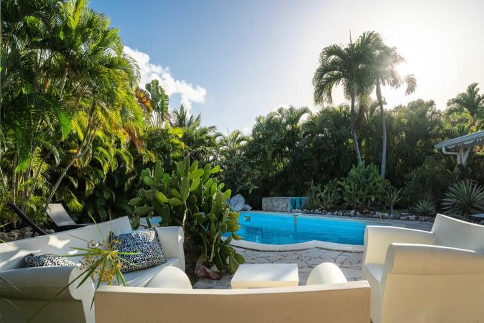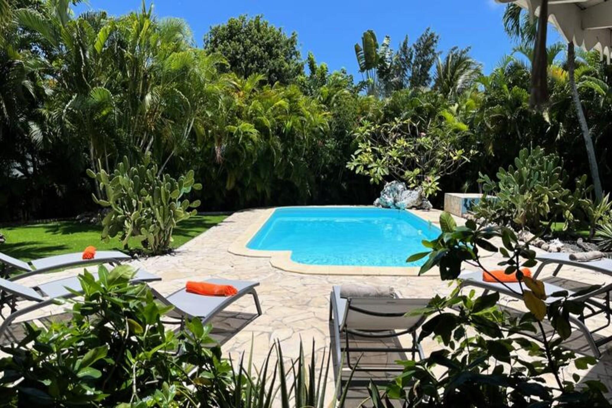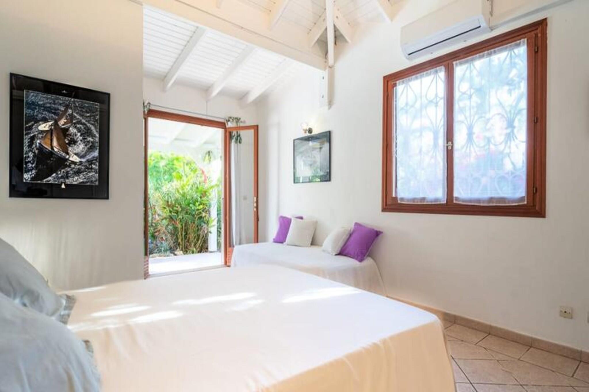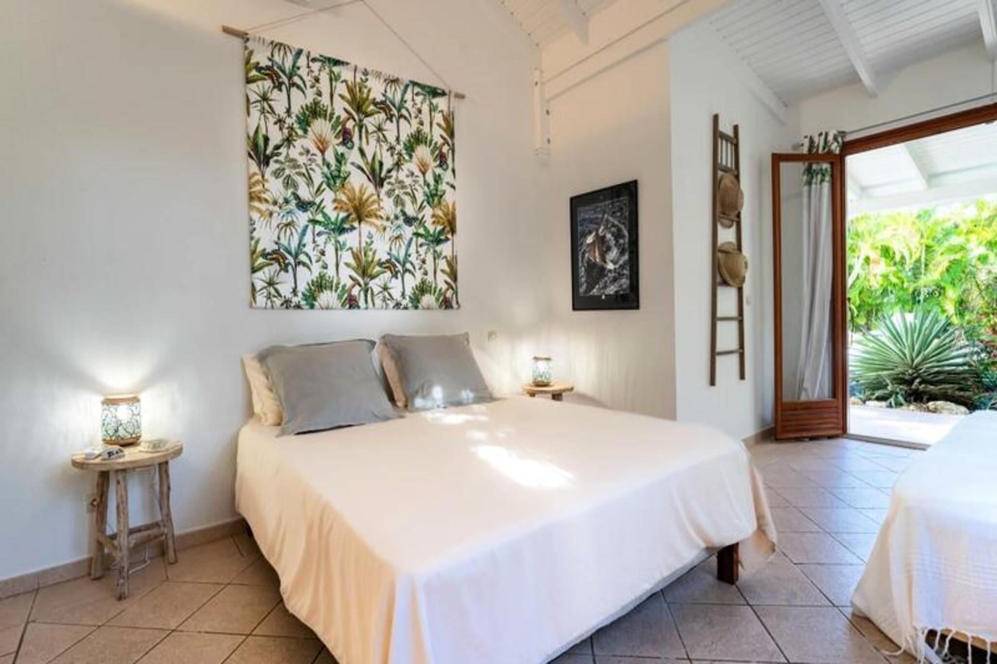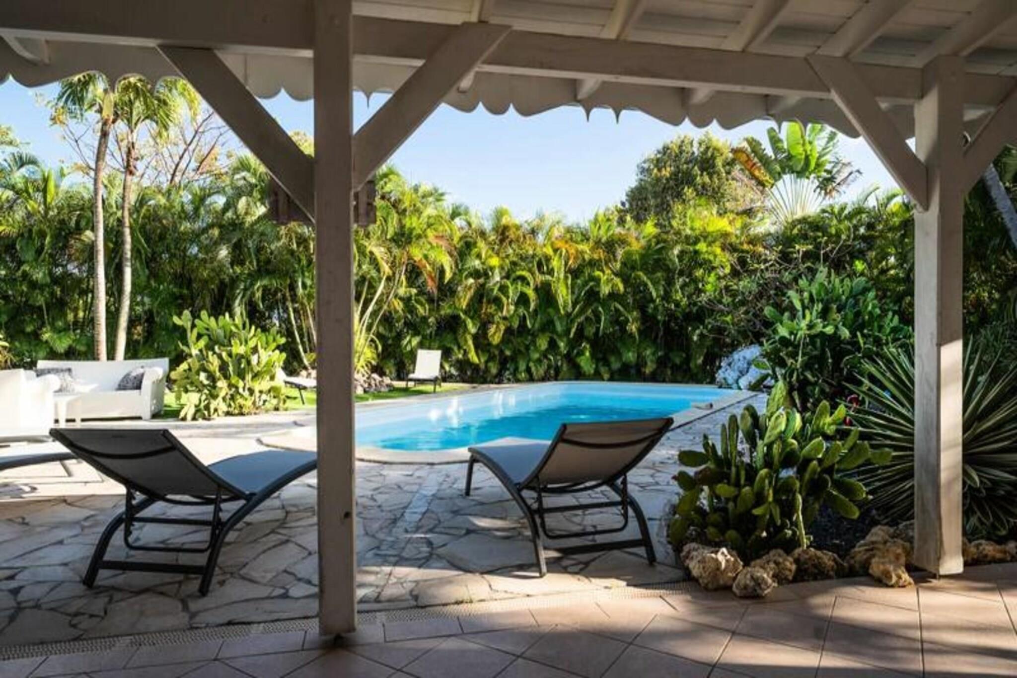 Denne smukke villa tilbyder et intimt og privat tilflugtssted beliggende i frodige grønne områder. Det har 4 soveværelser med aircondition, hver med eget badeværelse, og 2 værelser, der åbner direkte ud til en rummelig terrasse. Villaen har også 3 toiletter, en åben garage til to køretøjer og en stor swimmingpool med et område til solbadning. Kæledyr er ikke tilladt, og villaen tilbyder luksusfaciliteter såsom håndklæder og sengetøj inkluderet, samt et vandreservesystem for at sikre kontinuerlig vandforsyning. Beliggende kun 3 km fra strandene og faciliteterne, er villaen et fremragende sted for at udforske Guadeloupe. Den pulserende by Saint-François byder på butikker, markeder, et supermarked og en række restauranter. Den nærliggende Marina de Saint-François tilbyder sammen med den internationale golfbane og kasinoet underholdning og spisemuligheder. Populære strande såsom Raisins Clairs og Anse à la Gourde ligger kun få minutter væk, og havnen i Saint-François byder på vandsport såsom surfing og Wing Foil. Indvendigt kan villaen prale af et fuldt udstyret amerikansk køkken med masser af opbevaringsplads og en stor, luftig stue med katedrallofter. Den storslåede terrasse og den omkringliggende have giver en ideel ramme for afslapning. Ejendommen administreres med sans for detaljer, der sikrer, at alle dine behov bliver opfyldt, fra kvalitets rengøring til eksklusive concierge-tjenester til udflugter, biludlejning og meget mere.