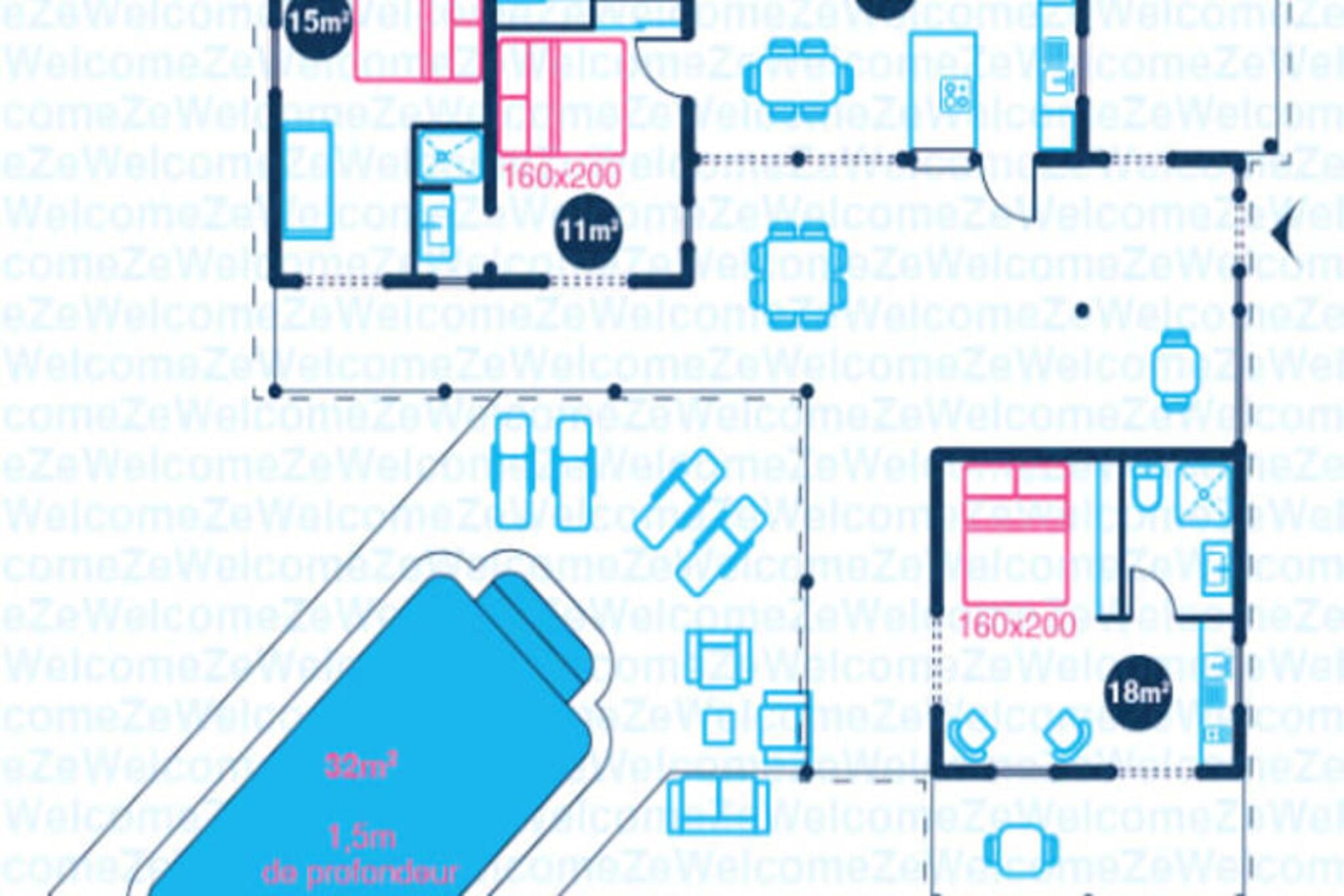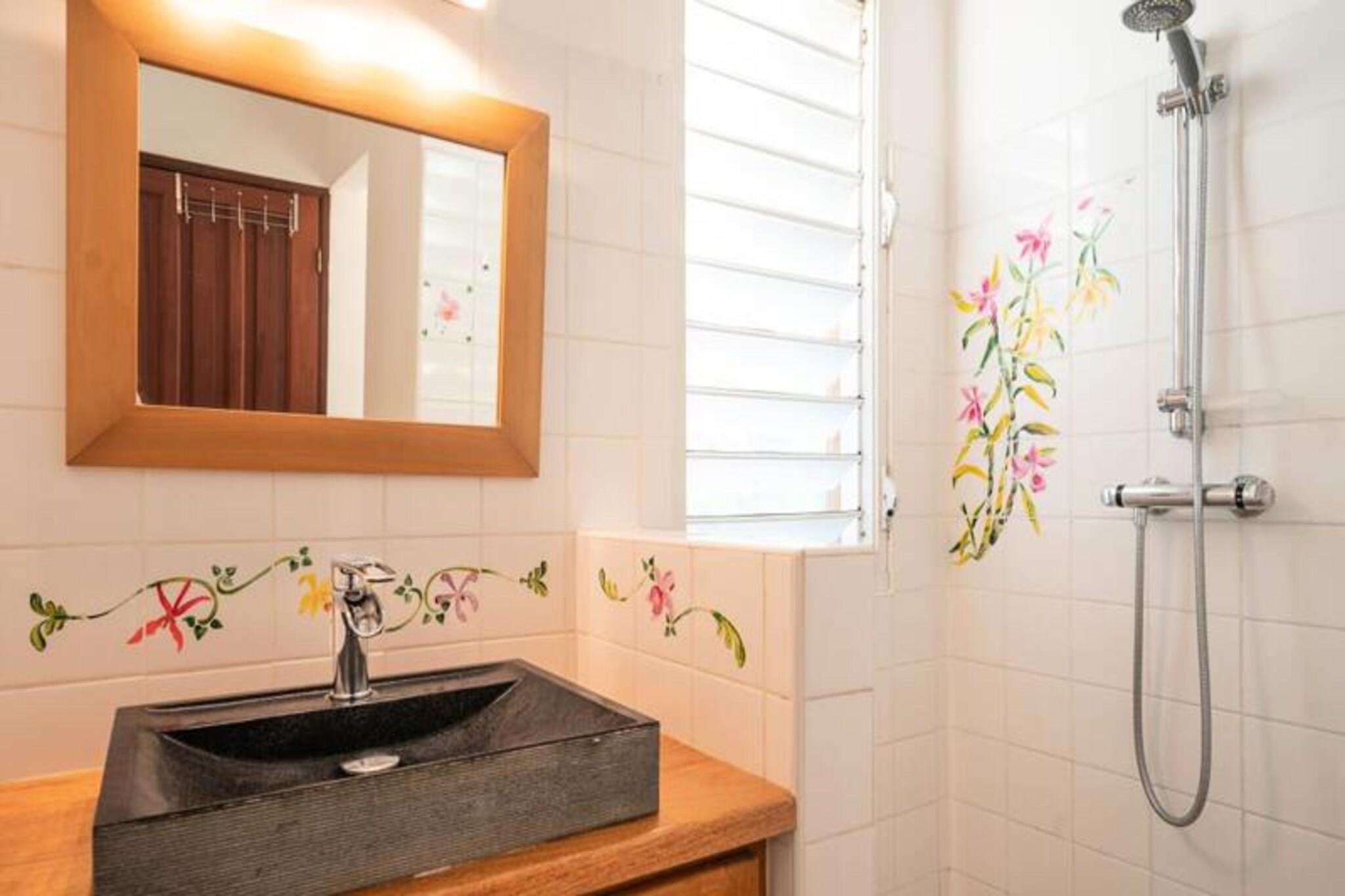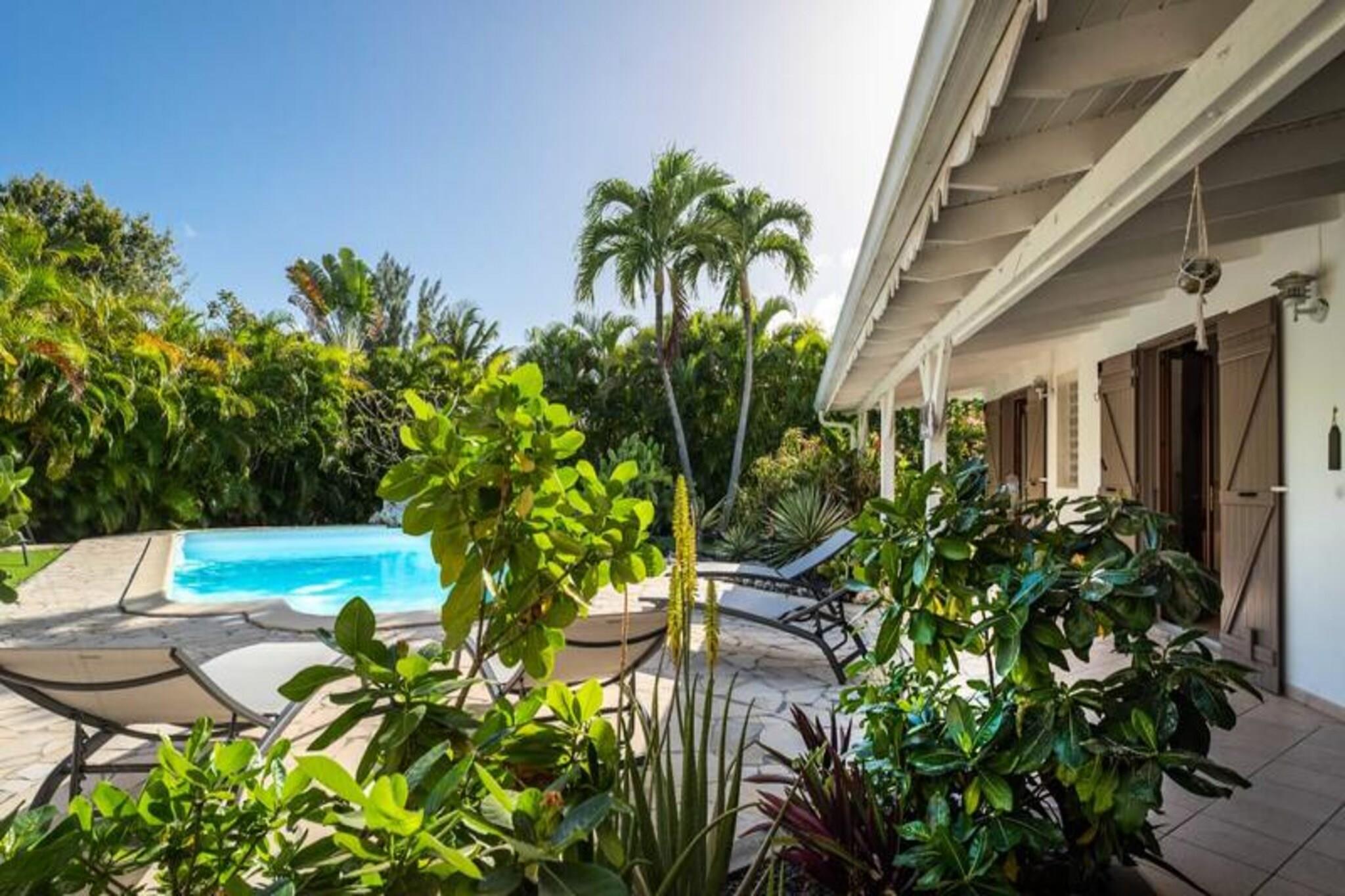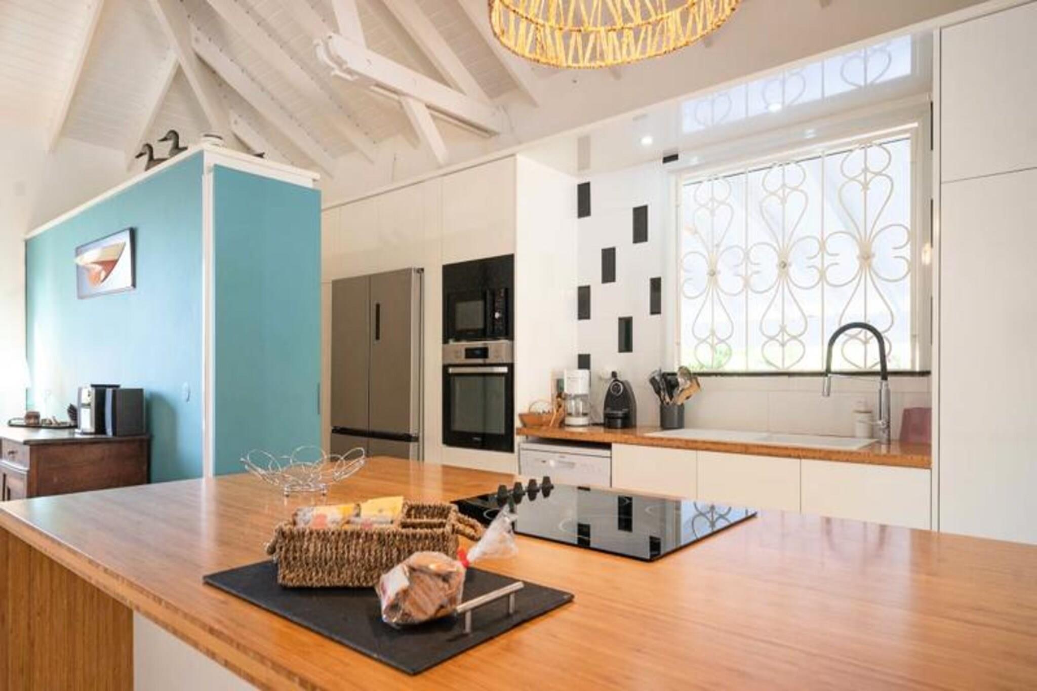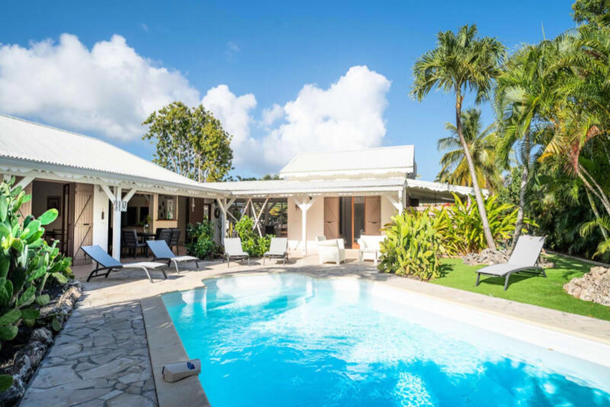 Denne smukke villa tilbyder et intimt og privat tilflugtssted beliggende i frodige grønne områder. Det har 4 soveværelser med aircondition, hver med eget badeværelse, og 2 værelser, der åbner direkte ud til en rummelig terrasse. Villaen har også 3 toiletter, en åben garage til to køretøjer og en stor swimmingpool med et område til solbadning. Kæledyr er ikke tilladt, og villaen tilbyder luksusfaciliteter såsom håndklæder og sengetøj inkluderet, samt et vandreservesystem for at sikre kontinuerlig vandforsyning. Beliggende kun 3 km fra strandene og faciliteterne, er villaen et fremragende sted for at udforske Guadeloupe. Den pulserende by Saint-François byder på butikker, markeder, et supermarked og en række restauranter. Den nærliggende Marina de Saint-François tilbyder sammen med den internationale golfbane og kasinoet underholdning og spisemuligheder. Populære strande såsom Raisins Clairs og Anse à la Gourde ligger kun få minutter væk, og havnen i Saint-François byder på vandsport såsom surfing og Wing Foil. Indvendigt kan villaen prale af et fuldt udstyret amerikansk køkken med masser af opbevaringsplads og en stor, luftig stue med katedrallofter. Den storslåede terrasse og den omkringliggende have giver en ideel ramme for afslapning. Ejendommen administreres med sans for detaljer, der sikrer, at alle dine behov bliver opfyldt, fra kvalitets rengøring til eksklusive concierge-tjenester til udflugter, biludlejning og meget mere.