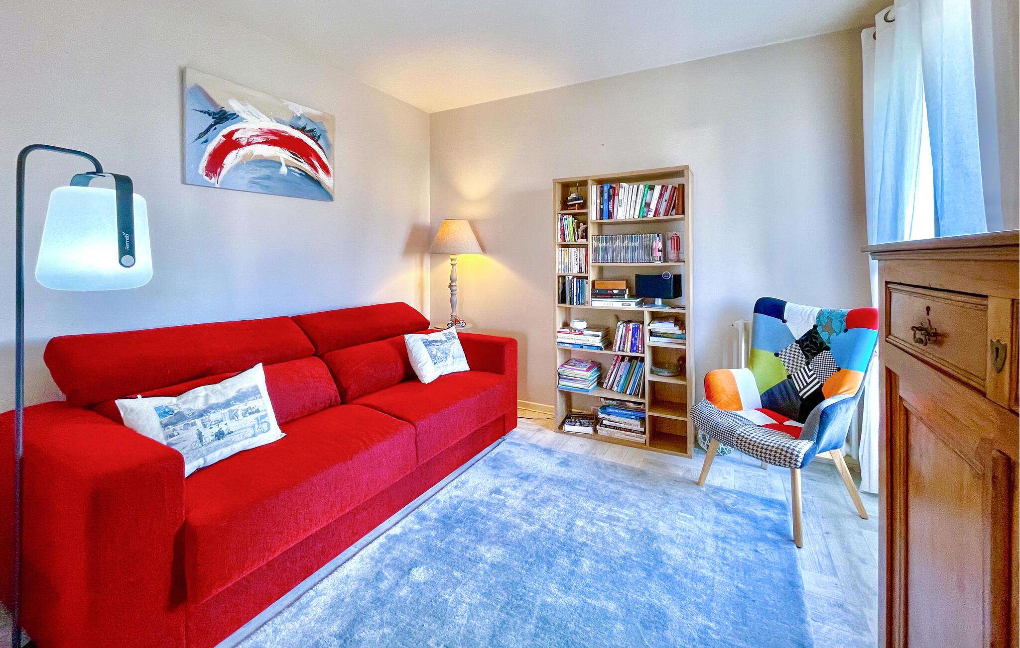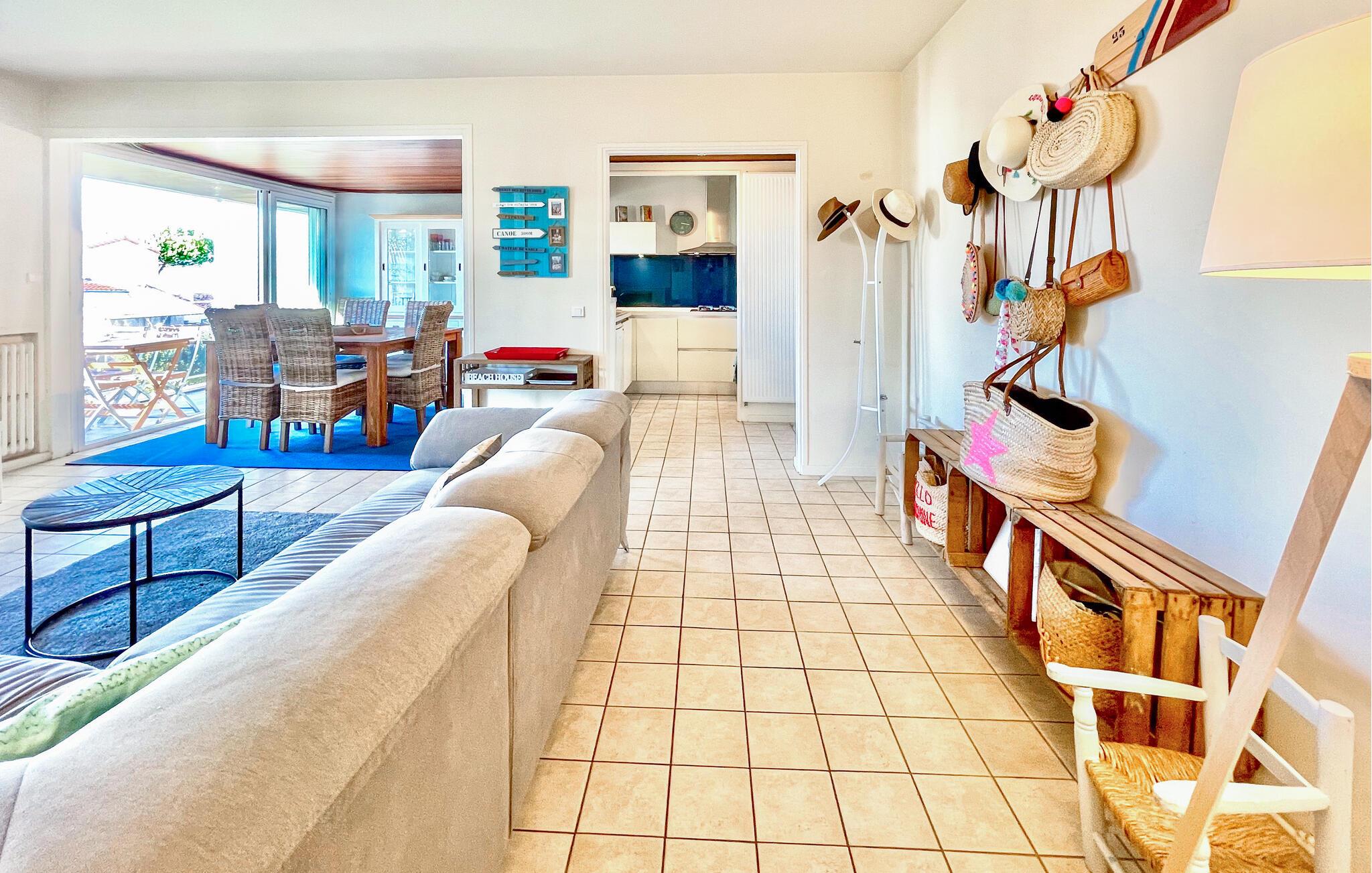 Denne charmerende ferielejlighed er kun få skridt fra sandstranden og byder jer velkommen med en lys og venlig atmosfære. Glæd jer til harmoniske måltider og hyggelige spilleaftener ved det indbydende spisebord eller på den rummelige sofagruppe. Den hyggelige læsestue tilbyder et roligt tilflugtssted for dem, der ønsker at fordybe sig i jeres ferielæsning.