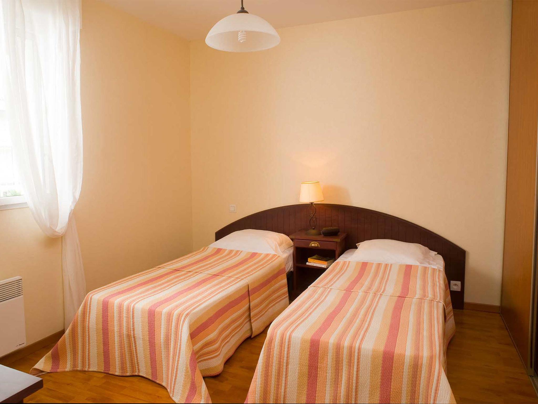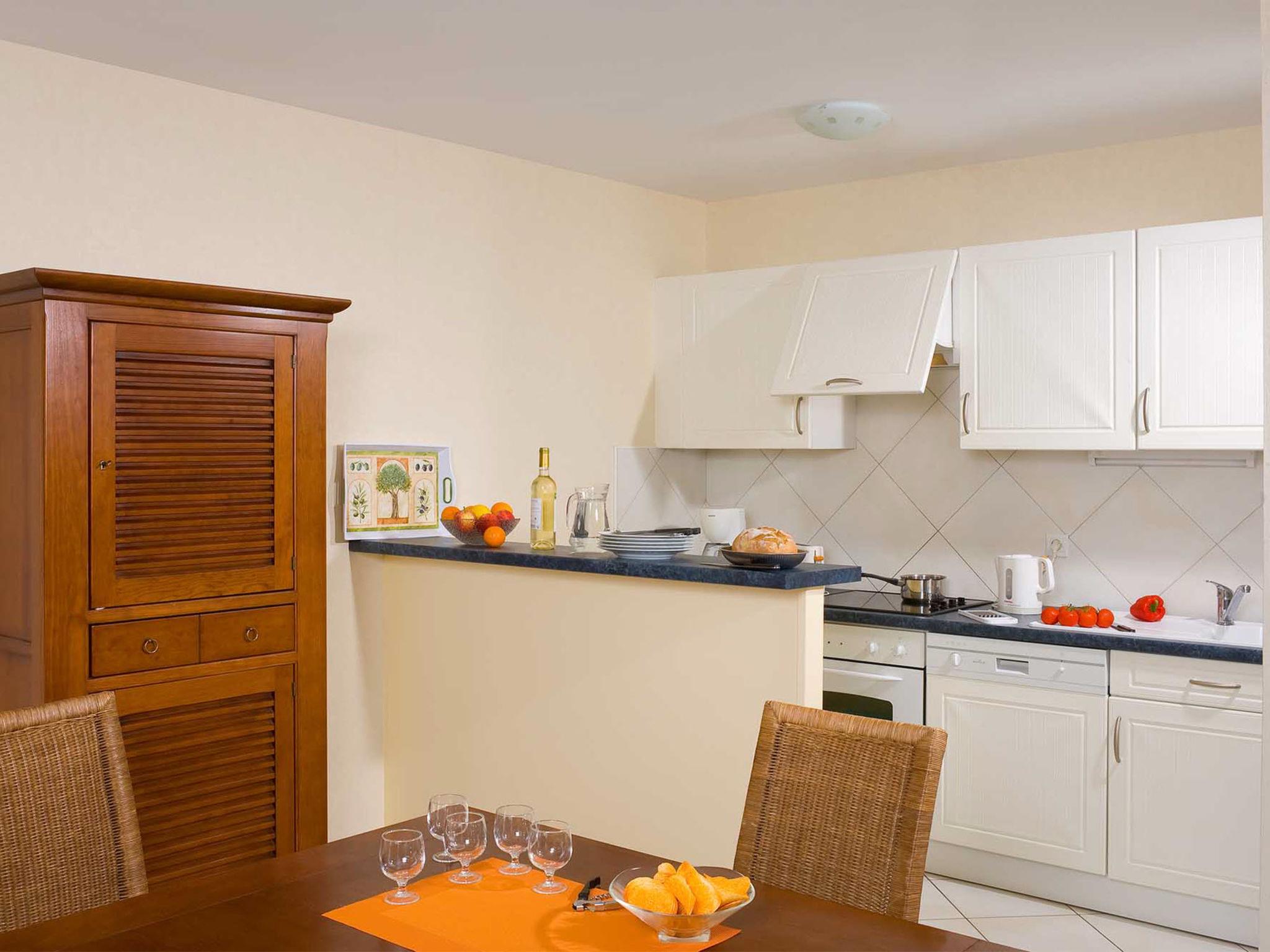 "Le Domaine de Fontenelles", 2-room apartment 46 m2. Bright, practical and beautiful furnishings: living/sleeping room with 1 double sofabed, dining table and TV can be hired. Exit to the balcony. 1 room with 2 sleeping facilities. Kitchenette (4 hot plates, dishwasher, toaster, kettle, electric coffee machine). Bathroom, sep. WC. Electric heating. Balcony or terrace. Terrace furniture, balcony furniture. Please note: non-smokers only. Maximum 2 pets/ dogs allowed. Smoke alarm, fire extinguisher.