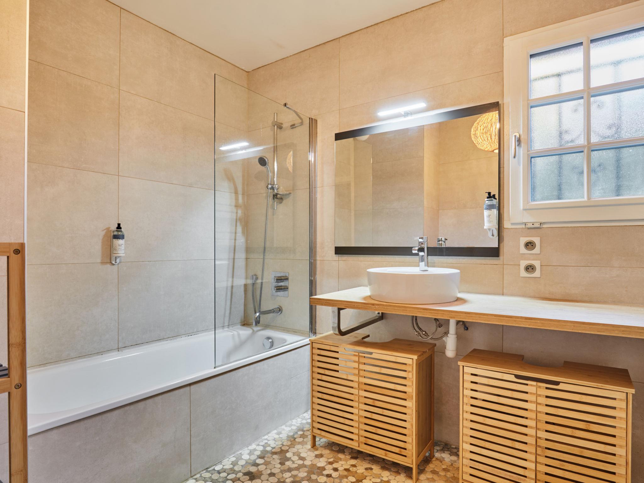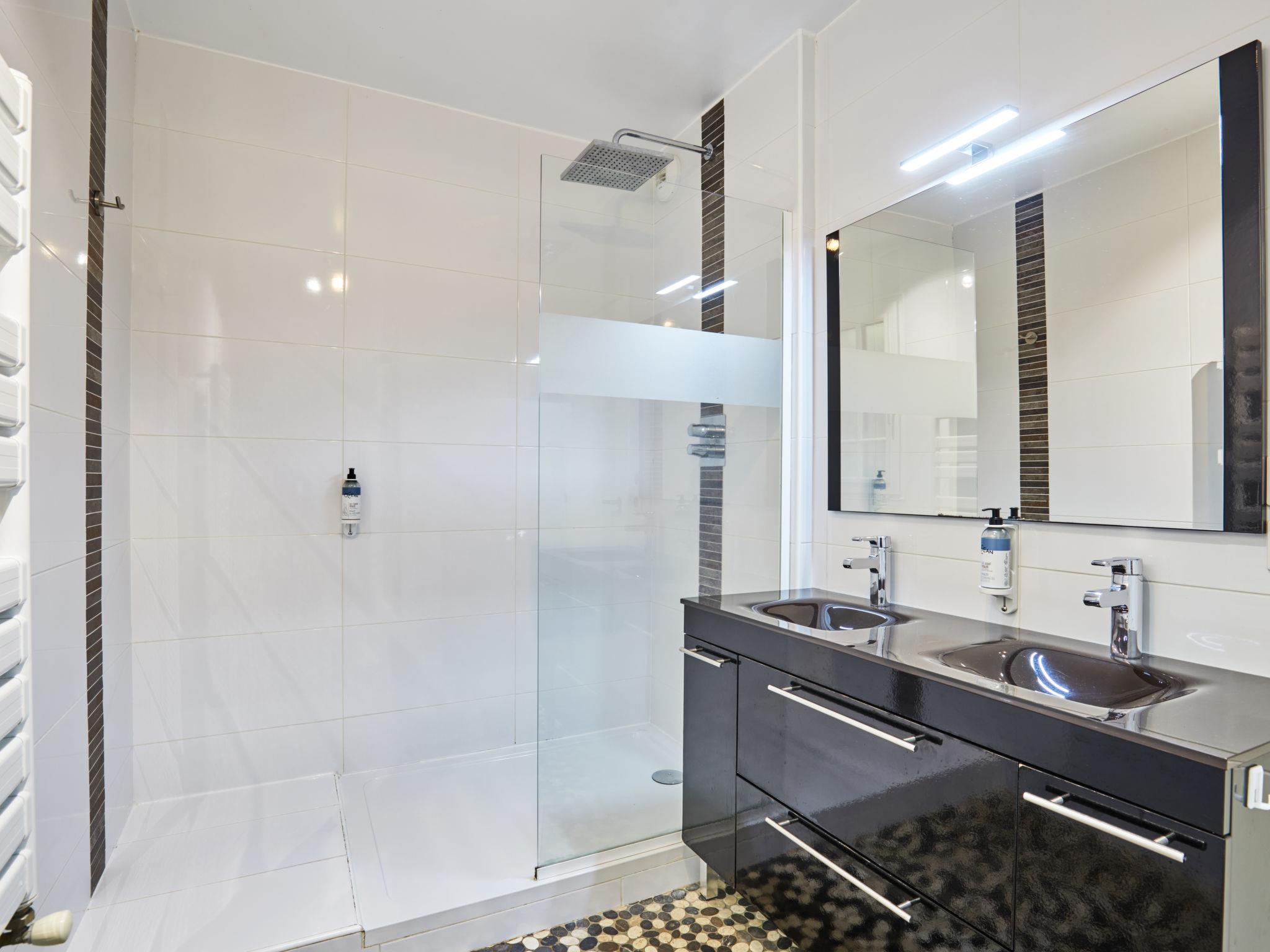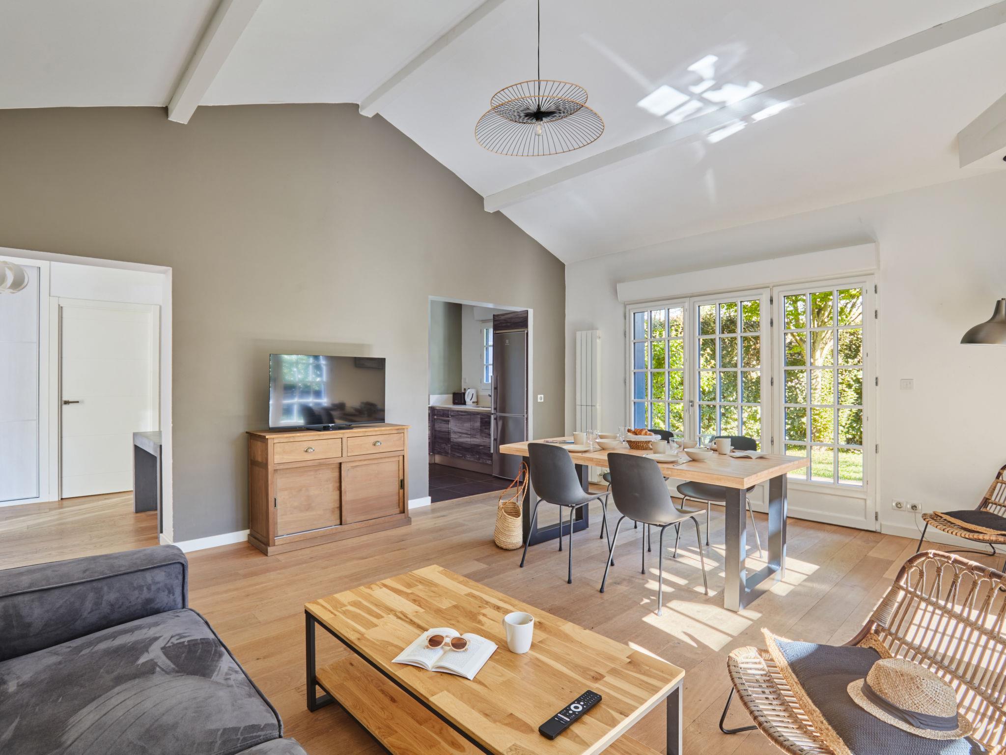 "Villas Odalys Collection Domaine de Lana", 5-room house 100 to 125 m2 on 2 levels. Modern and tasteful furnishings: living room with dining table and TV (flat screen). Exit to the terrace. 1 room with 1 french bed (140 cm, length 190 cm). Open kitchen (oven, dishwasher, 3 ceramic glass hob hotplates, toaster, kettle, microwave, freezer, electric coffee machine). Shower, sep. WC, double hand-basin. Upper floor: 2 rooms with sloping ceilings, each room with 2 beds (90 cm, length 190 cm). 1 room with sloping ceilings with 1 french bed (140 cm, length 190 cm), TV (flat screen). Exit to the balcony. Sep. WC, bath or shower. Gas heating. Small balcony, terrace, small garden. Terrace furniture. Facilities: washing machine, children's high chair, baby cot. Internet (WiFi, free). Garage. Please note: non-smoking house. Maximum 2 pets/ dogs allowed. Smoke alarm.