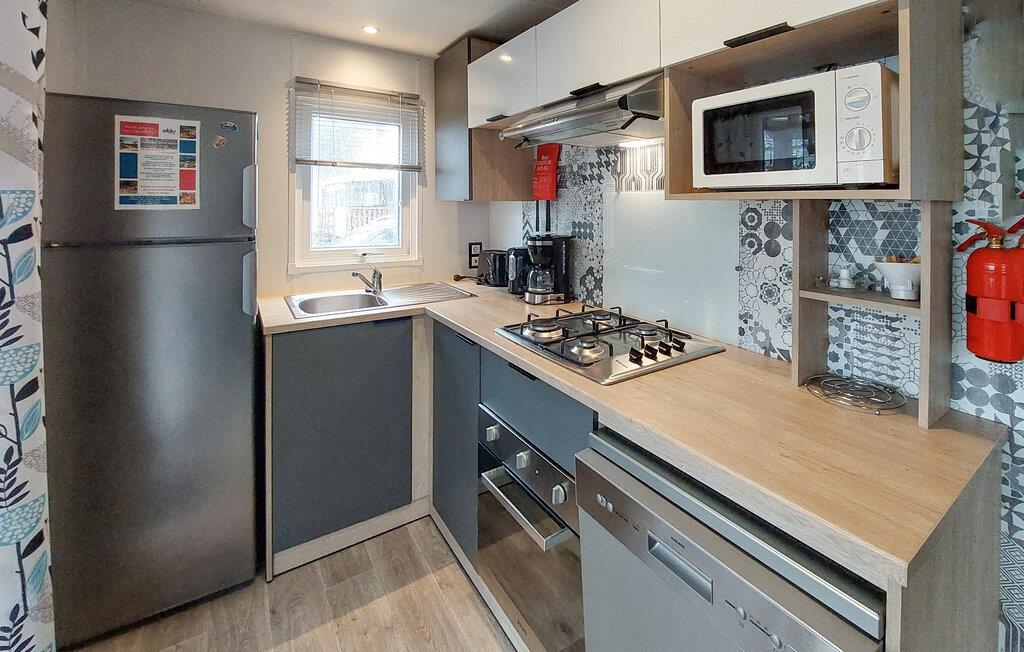 Bliv overrasket af den hyggelige atmosfære i dette moderne møblerede mobilhome. Tilbered solide måltider, planlæg jeres aktiviteter ved det indbydende spisebord og afslut en lang dag med en sjov spilleaften.