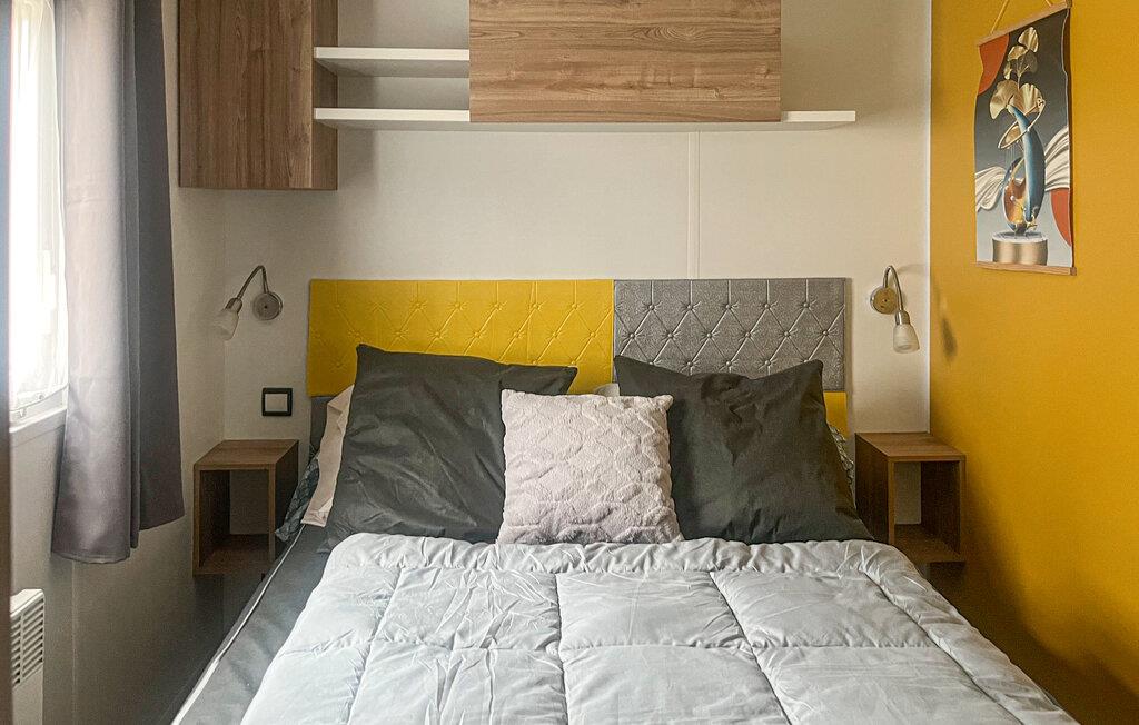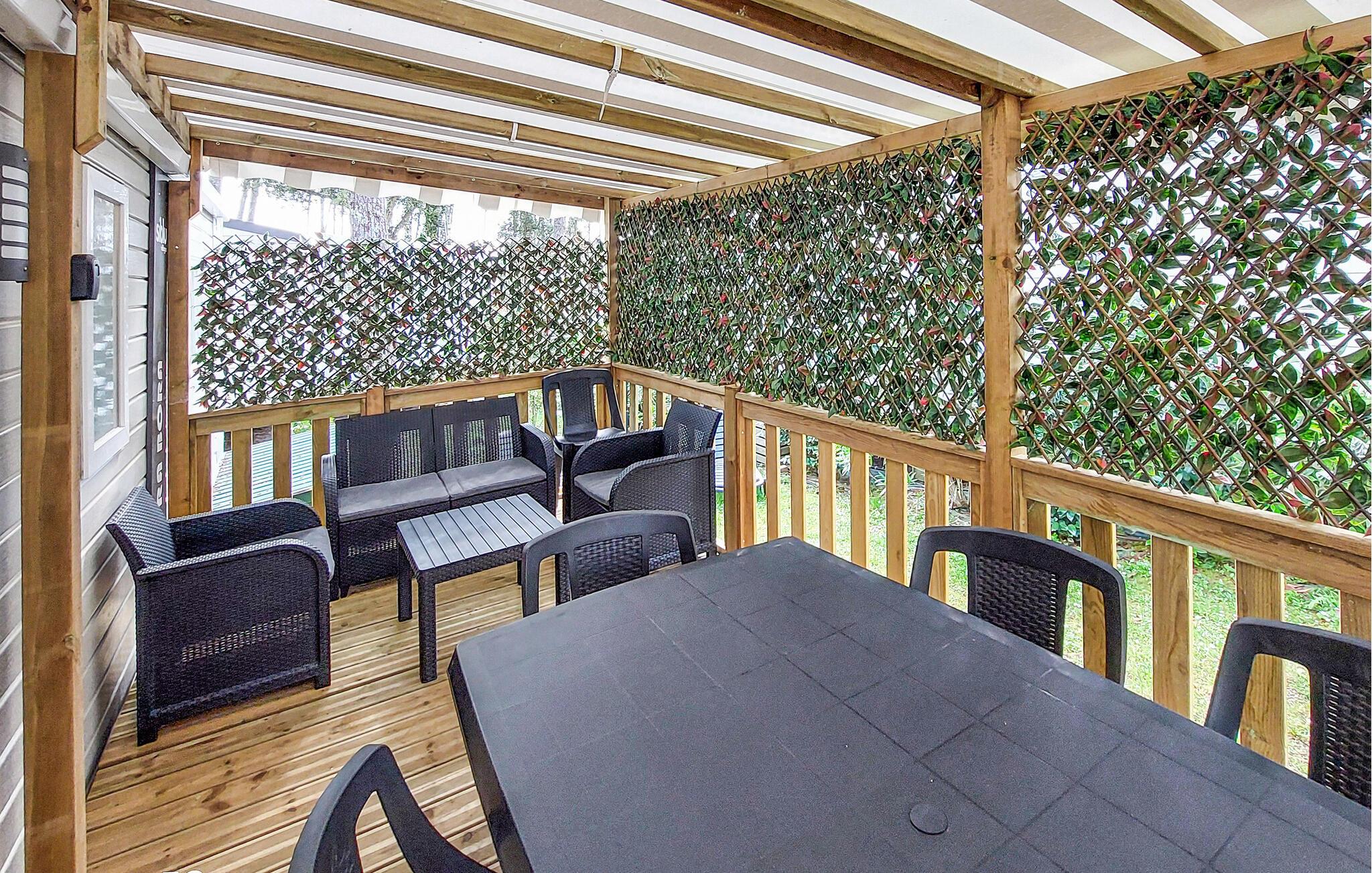 Den overdækkede terrasse er det ideelle sted at begynde dagene med en kop kaffe eller slappe af om aftenen med et glas vin. En plancha lægger op til at tilberede lækre måltider udendørs. I bor på en campingplads, her finder I en restaurant, en bar, en petanquebane, en tennisbane, en købmand og meget mere. Forskellige shows og aktiviteter finder sted hver aften i den store eventhal. Campingpladsen har to opvarmede pools og et vandfaldsområde for børn og voksne.