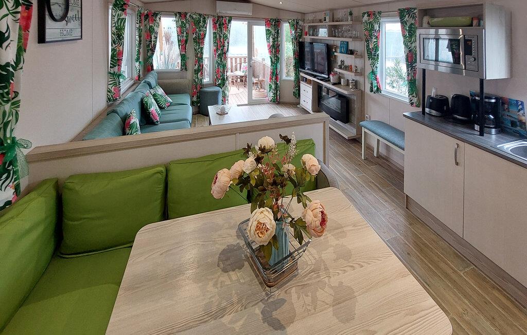 Dette moderne og smagfulde mobilhome tilbyder jer en behagelig base for afslappende ture med familien. Tilbered lækre pizzaer i det rummelige, åbne køkken, tag plads i den indbydende spiseplads og gør jer godt tilpas i den hyggelige sofa til en spilleaften.