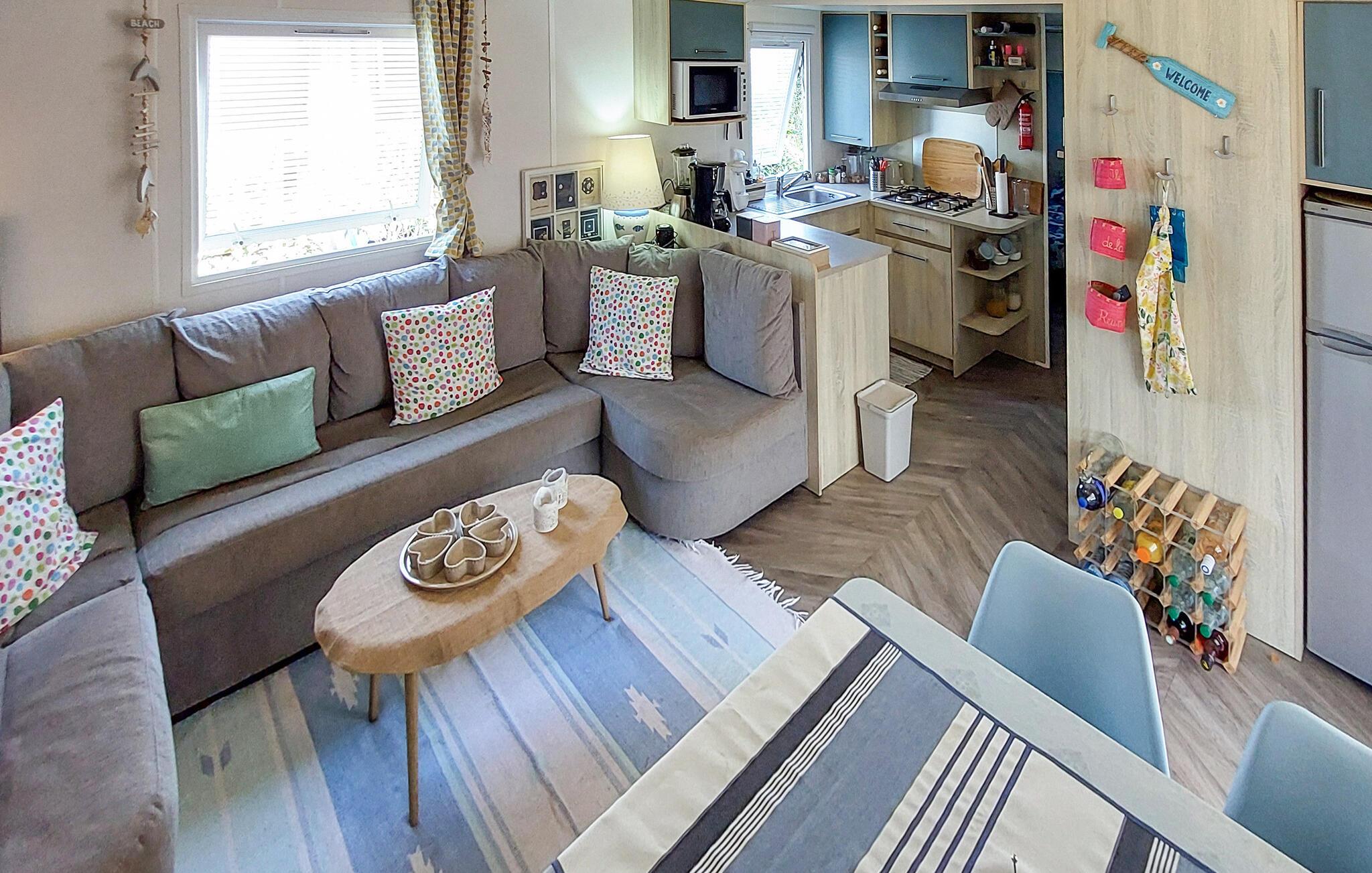 Oplev en afslappende ferie i et hyggeligt mobilhome med en naturlig atmosfære og fritidsaktiviteter.