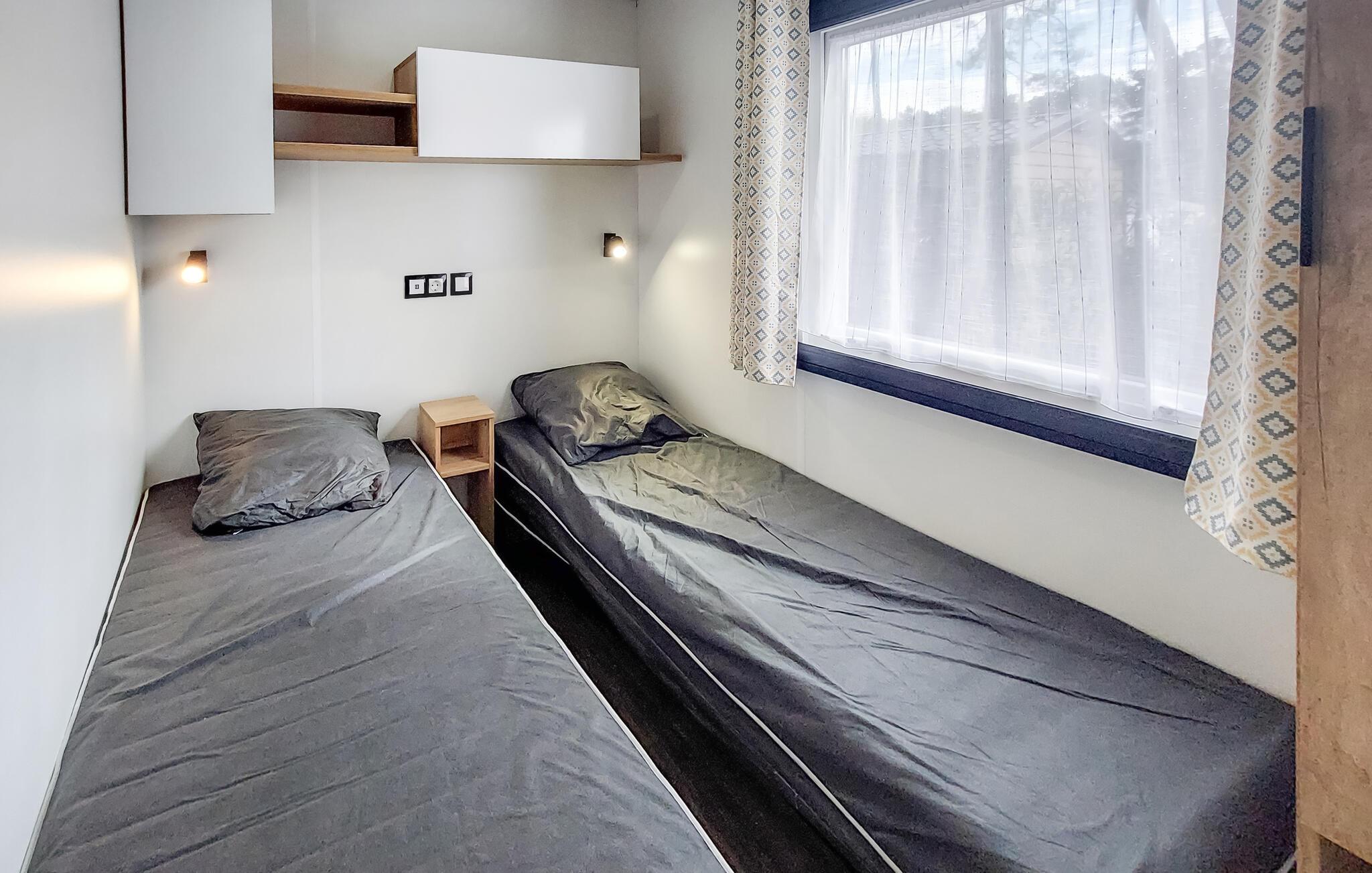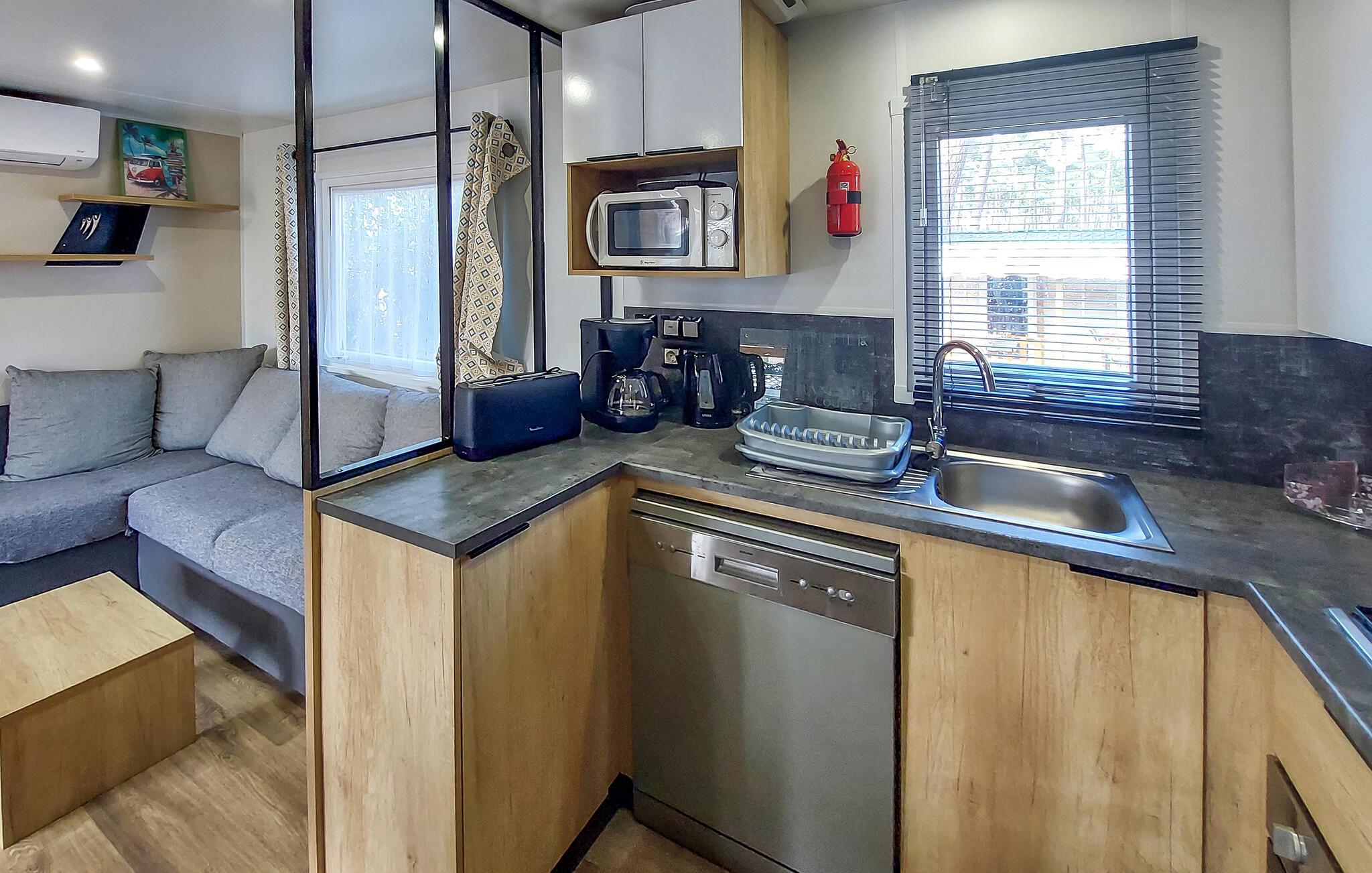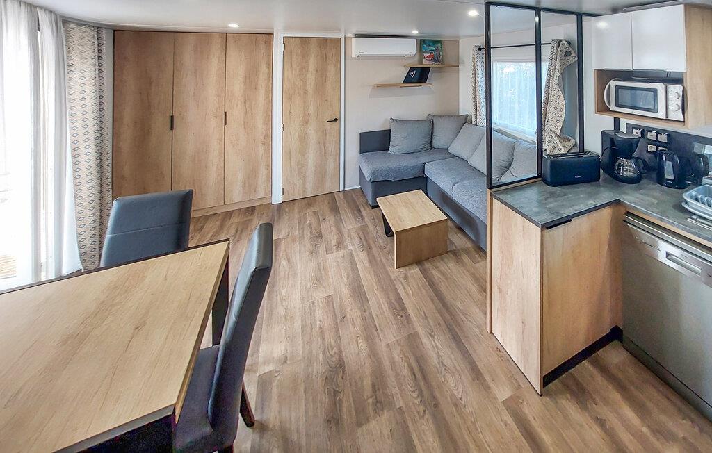 Undslip hverdagens travlhed og nyd en spændende ferie i dette charmerende feriehus. Dette mobilehome byder jer velkommen til en campingplads nær attraktive seværdigheder og tilbyder en komfortabel base, mens I slapper af sammen nær Atlanterhavskysten. Planlæg jeres aktiviteter til afslappende måltider, brug det indbydende spisebord til sjove spilleaftener, eller hyg jer sammen med jeres ferielæsning i det komfortable siddeområde. Server morgenmad på den dejlige veranda, snak der i den gyldne aftensol over et glas vin, og tilbered lækre måltider på grillen. Gå en tur langs Atlanterhavets brede sandstrande, lær at surfe eller flyve med hjemmelavede drager. Cykl gennem duftende fyrreskove og hold en picnic ved bredden af Lac de Léon, hvor I også kan prøve kanosejlads eller stå på paddleboard. Oplev Vielle-Saint-Girons og Moliets-et-Maa, smag regionale specialiteter på lokale markeder, og gå ikke glip af en tur til Courant d'Huchet Naturpark.