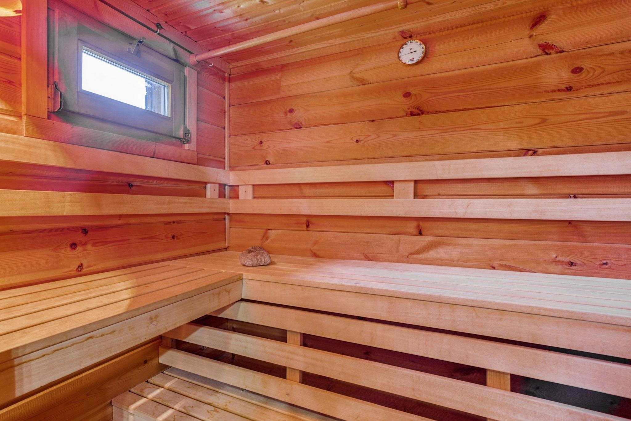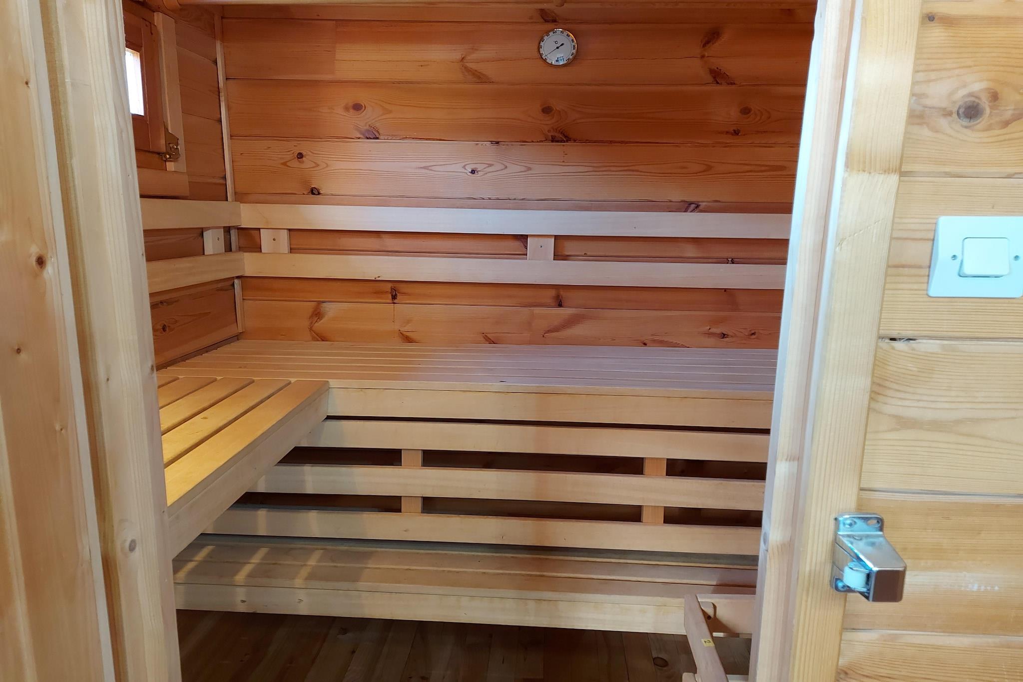 Køkken(elkedel, brødrister, komfur, kaffemaskine, combi-mikroovn, køle-fryseskab), stue / spisestue(Fjernsyn), soveværelse(dobbeltseng), soveværelse(dobbeltseng), badeværelse(bruser, håndvask, toilet), åbent rum(dobbeltseng), sauna, tørretumbler, vaskemaskine, have(indhegnet), havemøbler, grill