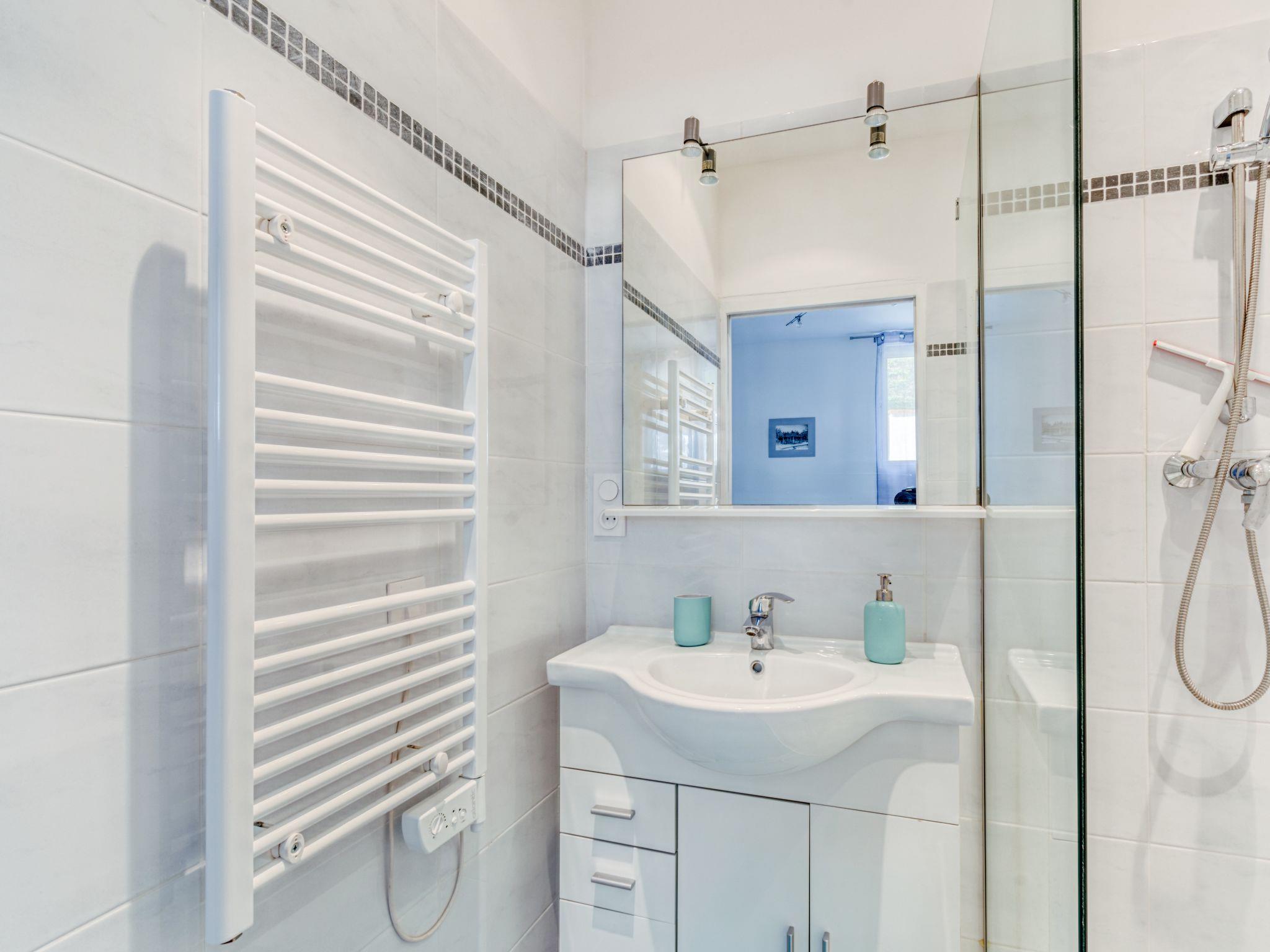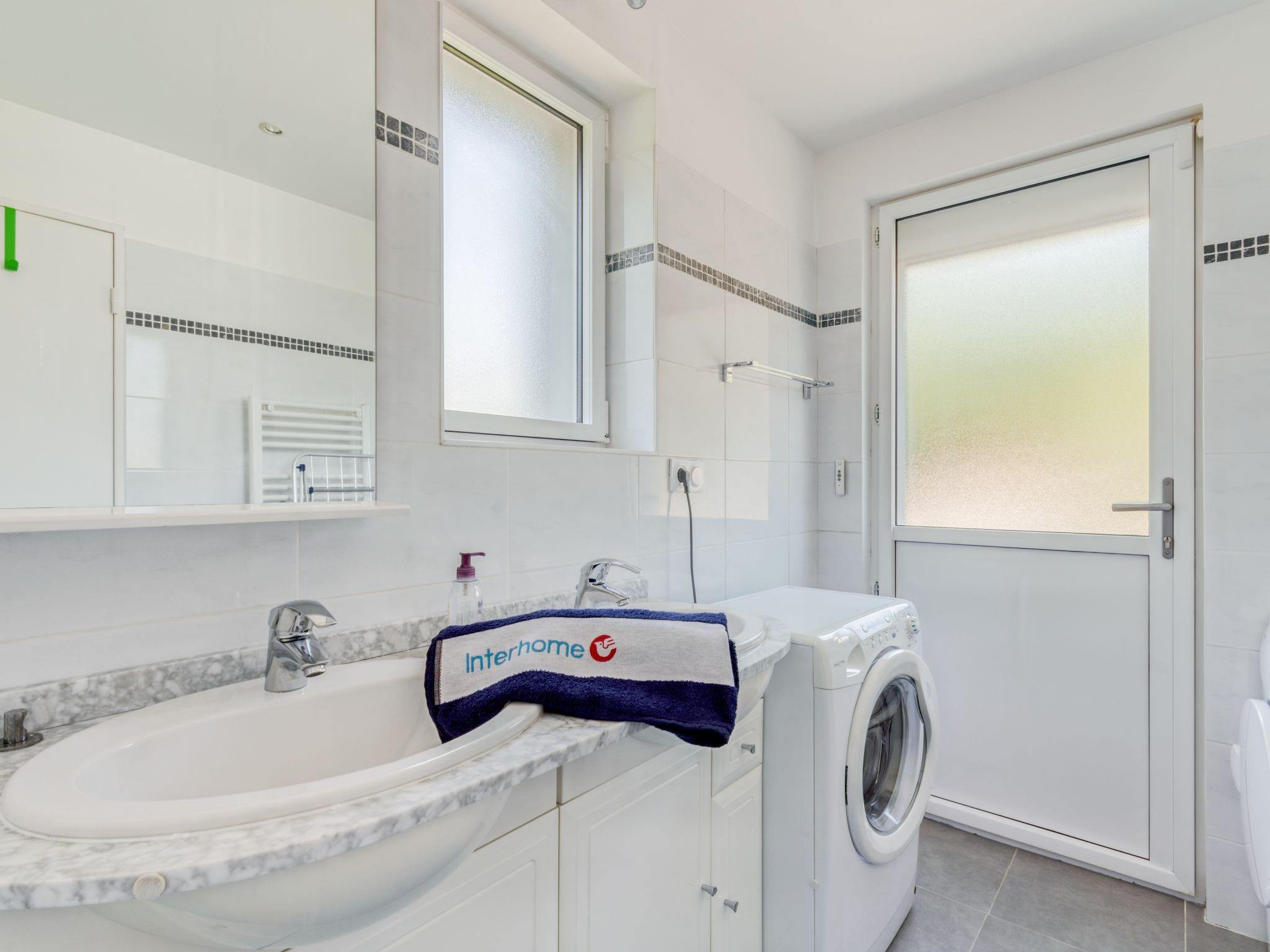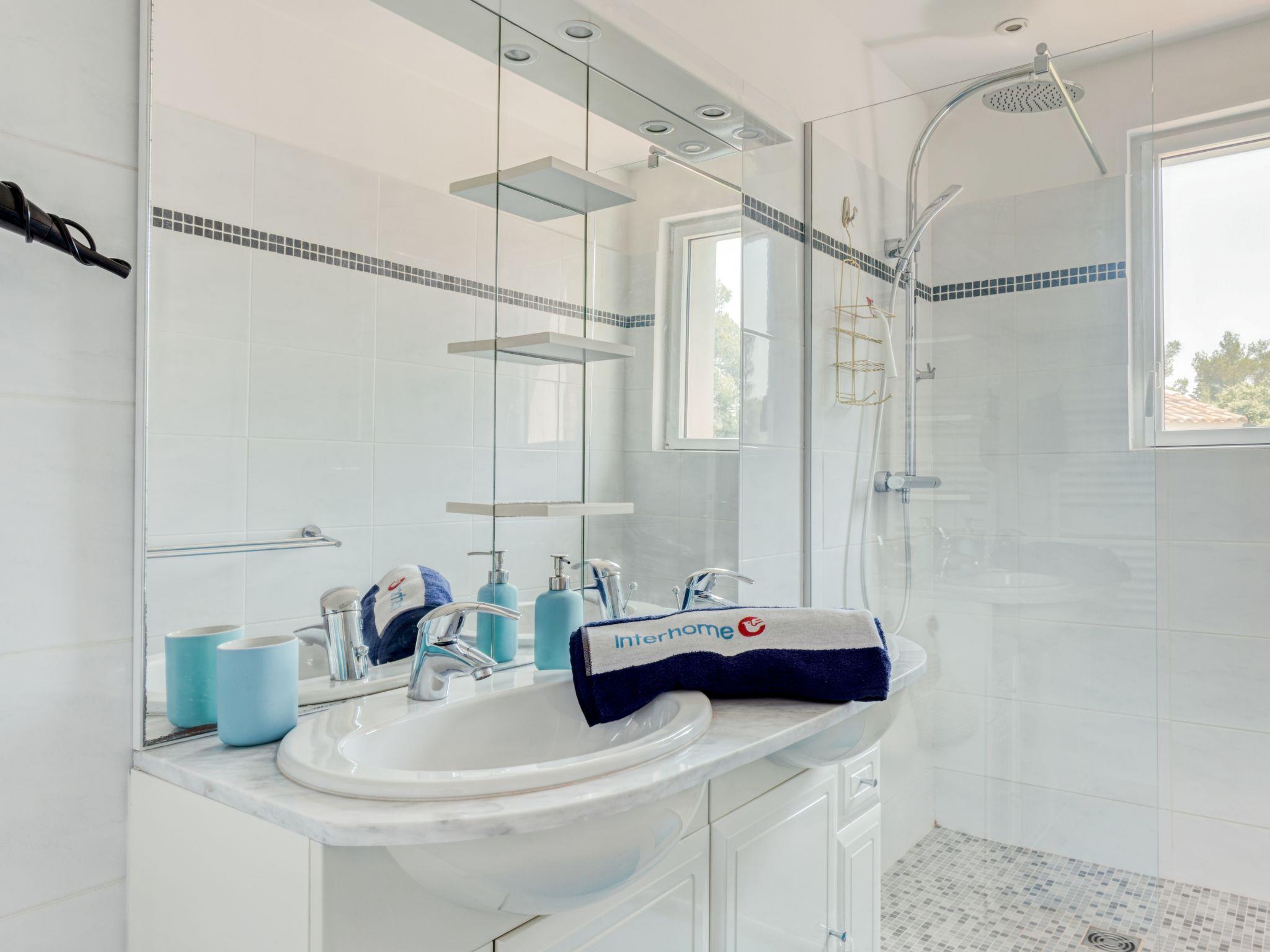 5-room house 160 m2 on 2 levels. Modern furnishings: living/dining room with dining table, TV, flat screen and electric heating. 1 room with 1 french bed (1 x 140 cm, length 190 cm), shower. Open kitchen (oven, dishwasher, 4 induction hot plates, toaster, kettle, microwave, freezer, electric coffee machine, Capsules for coffee machine (Nespresso) extra). Upper floor: 2 rooms, each room with 1 french bed (1 x 140 cm, length 190 cm). Exit to the balcony with bathroom, separate WC and double hand-basin. 1 room with 1 french bed (1 x 140 cm, length 190 cm), shower and double hand-basin. Exit to the balcony. Large terrace 30 m2. Terrace furniture, deck chairs. View of the swimming pool. Facilities: washing machine, dryer, iron. Internet (WiFi, free). Parking. Please note: non-smokers only. TV only FR. Smoke alarm.