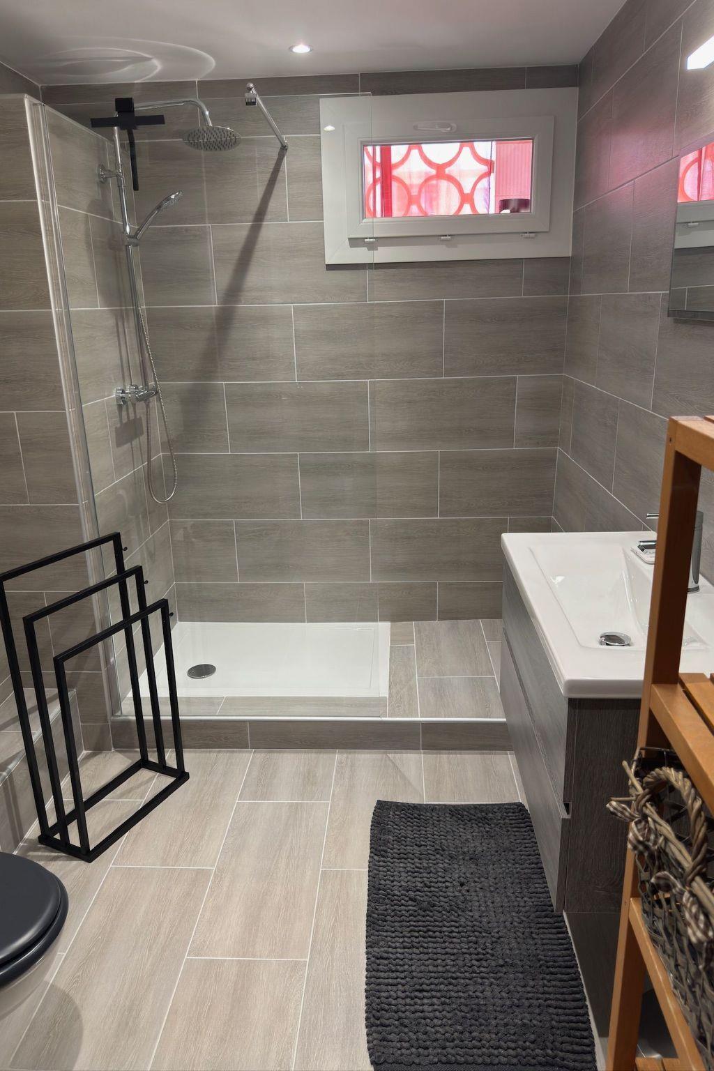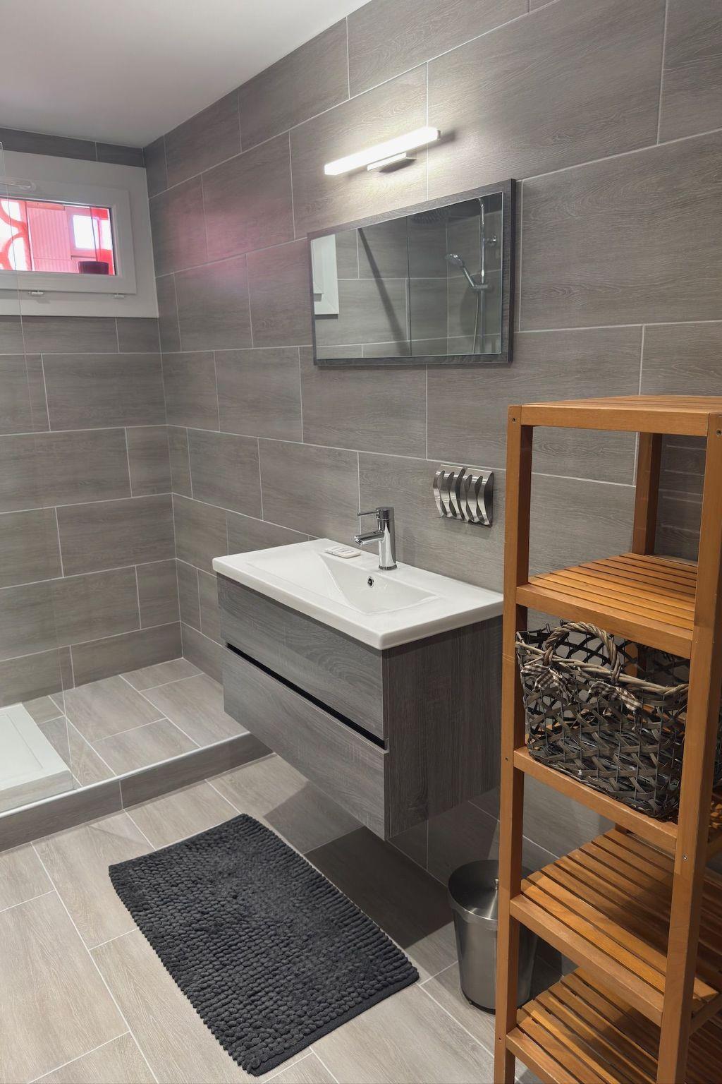 - Modern bathroom with walk-in shower, washbasin, storage space and WC