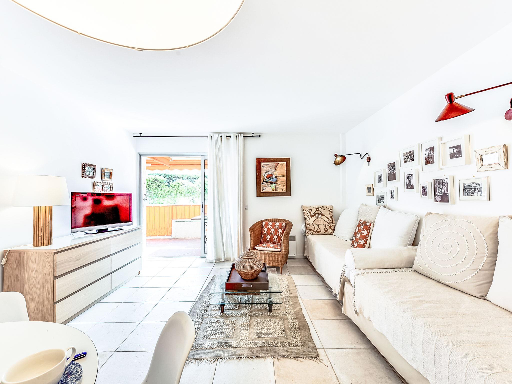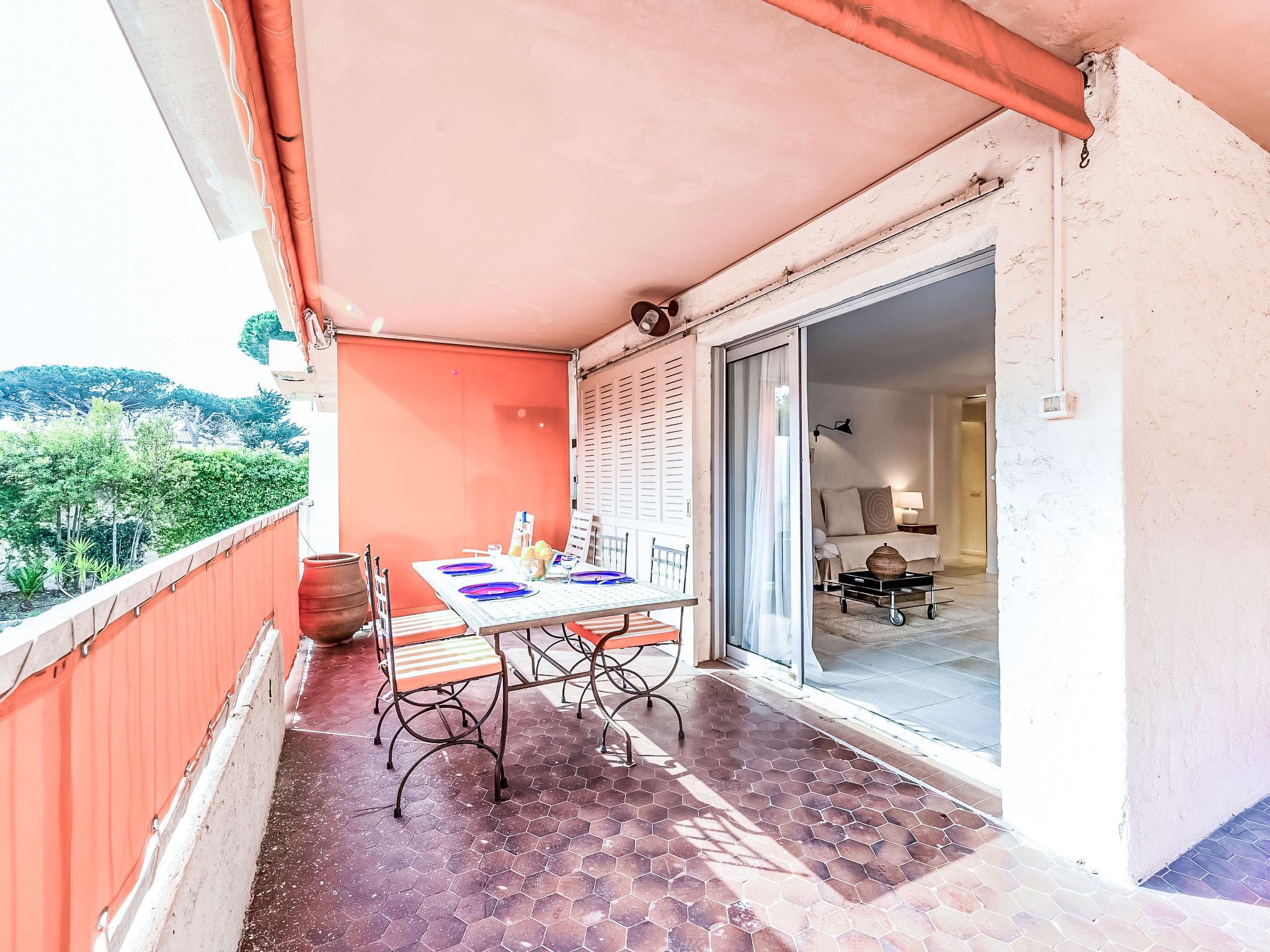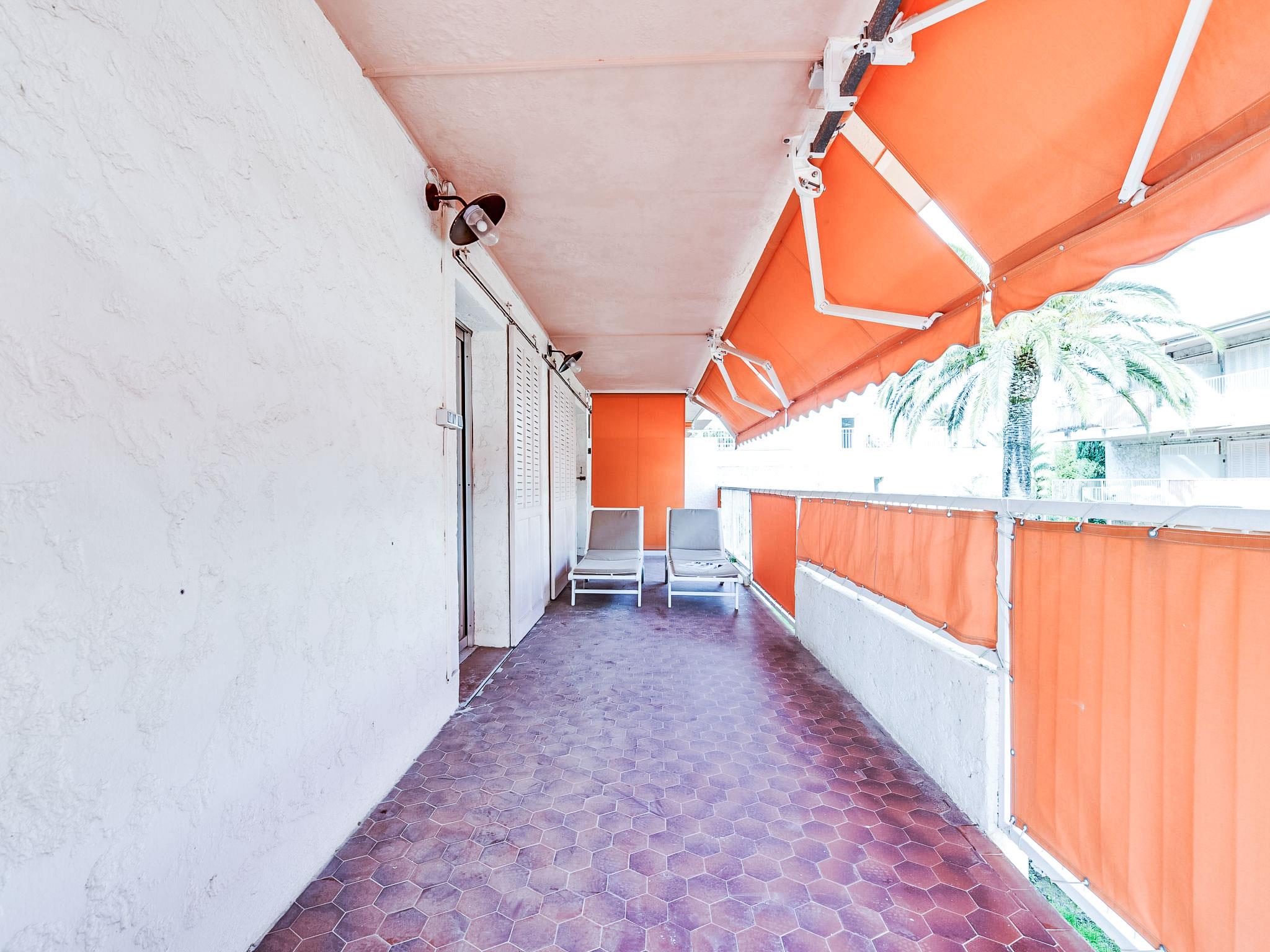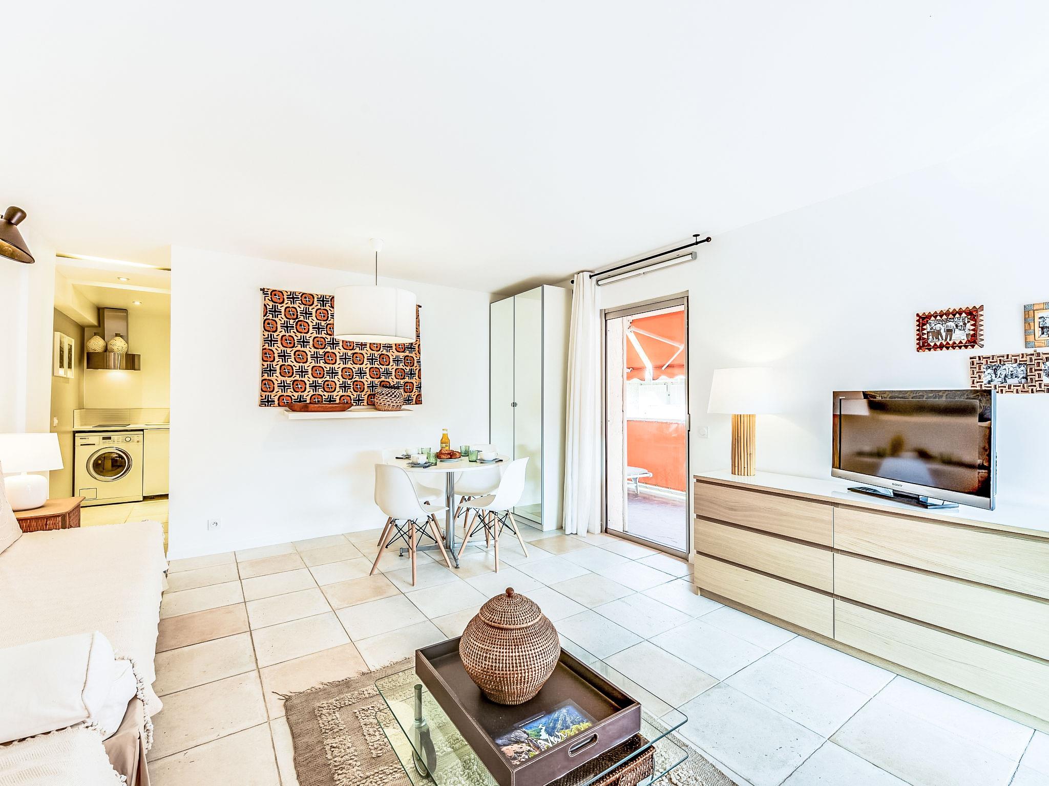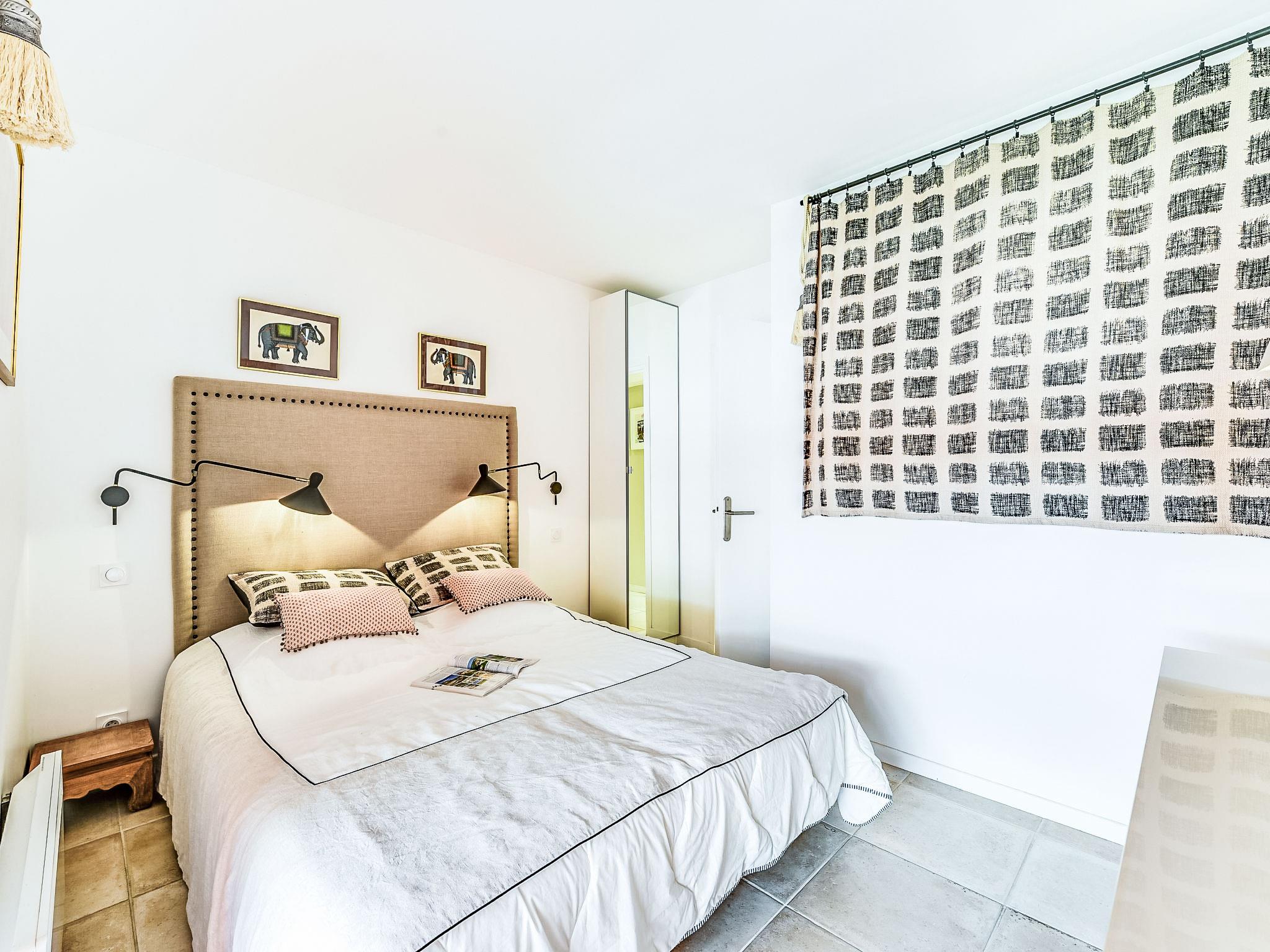 "Résidence Les Patios 2", 2-room apartment 50 m2 on 1st floor. Renovated in 2017, beautiful furnishings: living/dining room with 2 beds (90 cm, length 190 cm), TV (flat screen), air conditioning. Exit to the terrace. 1 room with 1 double bed (2 x 80 cm, length 200 cm). Exit to the terrace. Kitchen (dishwasher, 4 induction hot plates, toaster, kettle, microwave, freezer, electric coffee machine). Shower, sep. WC. Electric heating. Terrace 37 m2, roofed, west facing position. Terrace furniture. Facilities: washing machine, dryer, iron. Internet (WiFi, extra). Parking space n 746 (roofed), height 180 cm, width 200 cm. Please note: smoke alarm. 83119002475DP