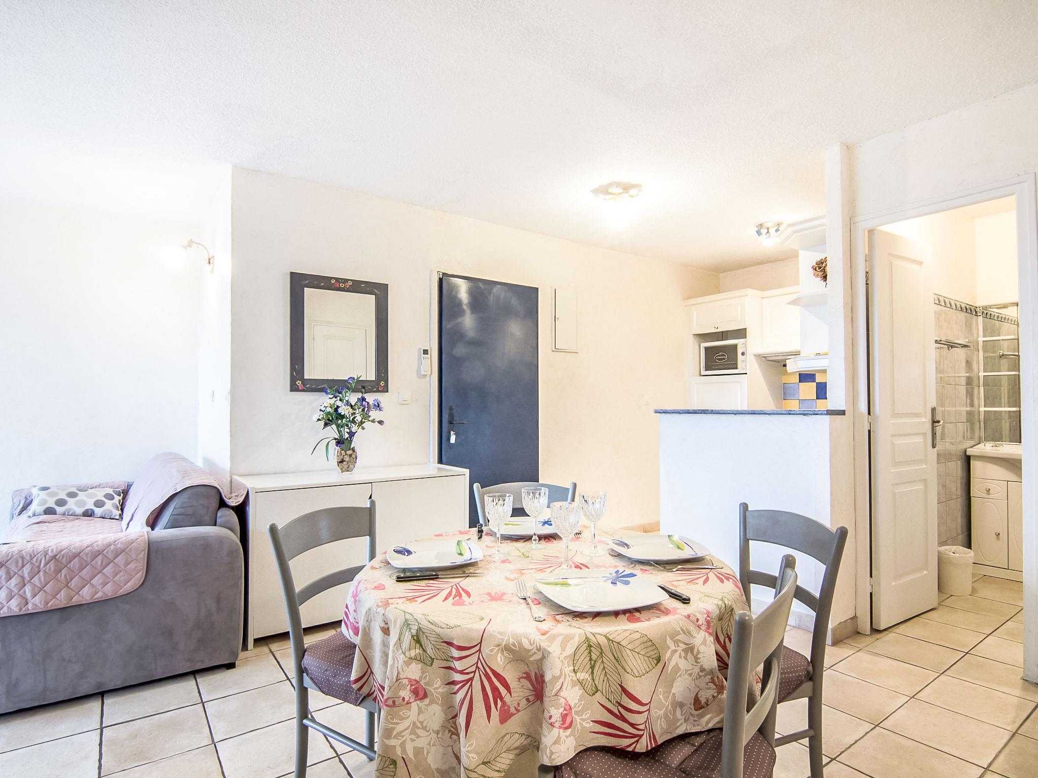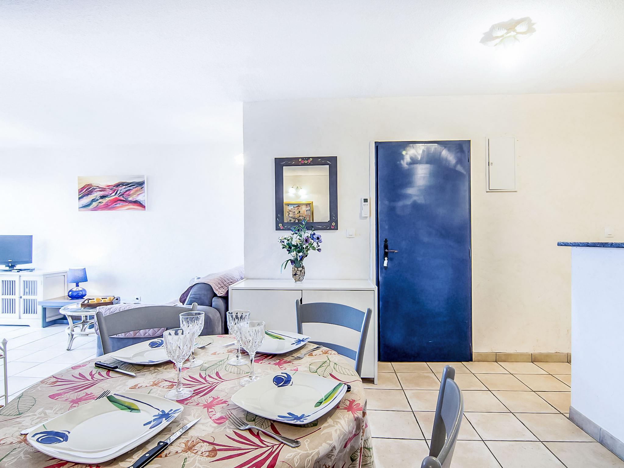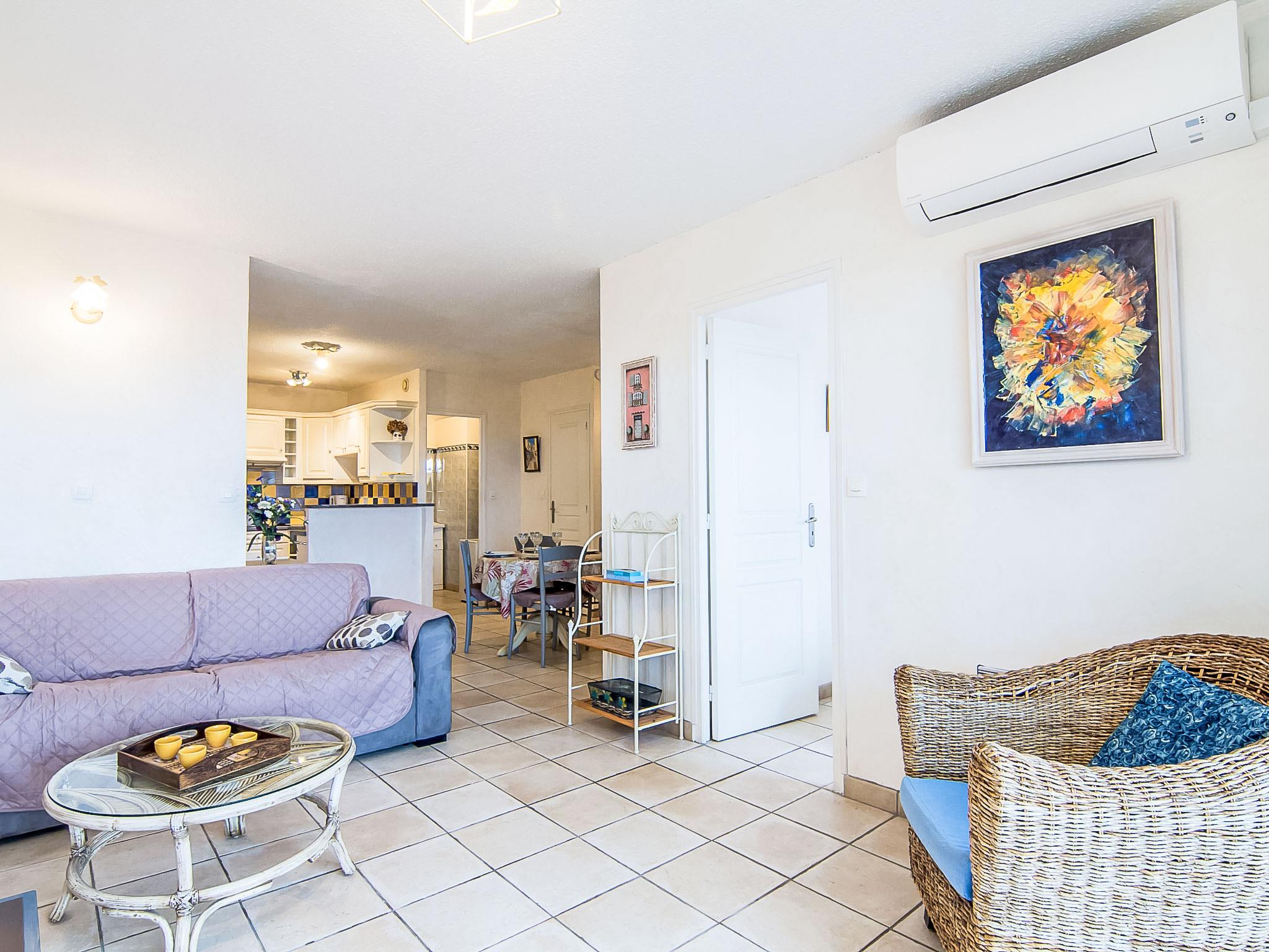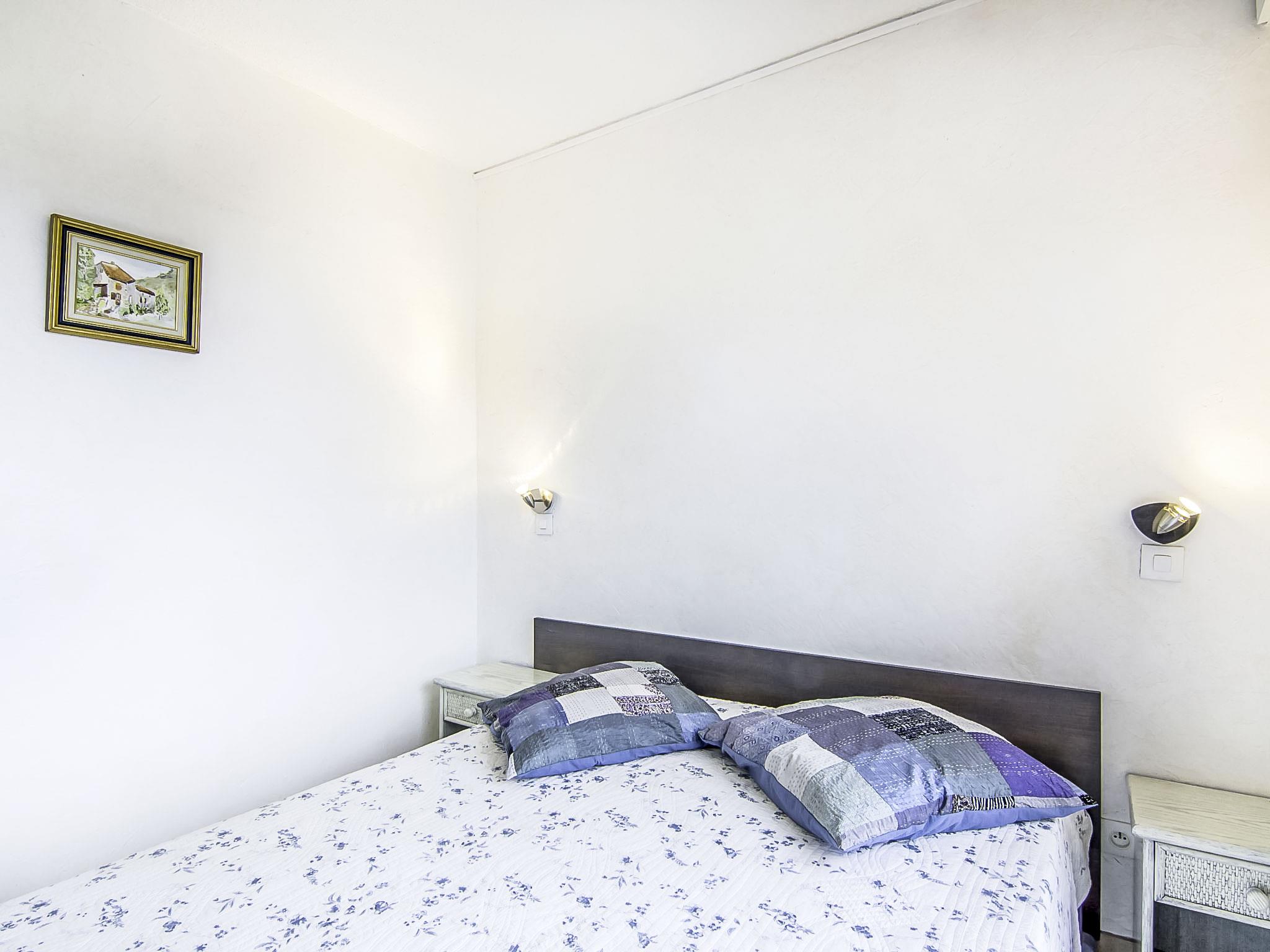 "Eden Parc 4", 2-room apartment 42 m2 on 1st floor. Bright, comfortable and beautiful furnishings: living/dining room with 1 double sofabed (1 x 140 cm, length 190 cm), international TV channels, flat screen and air conditioning. Exit to the balcony. 1 room with 1 french bed (1 x 140 cm, length 190 cm). Open kitchen (oven, dishwasher, 4 ceramic glass hob hotplates). Bathroom, sep. WC. Electric heating. Balcony 7 m2. Terrace furniture. View of the swimming pool, the garden and the resort. Facilities: washing machine. Internet (WiFi, extra). Parking space n 50. Please note: non-smoking house. Smoke alarm.