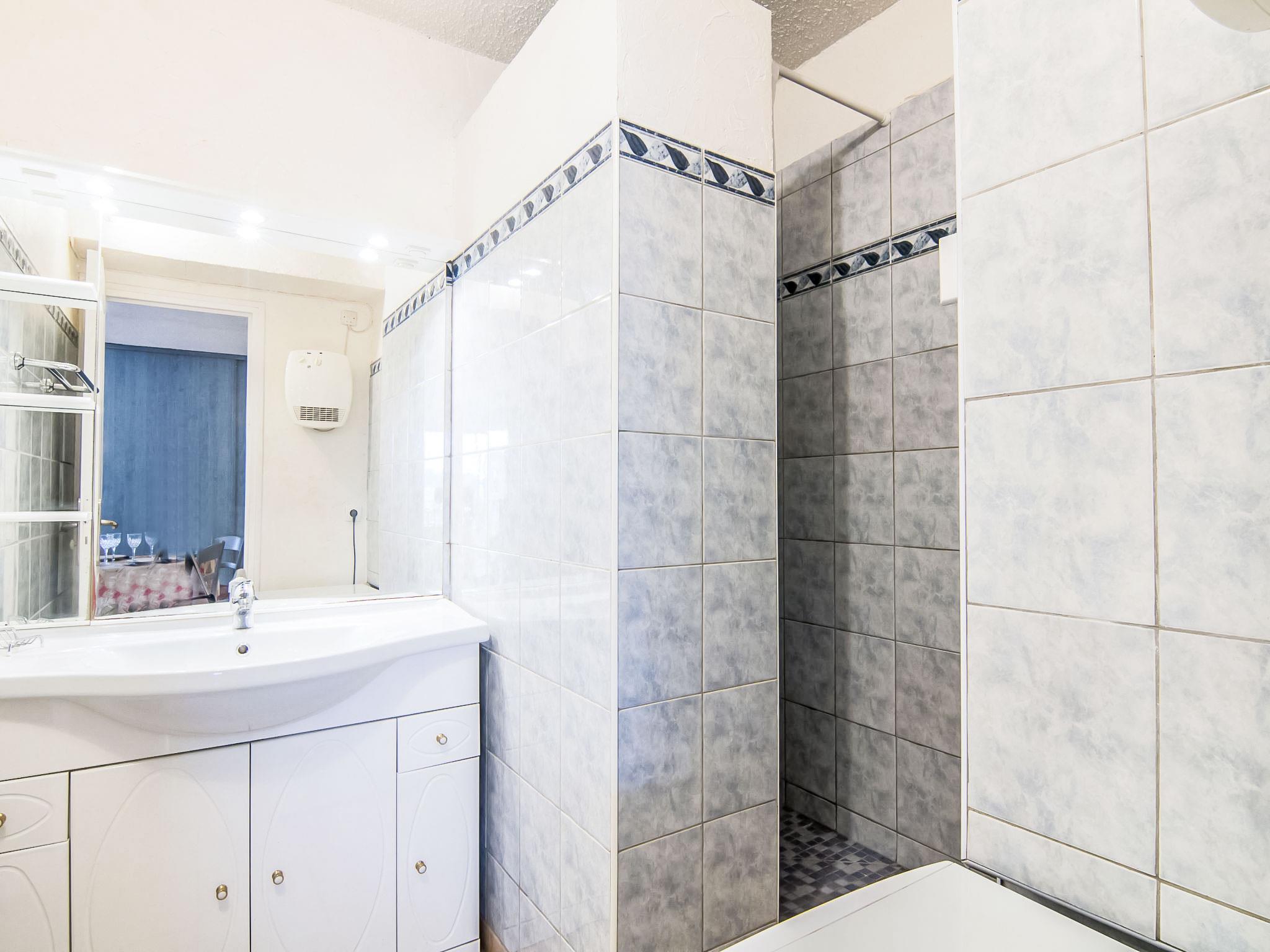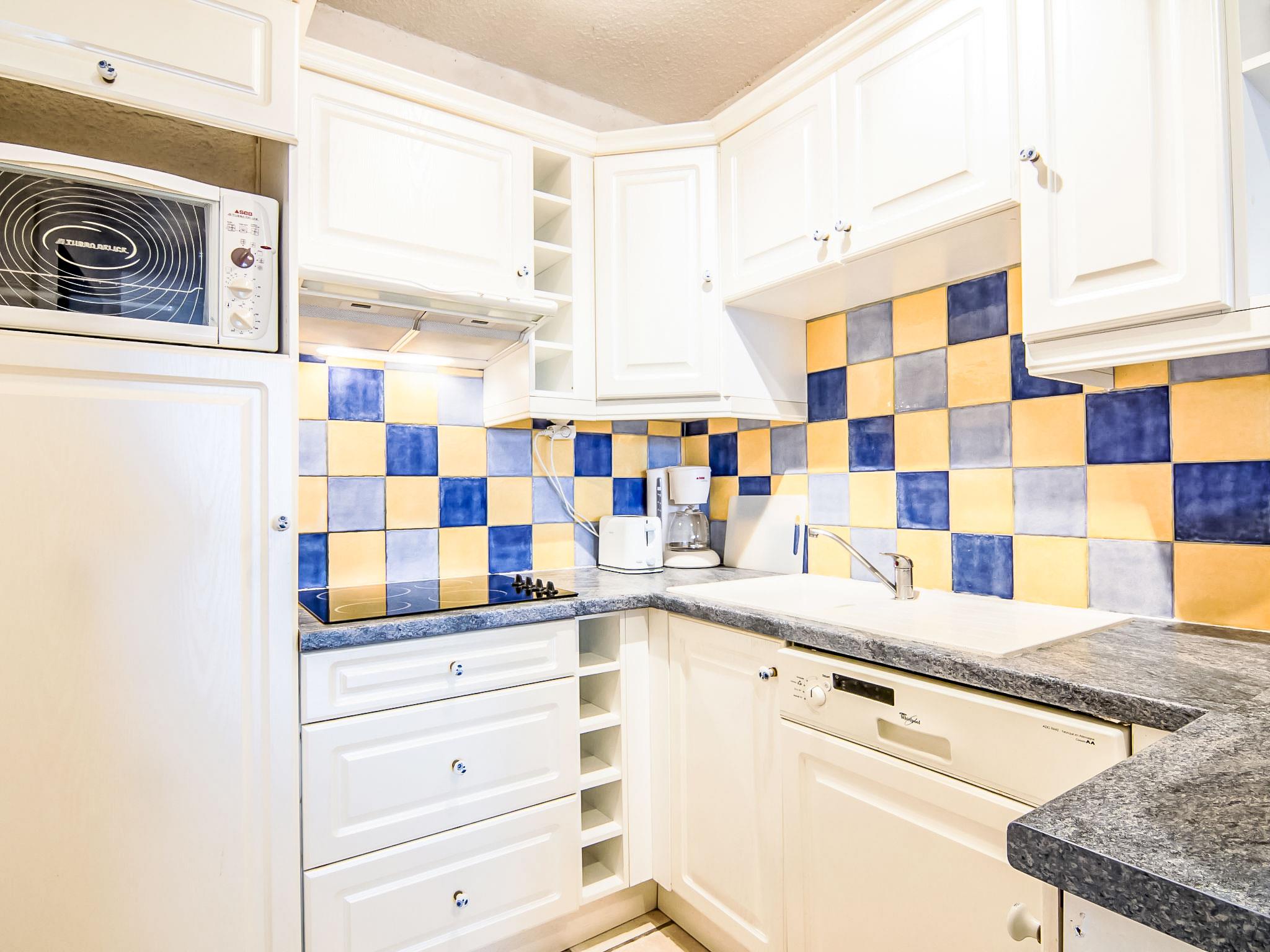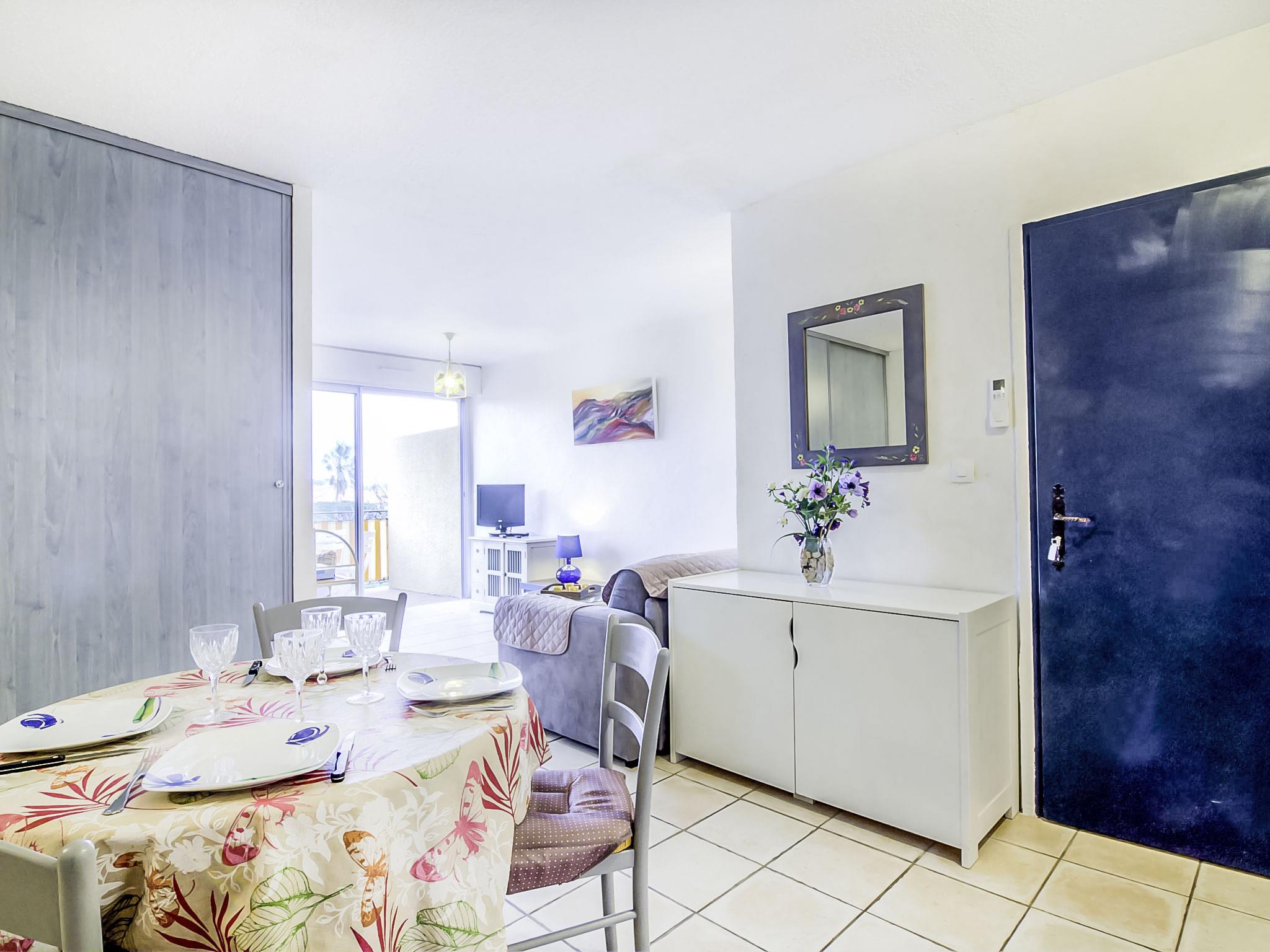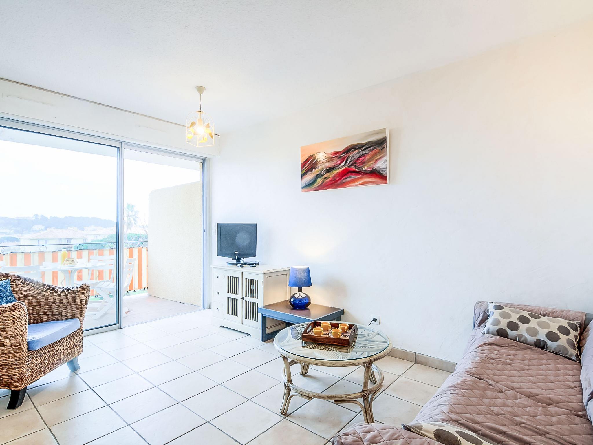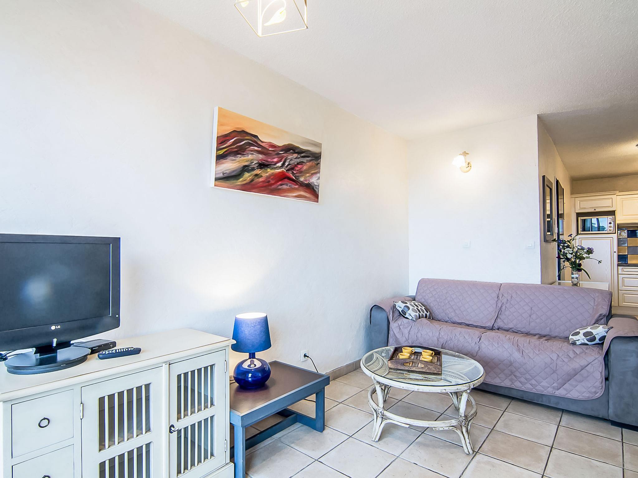 "Eden Parc 4", 2-room apartment 42 m2 on 1st floor. Bright, comfortable and beautiful furnishings: living/dining room with 1 double sofabed (1 x 140 cm, length 190 cm), international TV channels, flat screen and air conditioning. Exit to the balcony. 1 room with 1 french bed (1 x 140 cm, length 190 cm). Open kitchen (oven, dishwasher, 4 ceramic glass hob hotplates). Bathroom, sep. WC. Electric heating. Balcony 7 m2. Terrace furniture. View of the swimming pool, the garden and the resort. Facilities: washing machine. Internet (WiFi, extra). Parking space n 50. Please note: non-smoking house. Smoke alarm.