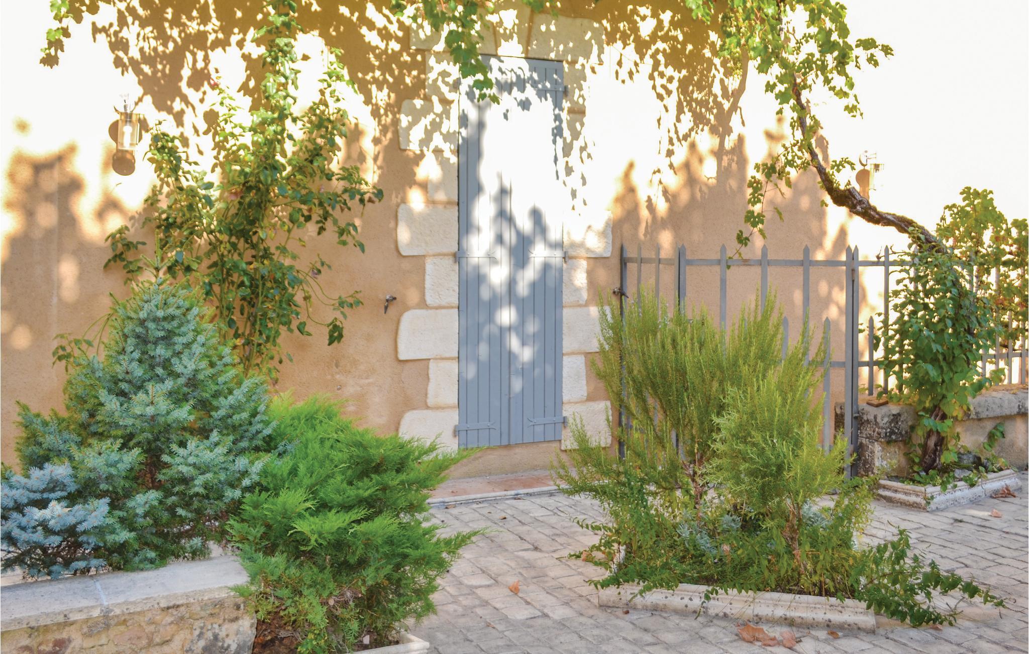 En lille vandresti løber forbi den lukkede gård, som blandt andet tæller en pool samt en terrasse med hundrede år gamle lindetræer, hvis skygge er skøn at sidde i på varme dage. I huset er der brændeovn og en sauna, og til hvert soveværelse hører eget badeværelse med wc.