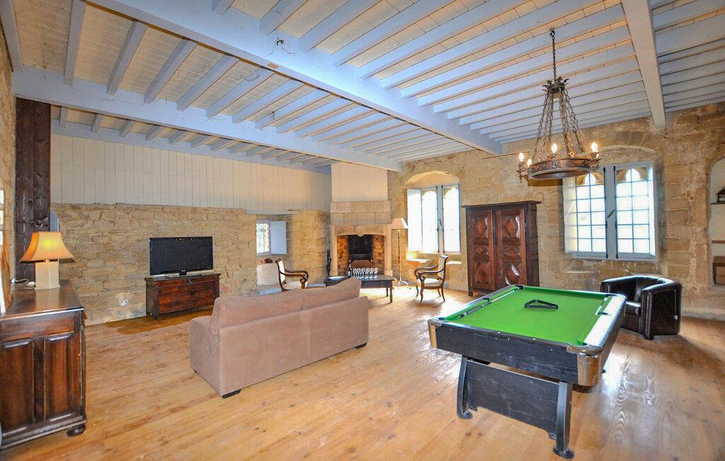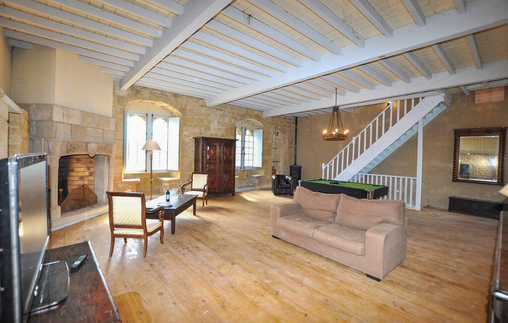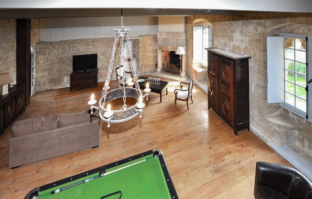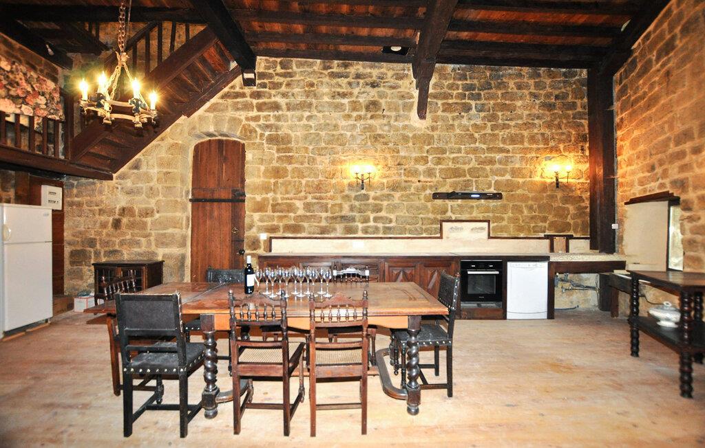 Indenfor udfolder dette historiske hus sin middelalderlige charme – med mægtige stenmure, træbjælker i loftet og højt til loftet. Møblerne kombinerer rustikhed med elegant komfort: tunge træmøbler, stilfulde lysekroner og store pejse skaber en varm og indbydende atmosfære. I den store stue kan I slappe af ved den åbne pejs eller spille billard. Det store køkken med stenpejs og langt spisebord lægger op til at nyde hyggelige måltider – ligesom i et lille slot fra svundne tider.