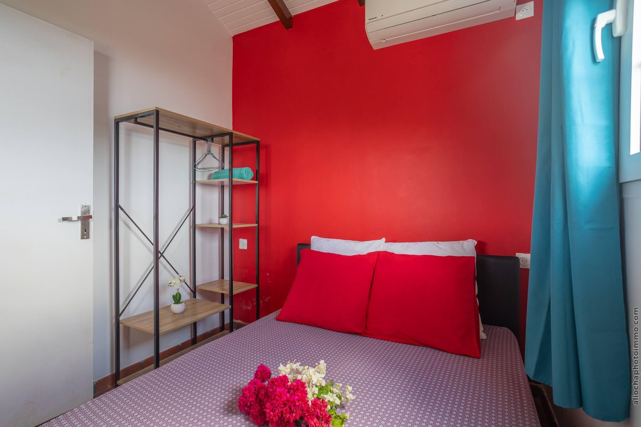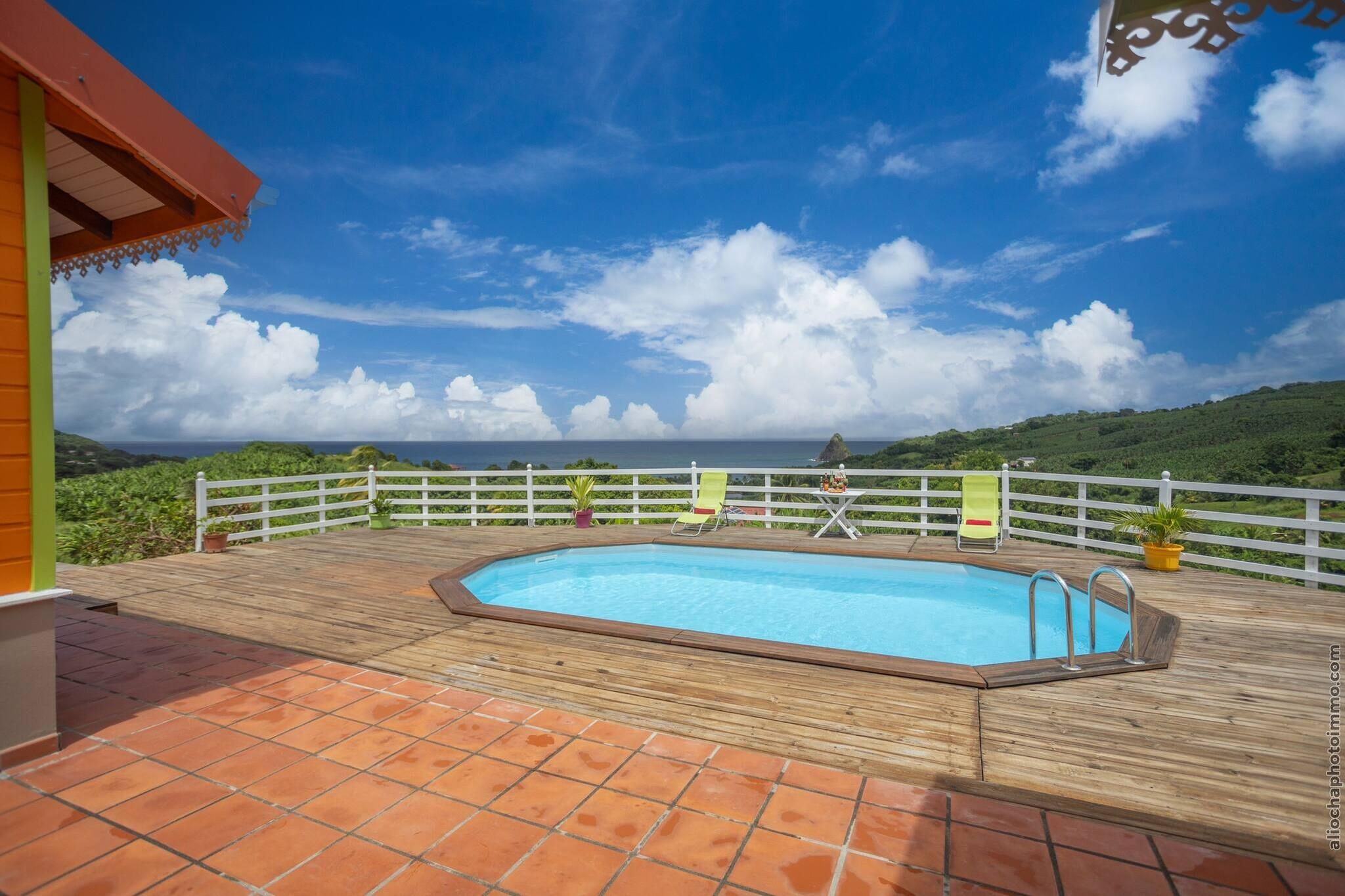 Genoplev naturen i vores charmerende, miljøvenlige bungalow, et fredeligt tilflugtssted skabt af dedikerede landmænd i hjertet af Martiniques landskab. Bungalowen er designet til par, der søger ro og afkobling, og tilbyder panoramaudsigt over frodige, grønne bakker, det glitrende hav og den ikoniske Sukkertoppen. Beliggende i rolige omgivelser er det den perfekte tilflugtssted for dem, der værdsætter enkelhed, natur og bæredygtig livsstil. Dette soldrevne gemmested har et hyggeligt soveværelse med en dobbeltseng og en komfortabel sovesofa i opholdsstuen. Gå udenfor for at nyde den private pool eller slap af på terrassen, mens du lytter til fuglesang og havbrise. Bare 5 minutters kørsel bringer dig til Anse Charpentier, en smuk surfstrand, mens den svømmevenlige Plage des Raisiniers kun ligger 15 minutter væk. Den nærliggende restaurant *Le Point de Vue* serverer lækre kreolske retter, og skovstier i Philippe-skoven tilbyder den perfekte naturvandring. Tilbring dine dage med at udforske øens rige kulturarv - besøg det livlige Sainte-Marie-marked om lørdagen, tag en tur på Saint James-destilleriet og de små Tombolo-øer, eller nyd en middag ved havet på North Beach Restaurant. Ideelt for par, der leder efter en autentisk oplevelse i et naturligt smukt og miljøbevidst miljø. Bemærk venligst: op til 4 besøgende er tilladt, men arrangementer eller larmende forsamlinger er ikke tilladt. Book nu og nyd Martinique, når det er mest roligt.