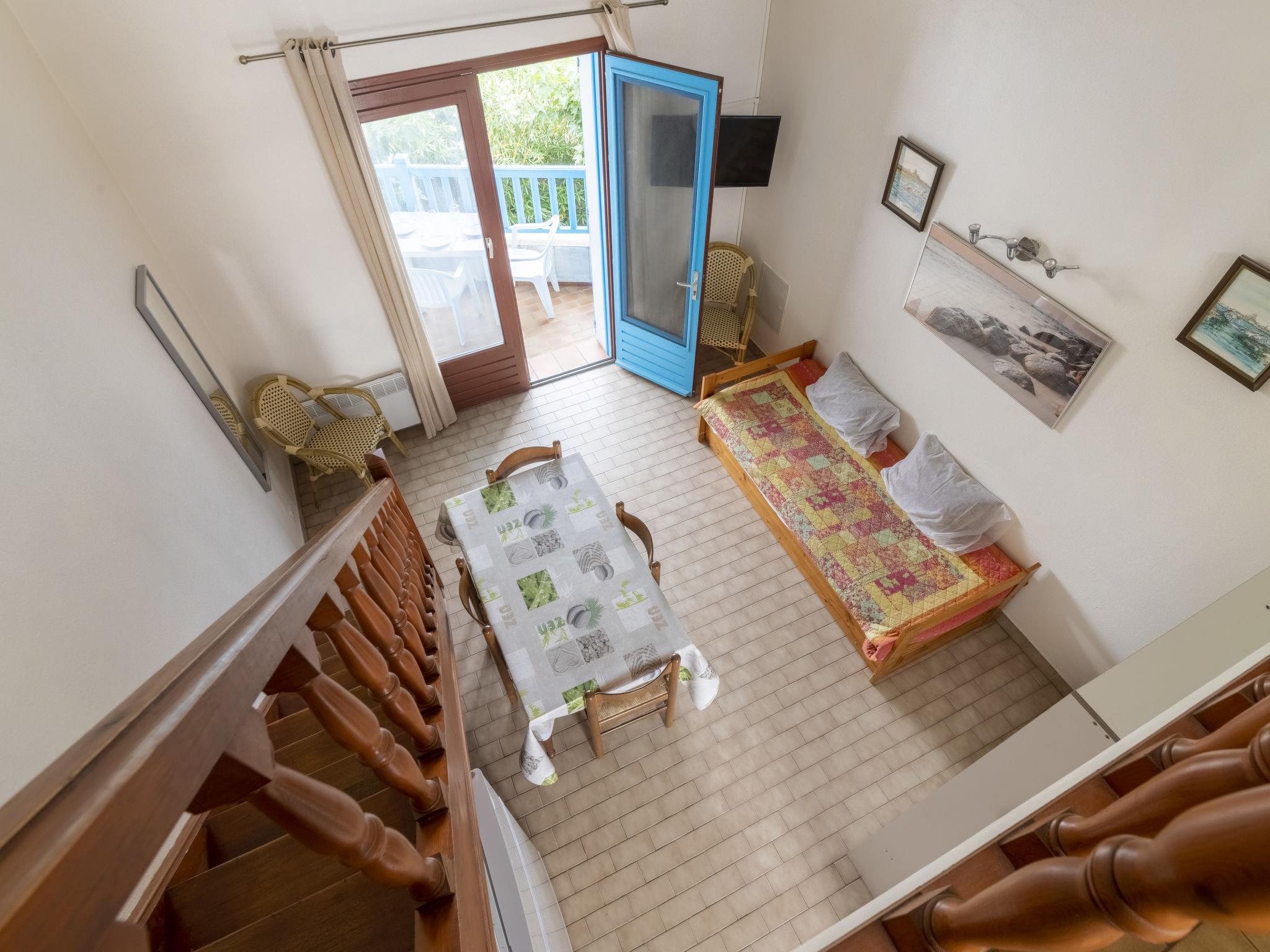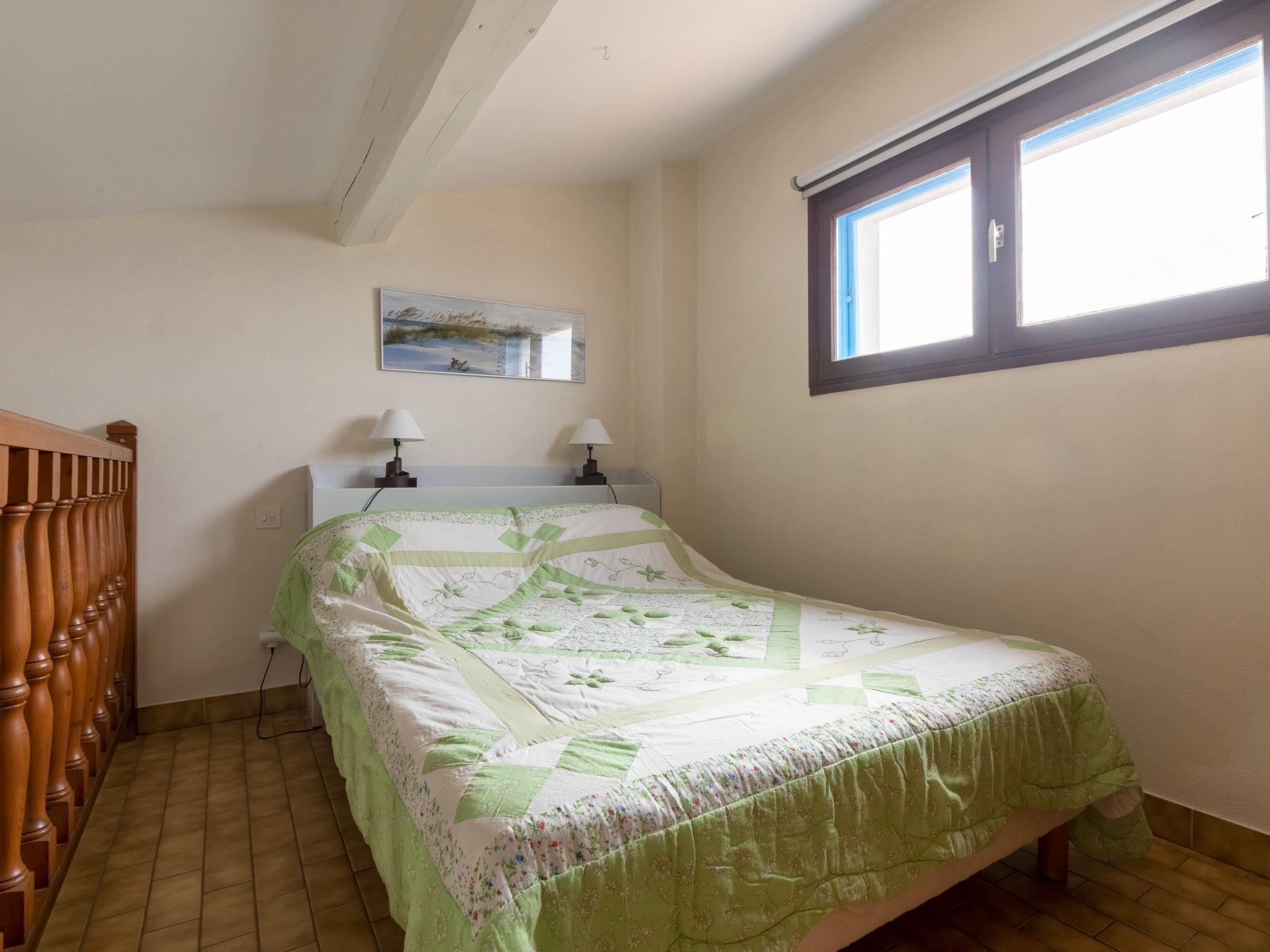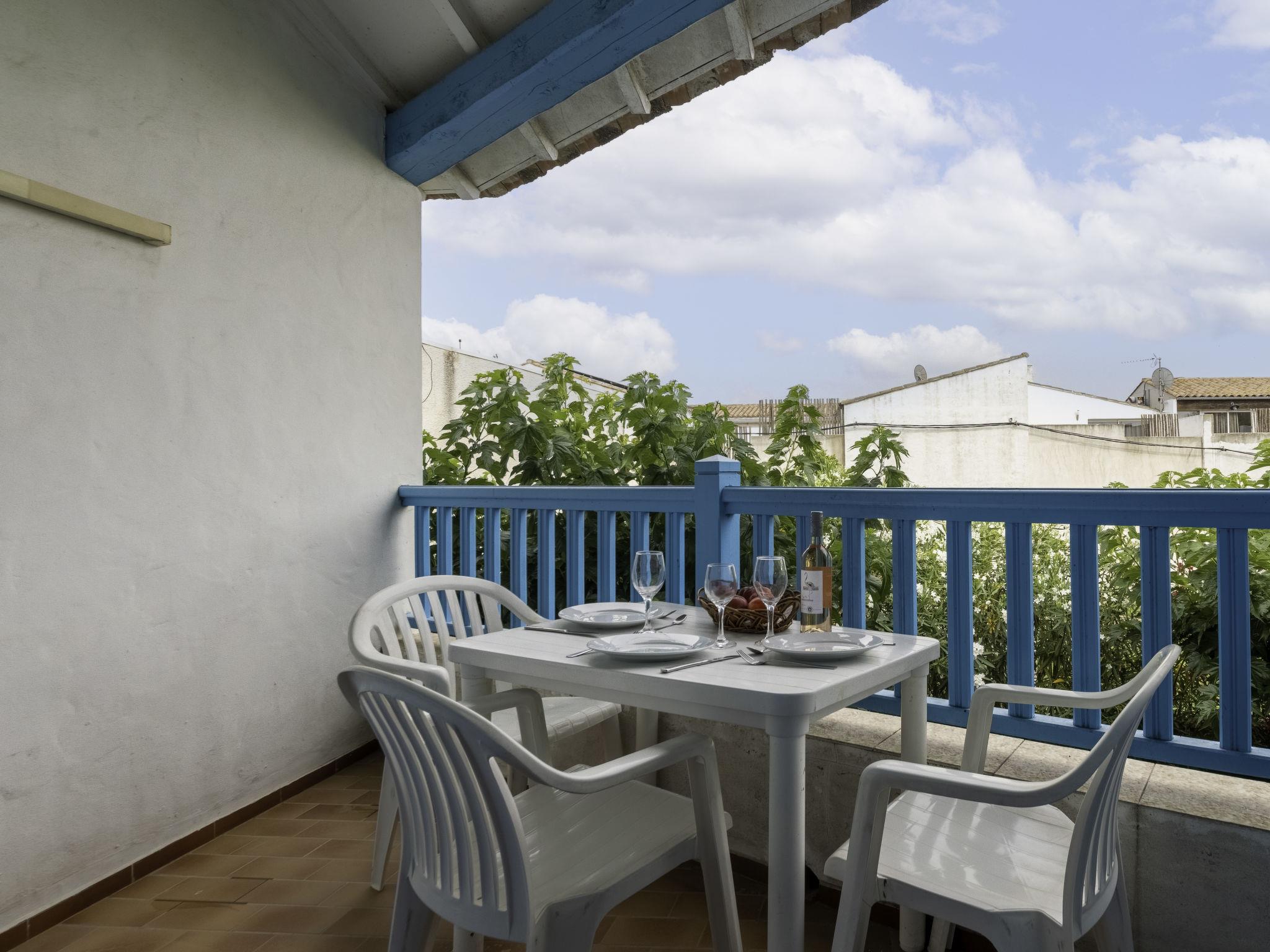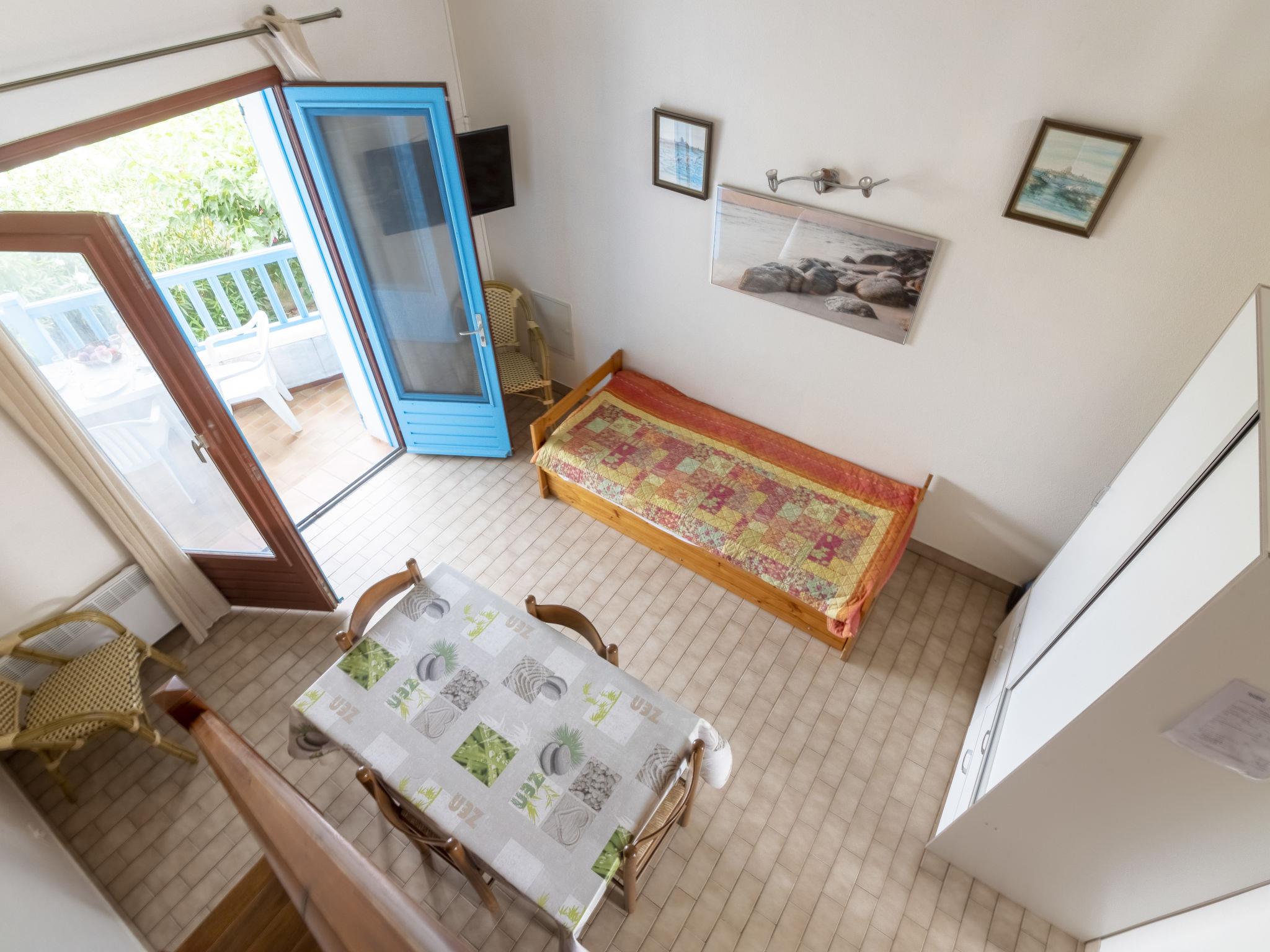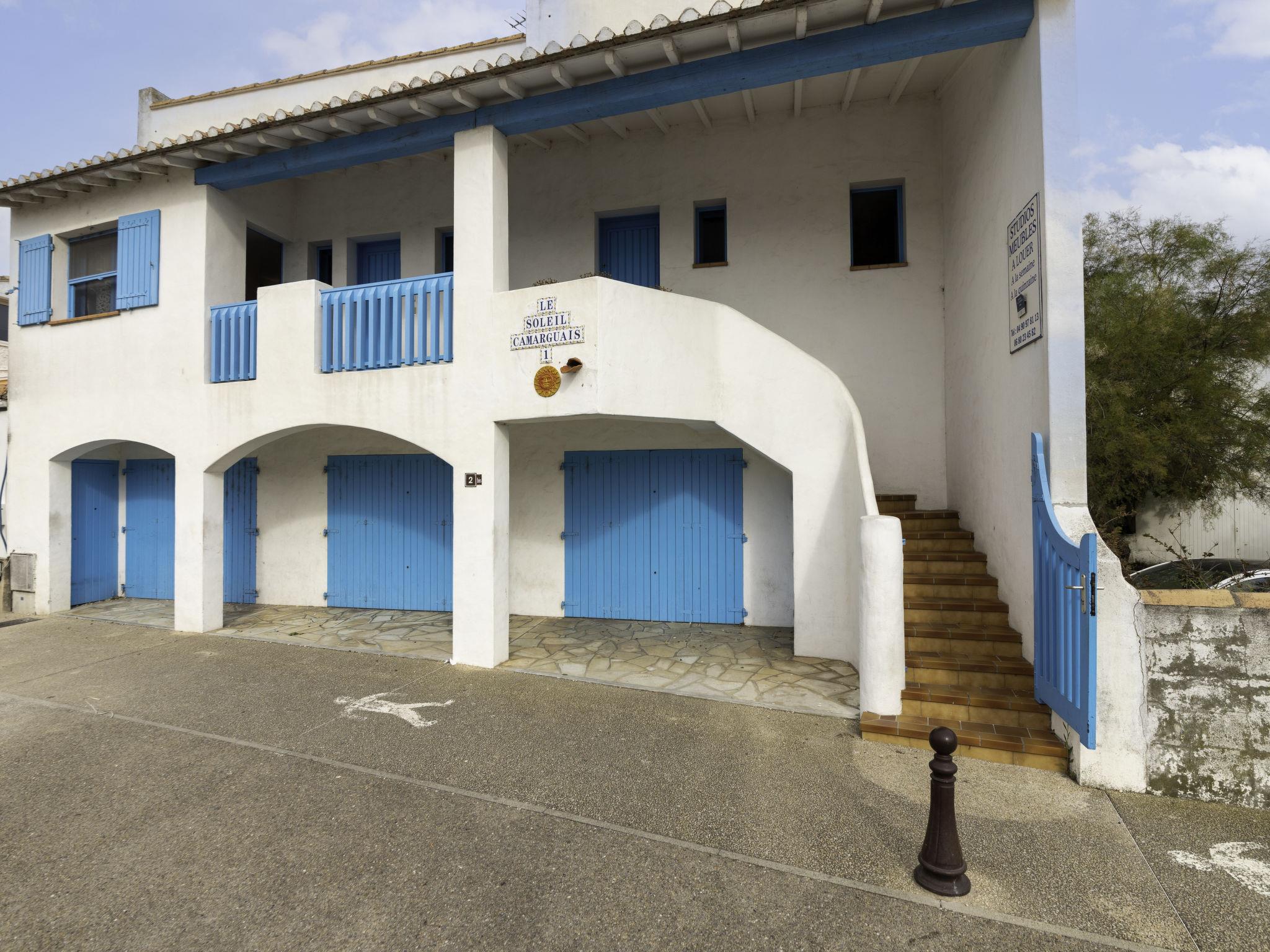 "Soleil Camarguais", 1-room apartment 40 m2 on 2 levels. Simple and practical furnishings: living/sleeping room with 1 bed (140 cm, length 190 cm), dining table and TV. Exit to the balcony. Gallery with 2 pull-out beds (2 pers. 2 x 80 cm, length 180 cm). Kitchenette (mini-oven, 3 ceramic glass hob hotplates, toaster, kettle, microwave, freezer, electric coffee machine). Shower/WC. Electric heating. Balcony. Balcony furniture. Facilities: iron. Internet (WiFi, free). Instead of an enclosed bedroom, some sleeping areas are located in an open-plan area (gallery, alcove, etc.). 13096000014AK