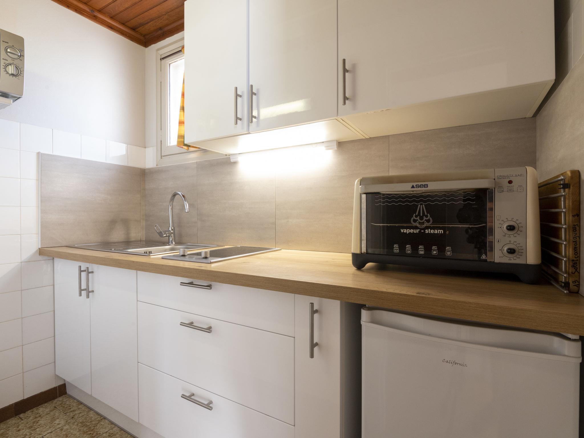 "Le Soleil Camarguais", 1-room apartment 27 m2 on 2nd floor. Simple and practical furnishings: living/sleeping room with 1 french bed (140 cm, length 190 cm), dining table and TV. Exit to the balcony. Small kitchen (mini-oven, 2 ceramic glass hob hotplates, toaster, kettle, microwave, electric coffee machine). Shower/WC. Electric heating. Balcony. Balcony furniture, deck chairs (2). Facilities: iron. Internet (WiFi, free). Garage (extra). 13096000021DP