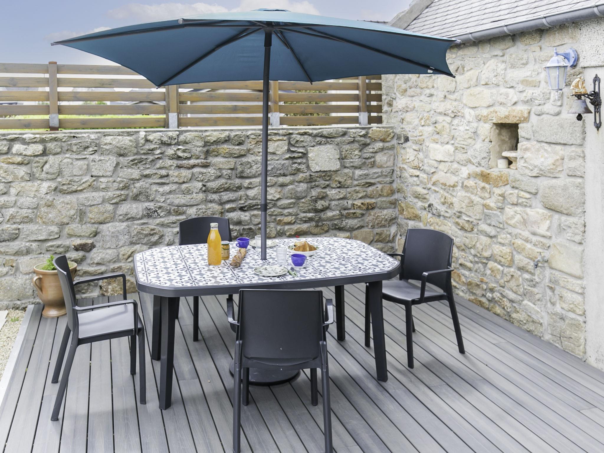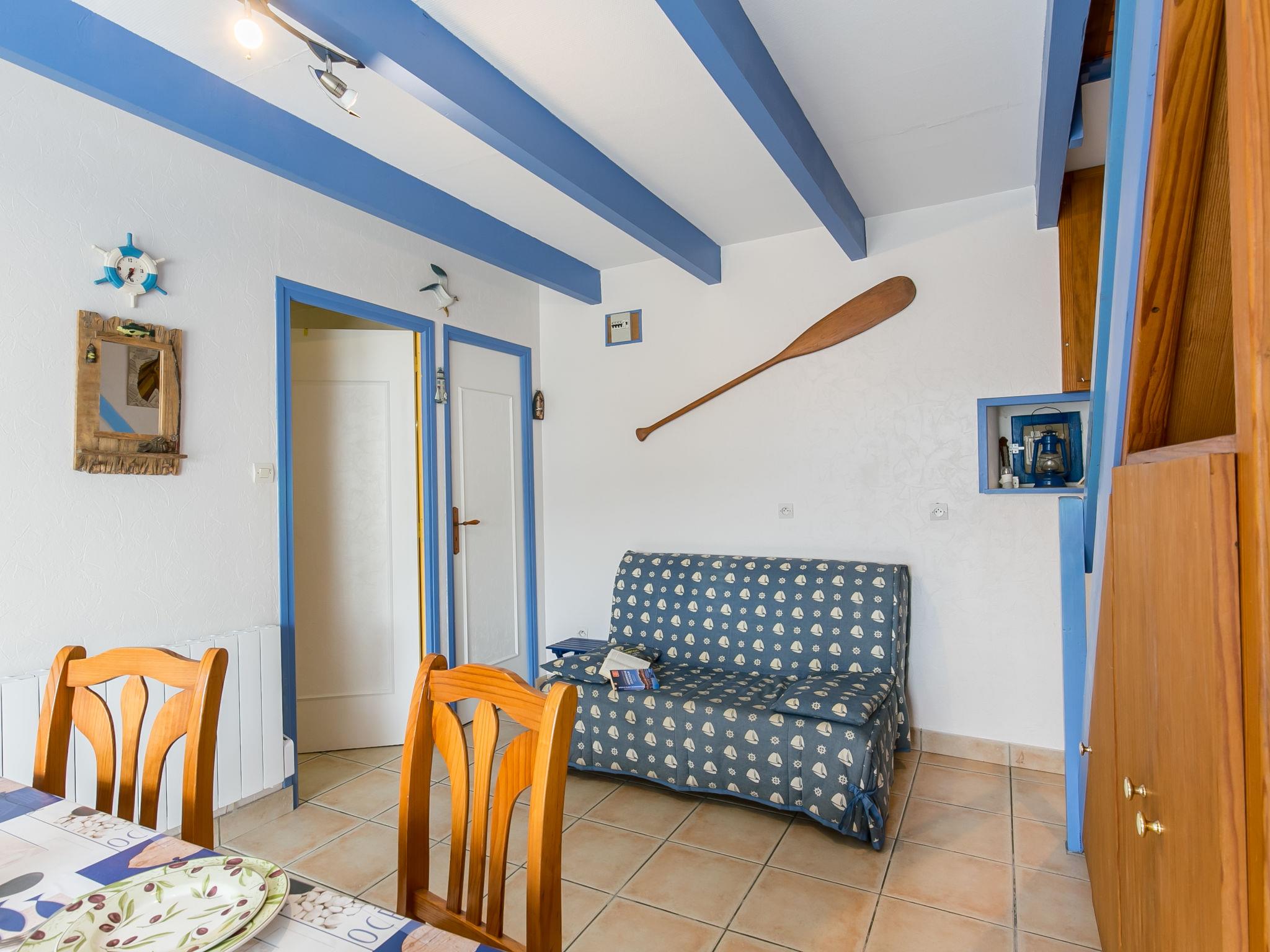 "Ty Kerveal", 2-room house 35 m2 on 2 levels. Practical and wooden furniture furnishings: living/dining room with dining table, satellite TV, international TV channels and hi-fi system. Exit to the terrace. Small, open kitchen (Gas stove, 4 gas rings, toaster, kettle, freezer, electric coffee machine, combination microwave). Shower, sep. WC. Electric heating. Upper floor: (steep stair), 1 open room with sloping ceilings with 1 french bed. Terrace 30 m2. Terrace furniture, barbecue (portable), deck chairs (2). Facilities: washing machine, iron. Please note: non-smoking house. Smoke alarm. 29273 0000 03KJ