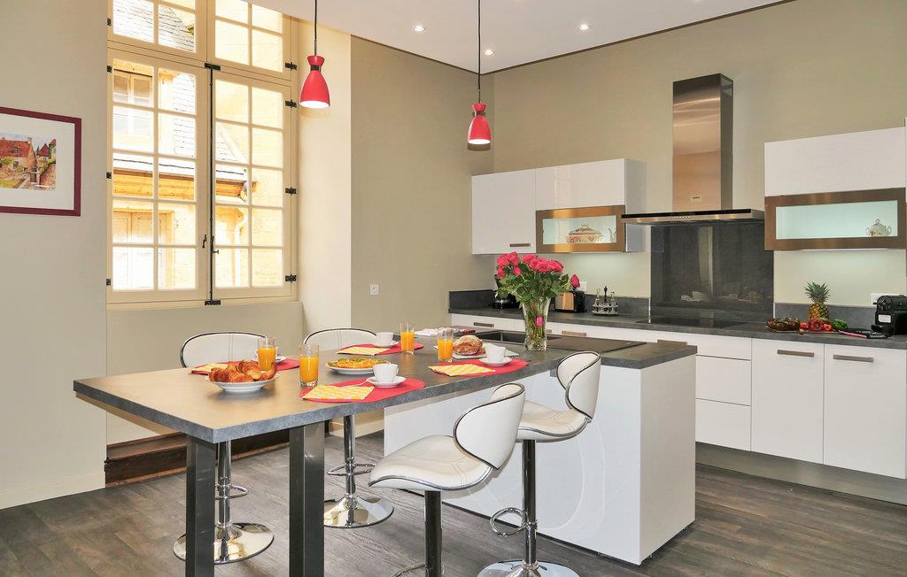Velkommen til de lyse rum i denne lejlighed, der har en super god placering i hjertet af den gamle bydel i Sarlat, i en bygning fra det 18. århundrede. Med sin smagfulde indretning og moderne udstyr inviterers I til at slappe af i en stilfuld atmosfære. Efter en begivenhedsrig dag kan I føle jer godt tilpas i de komfortable sofaer og lænestole i stuen og snakke til langt ud på aftenen.