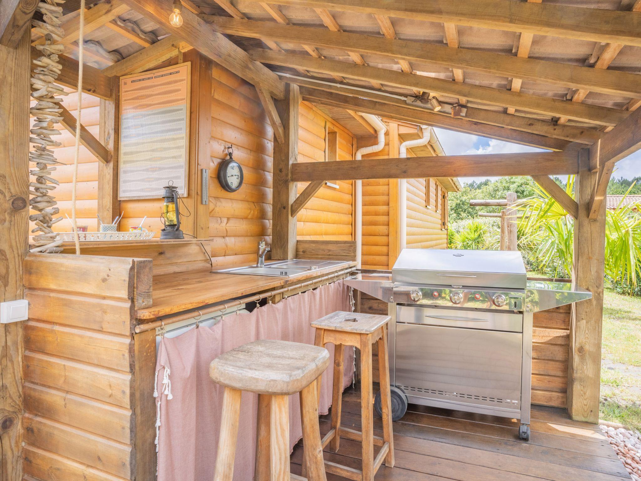 "Landais", 4-room chalet 50 m2. Comfortable and beautiful furnishings: living/dining room with TV (flat screen). Exit to the terrace, pergola. 1 room with 1 french bed (140 cm, length 190 cm), shower/WC. 1 room with 1 french bed (140 cm, length 190 cm). 1 room with 1 pull-out bed (2 pers. 2 x 90 cm, length 190 cm). Open kitchen (oven, dishwasher, 4 induction hot plates, toaster, kettle, microwave, electric coffee machine). Shower, sep. WC. No heating option. Terrace 25 m2, 15 m2, garden 400 m2. Terrace furniture. Facilities: washing machine, iron, hair dryer. Internet (WiFi, free). Parking. Please note: non-smoking house. Smoke alarm. summer kitchen with plancha. 402912025-0002