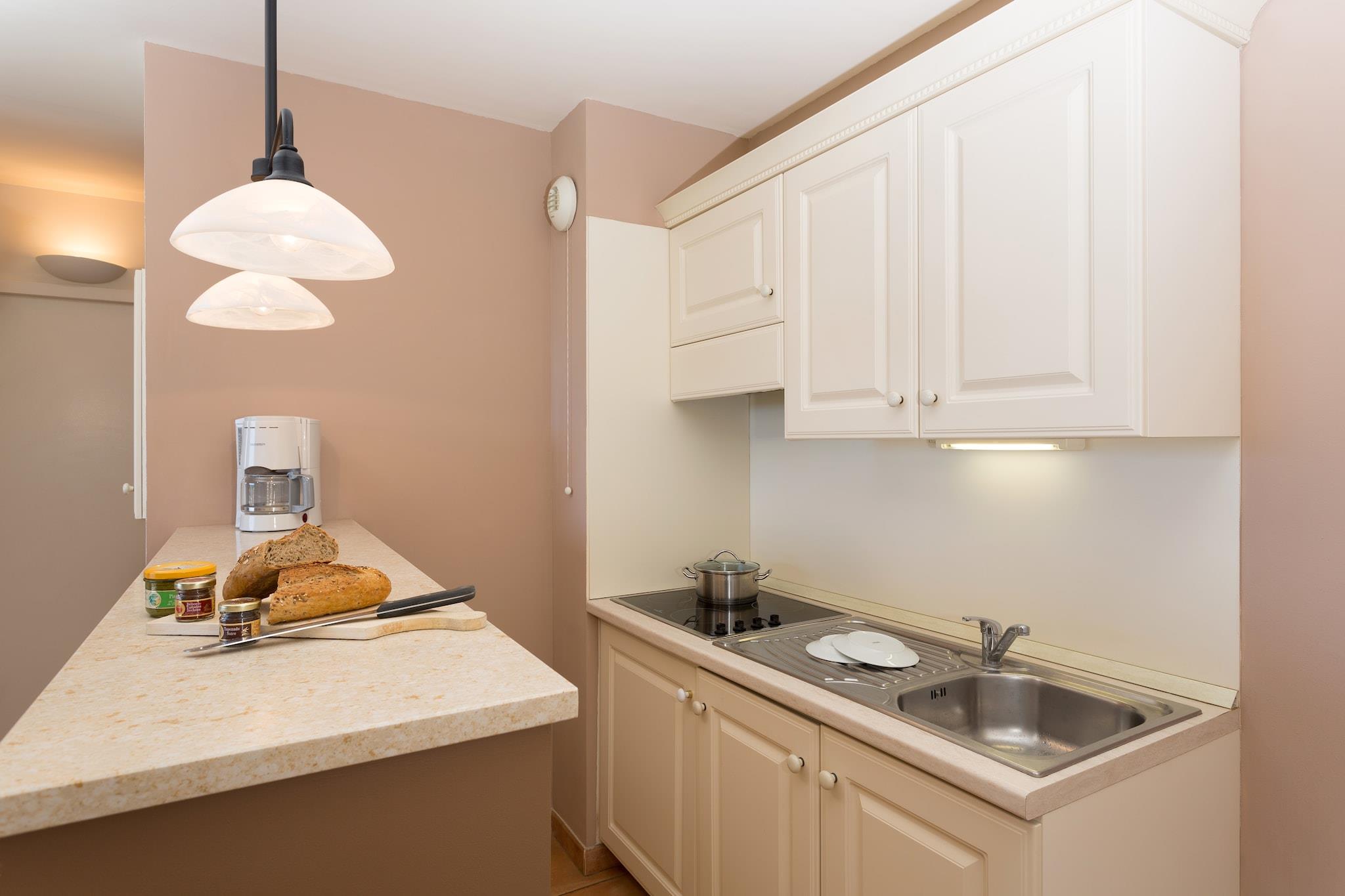 Stue(dobbeltsovesofa), åbent køkken(komfur(glaskeramisk), kaffemaskine, combi-mikroovn, opvaskemaskine , køleskab), soveværelse(2x enkeltseng), badeværelse(badekar eller bruser, håndvask, toilet), tørretumbler(deles med andre gæster, betalt), vaskemaskine(deles med andre gæster, betalt), balkon eller terrasse, varme(elektrisk), havemøbler, parkering, swimmingpool(deles med andre gæster)