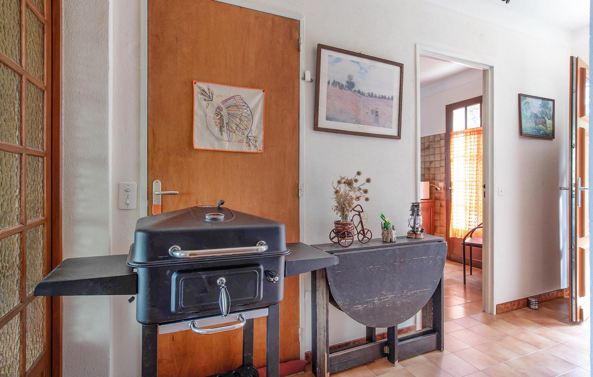 Velkommen til dette hyggelige feriehus, hvor I kan nyde en smuk udsigt over de omkringliggende bjerge, omgivet af et frodigt, grønt landskab. Her kan I trylle lækre retter frem sammen, planlægge jeres aktiviteter over afslappende måltider og afslutte en aktiv dag med en harmonisk spilleaften.