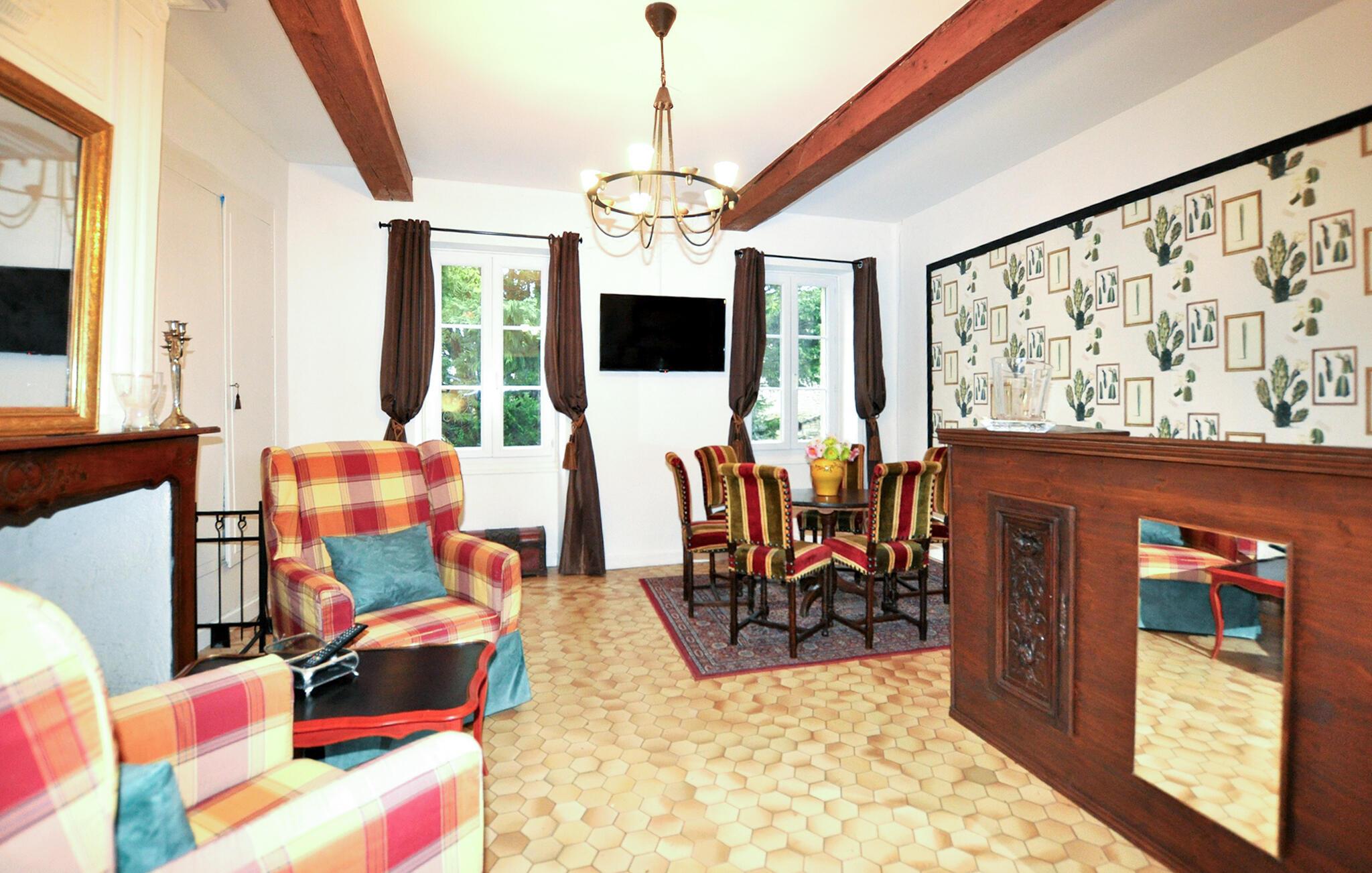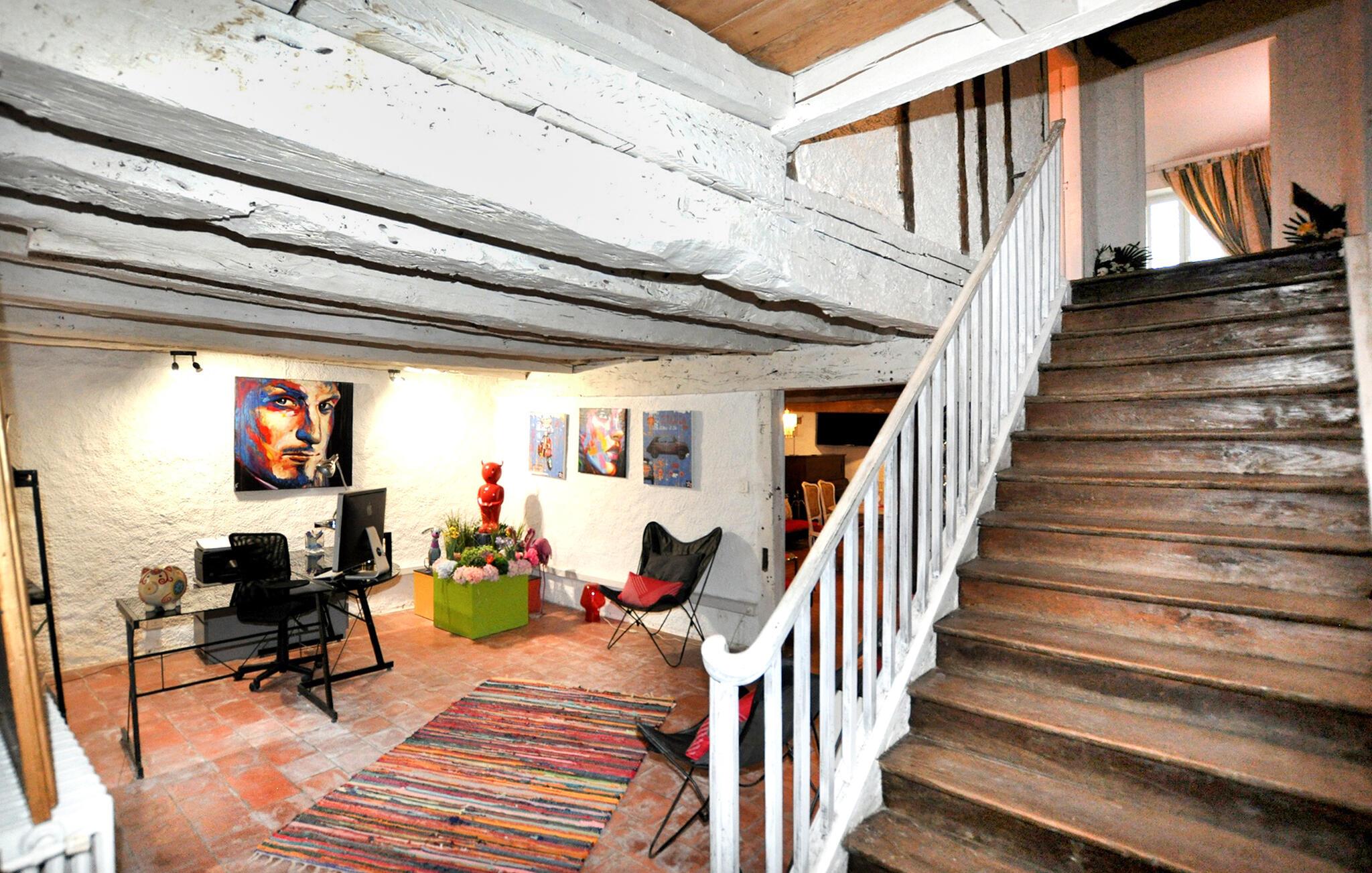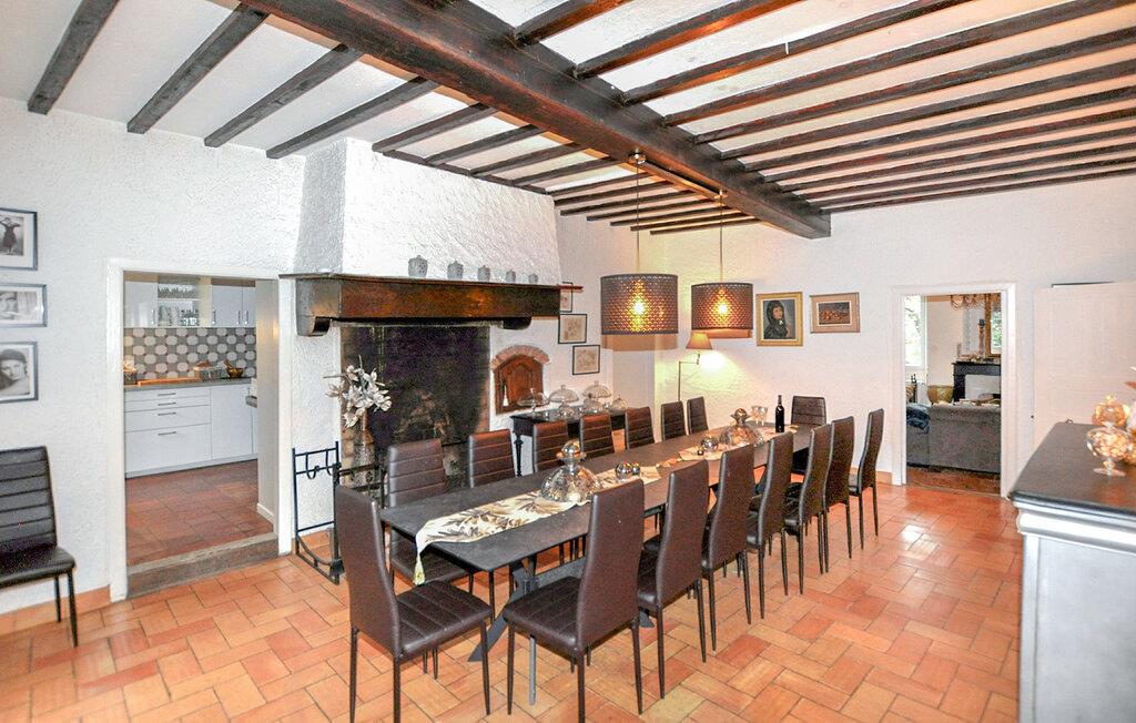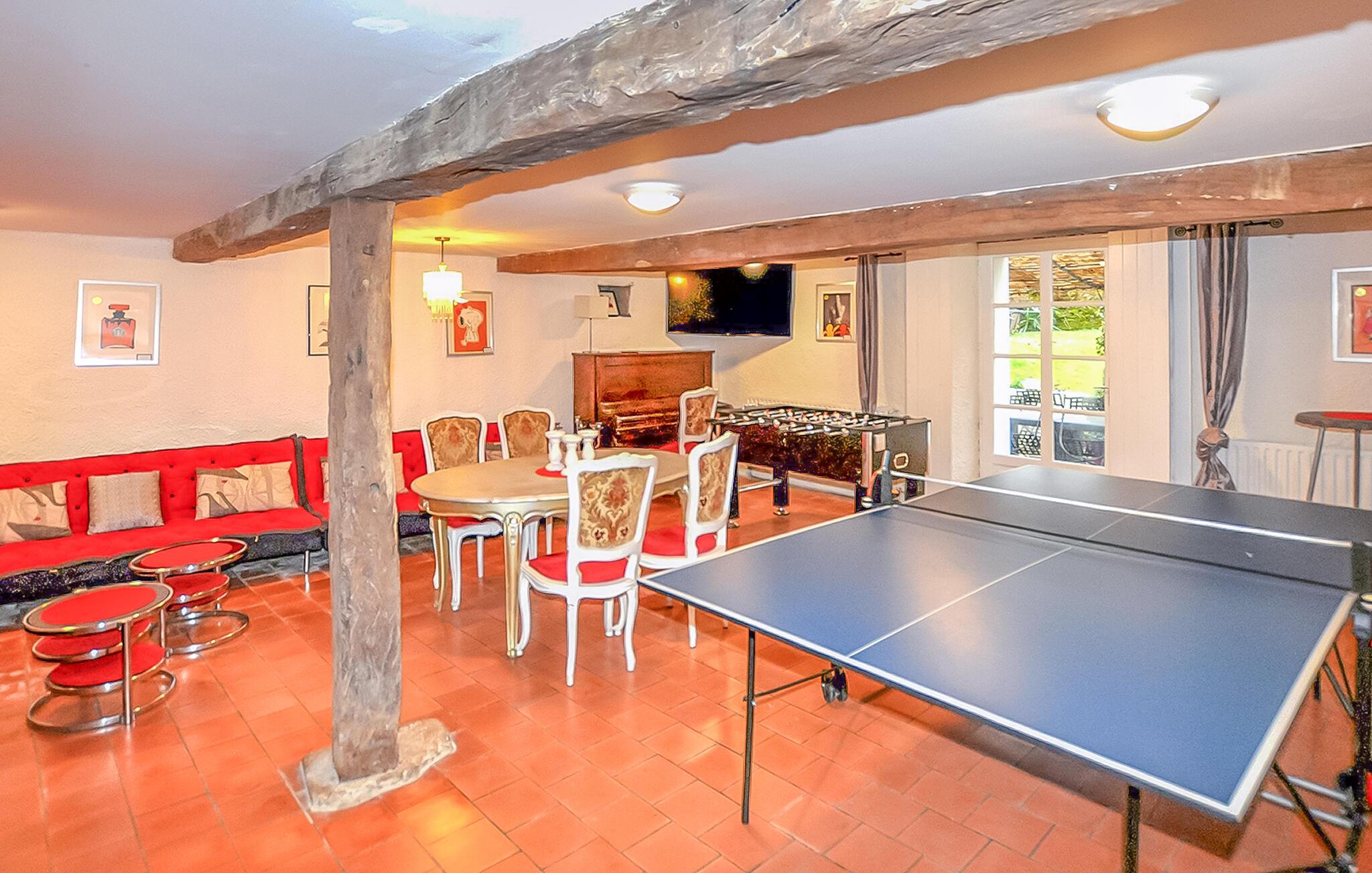 Bliv budt velkommen af ??den særlige atmosfære skabt af træbjælker og varme terrakottagulve. Sæt jer til rette i den store opholdsstue, der lægger op til hyggelige aftener med komfortable sofaer, pejs og charmerende indretning. Tilbring kvalitetstid sammen ved det lange spisebord i det åbne rum med imponerende pejs og masser af plads til socialt samvær. Brug det moderne, lyse køkken med det omfattende udstyr til at tilberede måltider sammen. Oplev aktivitetsrummet og spil bordtennis eller bordfodbold.