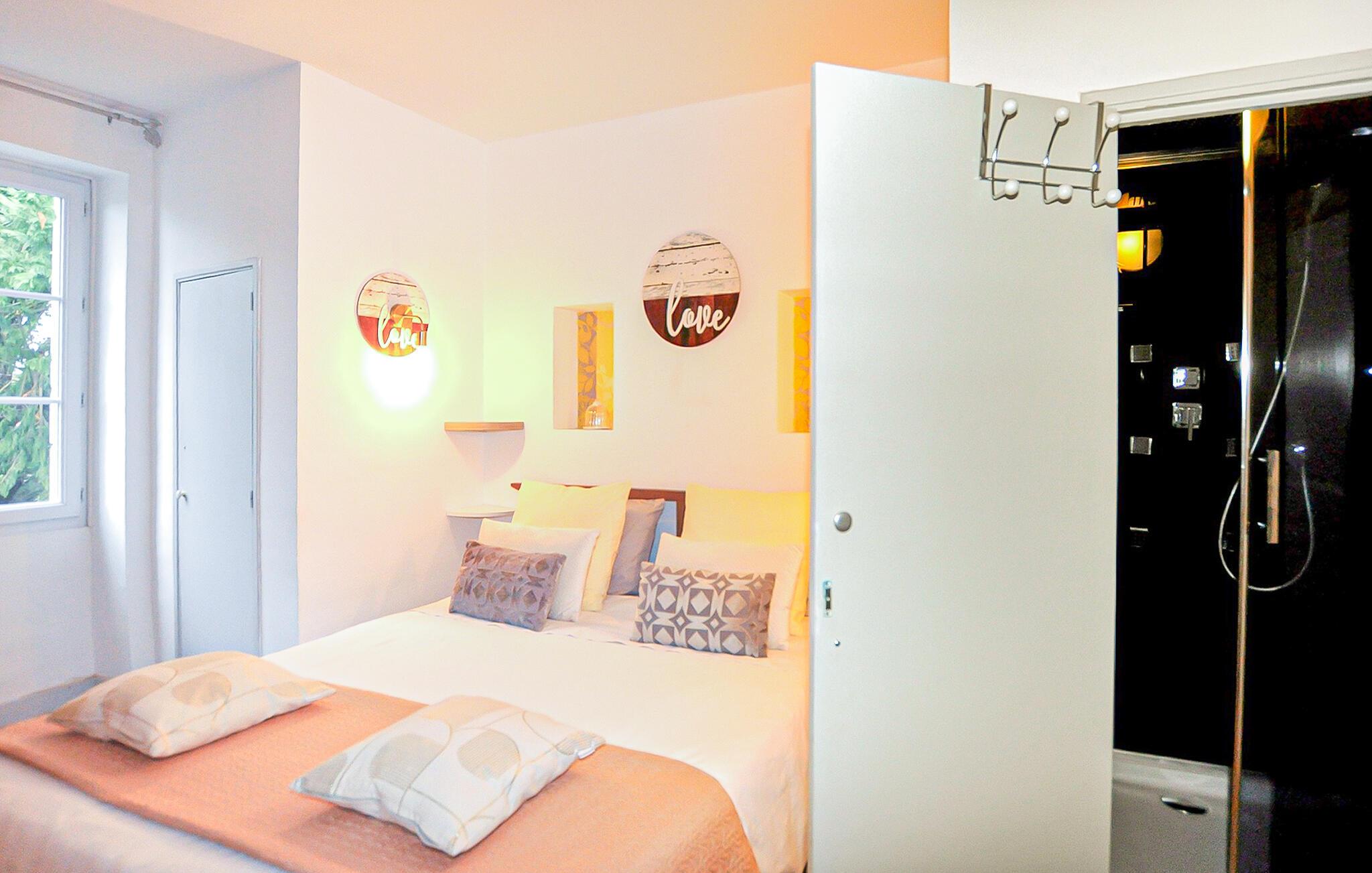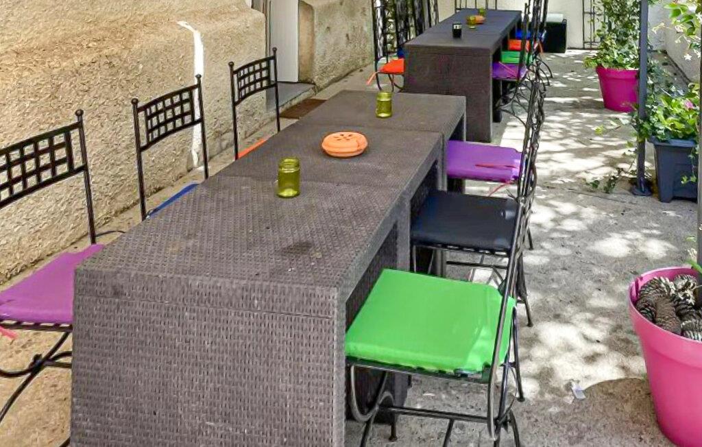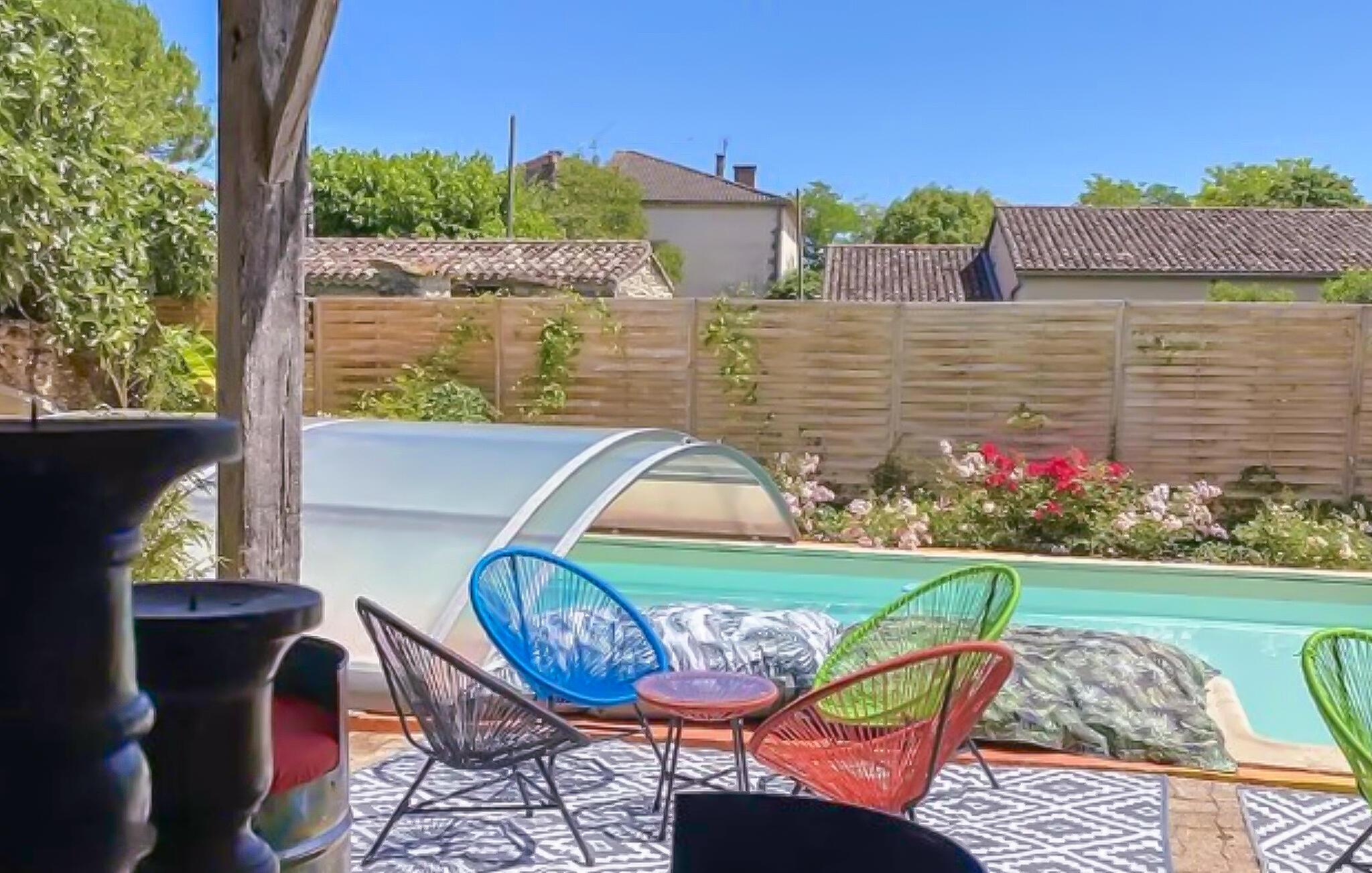 Svøm i den private pool, omgivet af en terrasse og komfortable siddepladser. Bagefter kan I slappe af i spabadet og sætte hverdagen på pause. Sid under skyggefulde træer ved det lange havebord, tilbring rolige timer i de farverige havestole ved poolen eller slap af i det hyggelige, rustikke loungeområde.